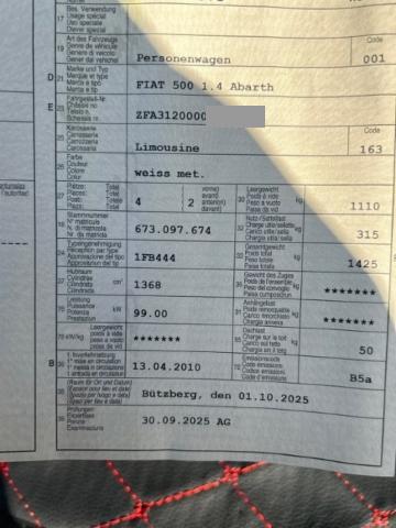 Serienaustattung Airbag Fahrer und Beifahrerseite Elektronische Wegfahrsperre Elektrische Fensterheber vorne Aussenspiegel elektrisch verstellbar und heizbar Bordcomputer Zentralverriegelung mit Fernbedienung Lenkrad verstellbar Abgedunkelte Seitenscheiben und Heckscheibe Tagesfahrlichtschaltung Isofix-Kindersitzbefestigung Leichtmetallräder 16″ Servolenkung elektrisch Pack Abarth Feuerschutz-System FPS (Fire Prev.System) Hintere Sitzbank geteilt abklappbar 50/50 ABS/ EBD Seitenairbags Nebelscheinwerfer vorne Follow-me-home Lichtfunktion Knieairbag Fahrer Radio/ CD/ MP3/ 4 Lautsprecher Höhenverstellbarer Fahrersitz Reifen-Pannenset Klimaanlage automatisch inkl. Pollenfilter Freisprechanl./ Bluetooth/ Sprachst./ Audiobed. am Lenkrad ESP/ ASR/ Hill Holder/ Bremsassistent Bremszangen rot lackiert Kopfairbags Sportlederlenkrad mit Audiobedienung Beifahrersitz verstellbar mit Memory Keine Gewähr auf die Angaben der Serienausstattungen Beifahrersitz mit mechanischem Positionsspeicher |