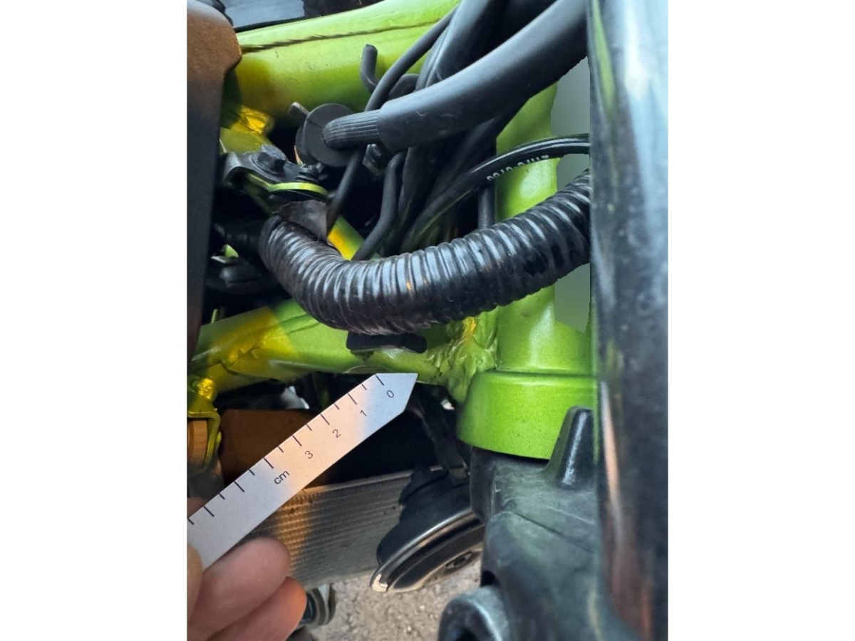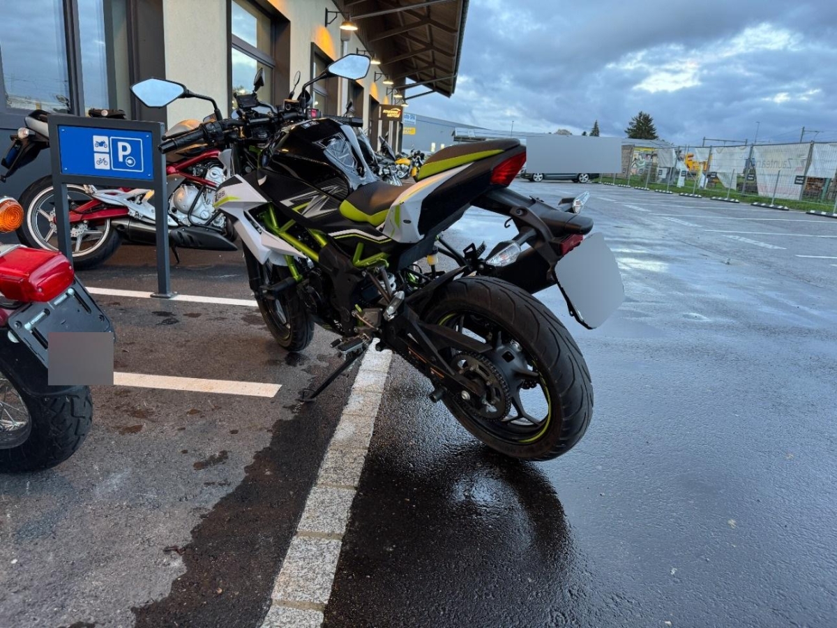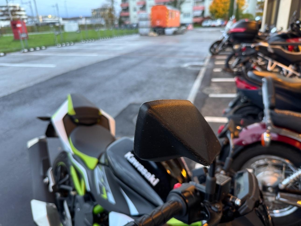 Armaturen, Auspufftopf, Aussenspiegel rechts, Front, Fussraster links, Fussraster rechts, Gabelholm, Griff links, Griff rechts, Kühler, Lenkanschlag, Lenker, Rad vorne, Rahmen, Scheinwerfer, Schutzblech vorne, Tank, Verschalungen hinten, Verschalungen links, Verschalungen vorne