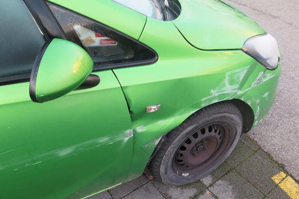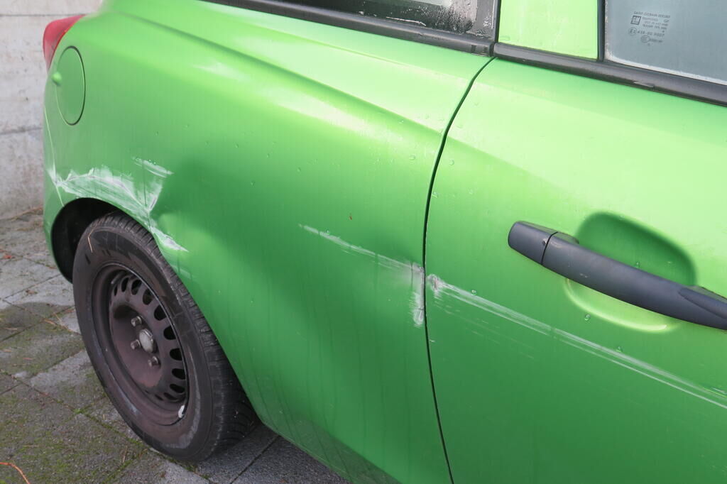 Pare-chocs avant refoulé et cassé, phare droit cassé, aile avant droite enfoncée, porte passager endommagée, aile arrière droite enfoncée, pare-chocs arrière endommagé.