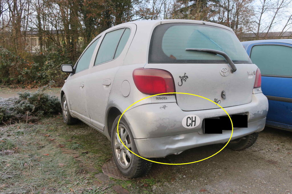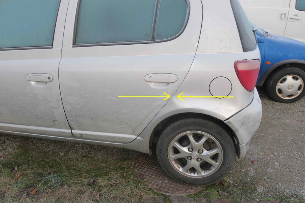 Heckschaden Mitte-links: Heckblech, Seitenwand links sind gestaucht.