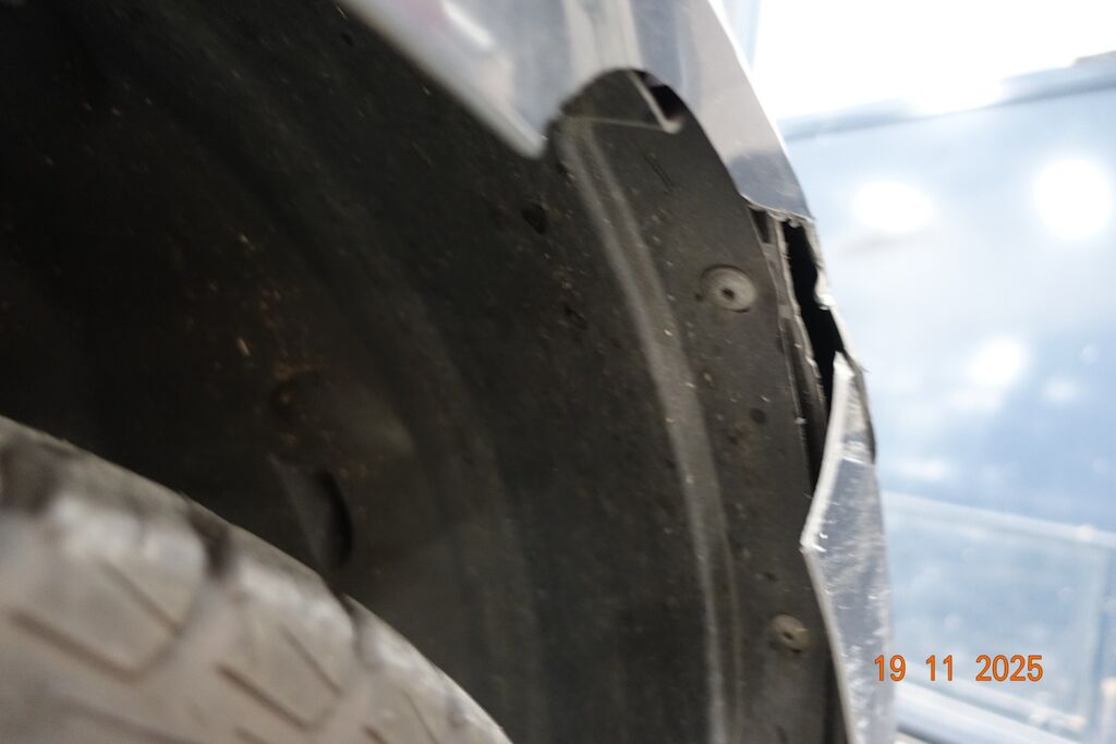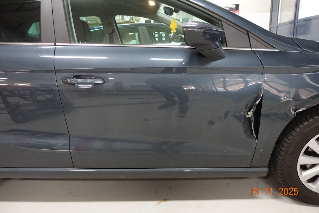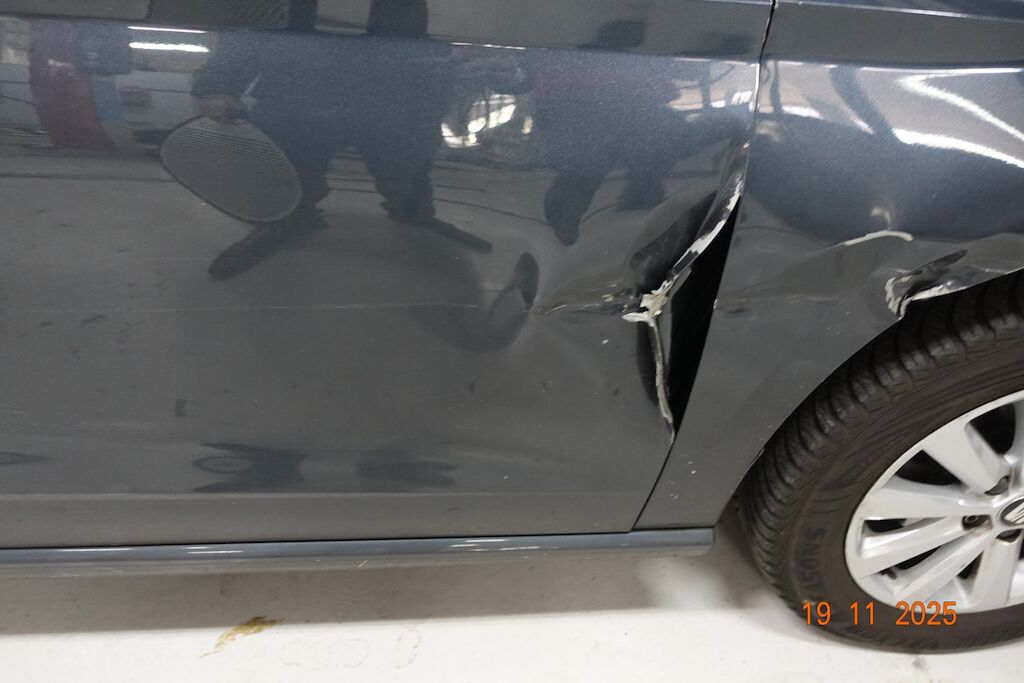 Die komplette rechte Fahrzeugseite ist eingedrückt. Die Stossstange VR ist gebrochen. Der Kotflügel sowie die Türe VR sind stark deformiert. Die Seitenwand sowie die Türe HR weisen eine Deformation auf. Der Aussenspiegel sowie die Stossstange HR sind zerkratzt.