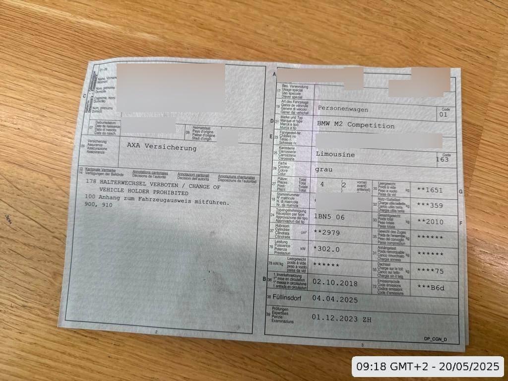 Lichtpaket, Zentralverriegelung mit Fernbedienung, Auto Start-/Stop-Anlage, Gurtkontrolle, ISOFIX Kindersitzvorrichtung, Window-Kopfairbags, Katalysator geregelt, Make up-Spiegel links, Assist: Dynamische Traktionskontrolle (DTC), Bordcomputer, Scheinwerfer-Waschanlage, Shadow Line glänzend, Bremsenergie-Rückgewinnung, Klimatisierungsautomatik, Elektrische Fensterheber vorne, Licht: Fernlicht-Assistent, Einstiegsschienen mit Logo, Cupholder vorne, AUX-Anschluss, Dekor: Interieurleisten schwarz hochglänzend mit Akzentleisten Perlglanz Chrom, Ablagenpaket, Start-/Stop-Knopf, Sitze: Sportsitze vorne, Lenkrad: Lenkrad längs- und höhenverstellbar, Licht: Adaptiver LED Scheinwerfer, BMW Mobility System, Assist: Tempomat mit Bremsfunktion, DAB+ (Digital Audio Broadcasting), Intelligenter Notruf, Park Distance Control vorne und hinten, BMW Individual Dachhimmel Anthrazit, Mittelkonsole mit Ablagefach, Airbag: Airbag Beifahrer deaktivierbar, Bremsassistent (BAS), Gangempfehlung, Diebstahlwarnanlage, Radio BMW Professional, Navigationssystem Professional, Elektrische Lenkung (EPS), Dynamische Stabilitätskontrolle (DSC), Kopfstützen hinten, Aussenspiegel rechts und links beheizbar und elektrisch verstellbar, Instrumentenkombination mit erweiterten Umfängen, Vordersitze heizbar, Lenkrad: Multifunktionslenkrad, Airbag: Airbag Fahrer und Beifahrer, LED Nebelscheinwerfer, Veloursfussmatten vorne und hinten, Innen- und Aussenspiegel automatisch abblendend, Innenraumbeleuchtung, Regensensor für Scheibenwischer vorne, Media: Freisprecheinrichtung mit USB Schnittstelle, Antiblockiersystem (ABS), Wärmeschutzverglasung, Airbag: Seitenairbag für Fahrer und Beifahrer, M Leichtmetallräder im Y-Speichen-Design 788,19J geschmiedet mit Mischbereifung, Real Time Traffic Information, Make up-Spiegel rechts, Media: Concierge Service, Abschliessbare Radschrauben, Armauflage vorne, verschiebbar, Reifenkontrollanzeige, M Dynamic Mode MDM, Komforttelefonie mit erweiterter Smartphone-Anbindung, Lackierung: Uni-Lackierung, ConnectedDrive Services, TeleService, Blinker in Aussenspiegel, M-Lederlenkrad, Steckdose 12V, M Sicherheitsgurte, Getriebe: 6-Gang-Getriebe, Ausführung 4 Sitzplätze (2+2), Telefonie mit Wireless Charging, Remote Services, Leder-Ausstattung ‘Dakota’ inkl. Sitzheizung