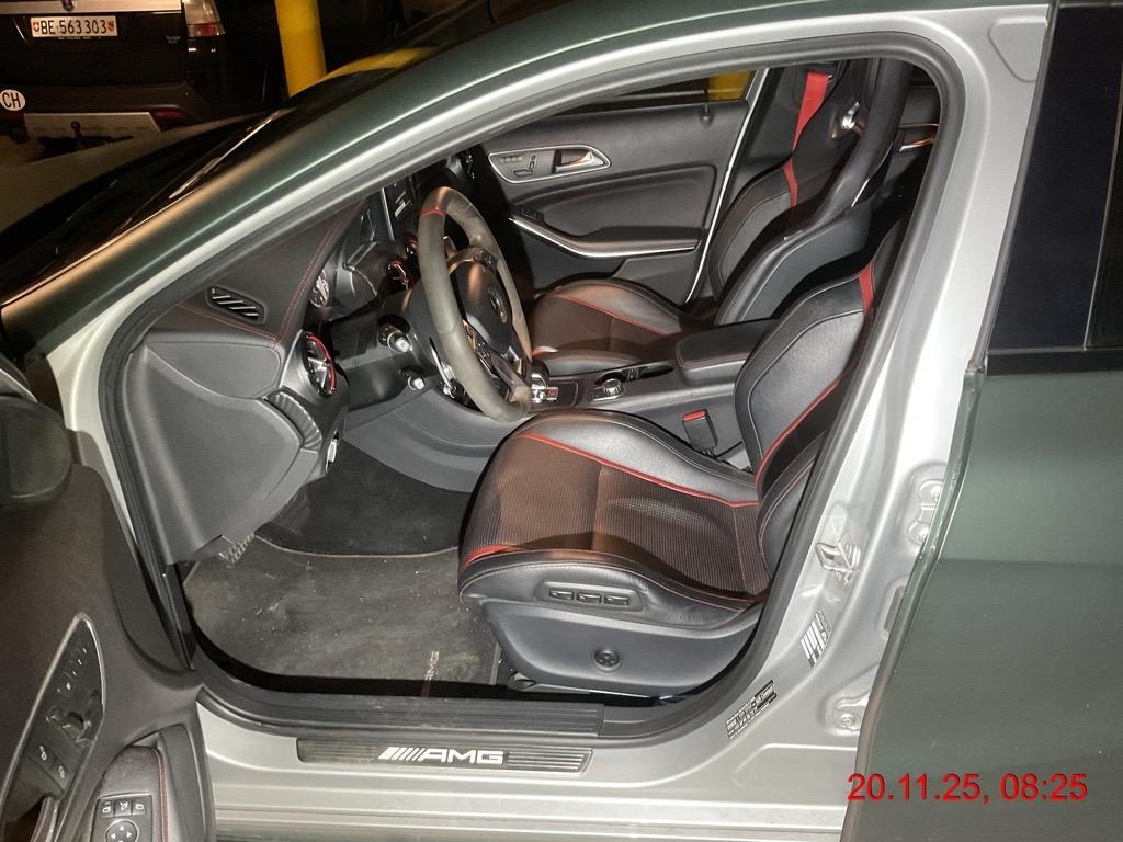Multifunktionsanzeige, Crash-Sensor, Elektronisches Stabilitäts-Programm (ESP), Höhenverstellbare Gurten vorne, AMG Sport-Abgasanlage mit zwei verchromten Endrohrblenden, Dekor:designo Sicherheitsgurte, farbig, AMG Kühlergrill, Reifendruckverlust-Warnsystem, Sitze:Gurtstraffer vorne, Assist: ATTENTION ASSIST (Aufmerksamkeitsassistent), Antriebsschlupfregelung (ASR), Allradantrieb permanent, Bremsassistent (BAS), Reifenreparatur-Set (Tire Fit), Frontscheibe Verbundglas, Katalysator geregelt, Kindersicherung an den hinteren Türen, Befestigungsösen im Laderaum, Lackierung: Uni-Lackierung, Dekor: Zierelemente Carbonoptik, 12-Volt-Steckdose hinten, Bremsscheiben vorne gelocht, Wegfahrsperre elektronisch, Dekor: Bordkantenzierstab in Chrom, Dekor: Dachhimmel schwarz, Elektrische Fensterheber vorne + hinten, Licht: LED Blinker im Aussenspiegel, Nichtraucherausführung, Heckscheibenheizung, Antiblockiersystem (ABS), Licht:Adaptives Bremslicht, Controller auf Mittelkonsole, Wartungsintervall-Anzeige, 7-Stufen-Automat AMG SPEEDSHIFT DCT, Bi-Xenon-Scheinwerfer inkl. Reinigungsanlage, Fahrwerk:AMG Sport-Parameterlenkung, Make up-Spiegel rechts, Heckscheibenwischer, Drittes Bremslicht LED, Fahrwerk:AMG Hochleistungs-Bremsanlage, AMG Kombiinstrument, Paket: AMG Styling-Paket, Assist:COLLISION PREVENTION ASSIST (Kollisionswarnung), Reiserechner, Airbag: Window-Kopfairbags, Türgriffe aussen in Wagenfarbe, Audio 20 Radio CD/MP3 mit Farbdisplay, Bluetooth-Schnittstelle mit Freisprech- funktion, Aux-in-Anschluss und Telefon- tastatur, Polster:Polsterung Ledernachbildung ARTICO / Microfaser DINAMICA, Fahrwerk:AMG Sportfahrwerk, Zentralverriegelung mit Fernbedienung und automatischer Türverriegelung, Scheibenwischer vorne mit Intervall, AMG DRIVE UNIT, Interieur mit roten Kontrastziernähten, Klimaanlage manuell, mit Pollenfilter, Sportpedalanlage, Make up-Spiegel links, Armauflage vorne, verschiebbar, Assist: Tempomat mit variabler Geschwindigkeitsbegrenzung SPEEDTRONIC, Aussenspiegel in Wagenfarbe, Aussentemperaturanzeige, Kontrollanzeige für Lampenausfall, AMG Leichtmetallräder 5-Doppelspeichen- Design 18J, Ablagen in den Türen, Bremsbelagverschleiss, AMG Veloursfussmatten, Stossstangen in Wagenfarbe, Licht: Nebelschlussleuchte, Lenkrad:Multifunktions-Sportlenkrad in Leder,unten abgeflacht, AMG Einstiegleisten, Beleuchtetes Handschuhfach, Sitze: 3-Punkt-Sicherheitsgurte auf allen Plätzen, Dekor:Türmittelfelder in Mikrofaser DINAMICA, Airbag: Knie-Airbag für Fahrer, Geräusch- und Wärmeschutzverglasung, Airbag: Airbag Fahrer und Beifahrer, Airbag: Seitenairbag für Fahrer und Beifahrer, Steckdose 12-Volt- vorne, Lenkrad längs- und höhenverstellbar, USB-Anschluss, Tagfahrlicht, Licht: Fahrlichtassistent (automatisches Fahrlicht), Fahrersitz höhenverstellbar, Sitze:Sitzkomfort-Paket, Assist:ADAPTIVE BRAKE mit HOLD-Funktion und Berganfahrhilfe, Sitze: Rücksitzlehne geteilt abklappbar, Crashaktive Notbeleuchtung, Gurtkontrolle