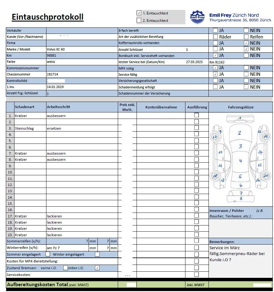 | Keine Gewähr auf die Angaben der Sonder- und Serienausstattung / keine mechanische Prüfung. Fahrzeug wurde unzerlegt expertisiert / keine Haftung für allfällige, nach Demontage bekanntwerdenden Mängel. Fahrzeugbereifung und Ausstattung gemäss Fotos / Fahrzeugkauf auf eigenes Risiko ab Platz ohne Nachwährschaft. DPF/FAP Filter nicht kontrolliert. Keine technische Prüfung (Werkstatttest) vorgenommen. Fahrzeug ab Platz, ohne Garantie und Aufbereitung. – Diverse Kratzer und Dellen am gesamten Fahrzeug – Alle vier Felgen verkratzt – Steinschlag in der Frontscheibe – muss ersetzt werden – Service im März fällig – Letzter Service 27.03.2025 bei 91’126 KM |