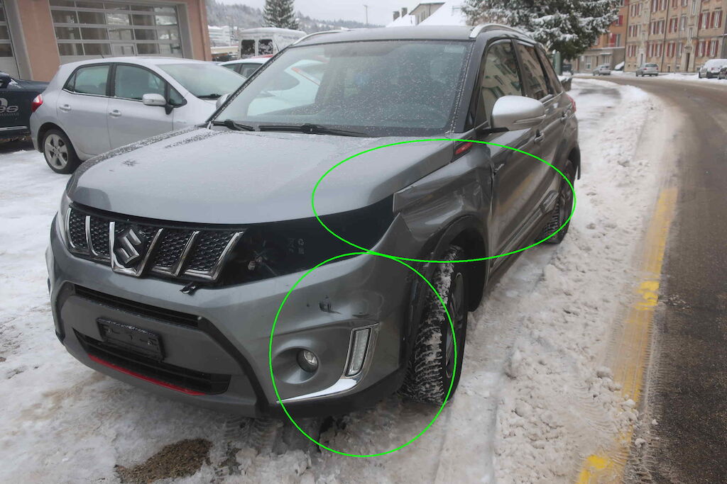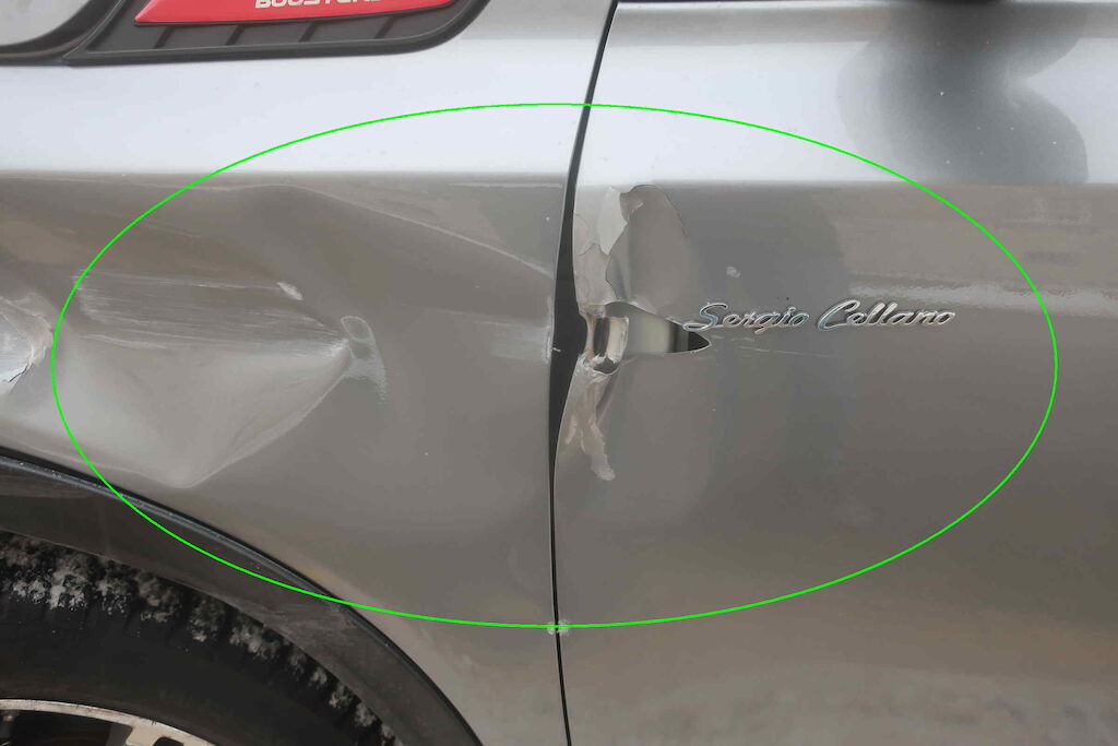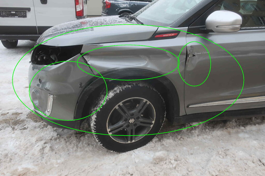 Pare-chocs avant agauche cassé, pahre gauche,. aile et porte avant gauche droieeé et déchiré, Aile arrière gauche enfoncé.