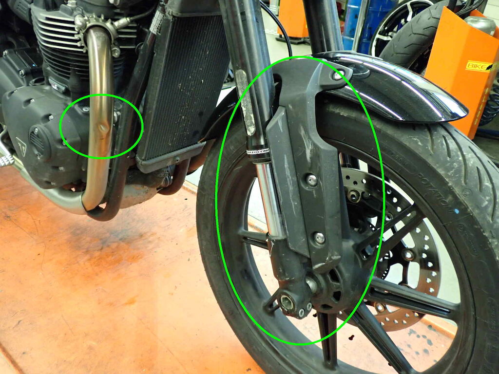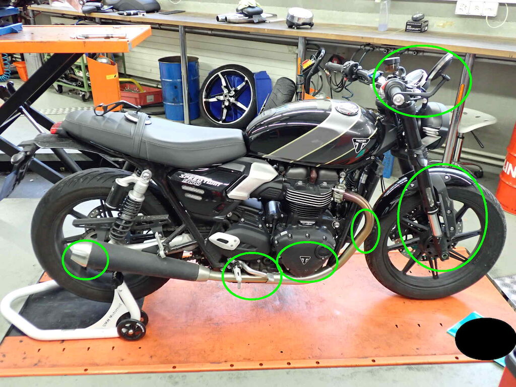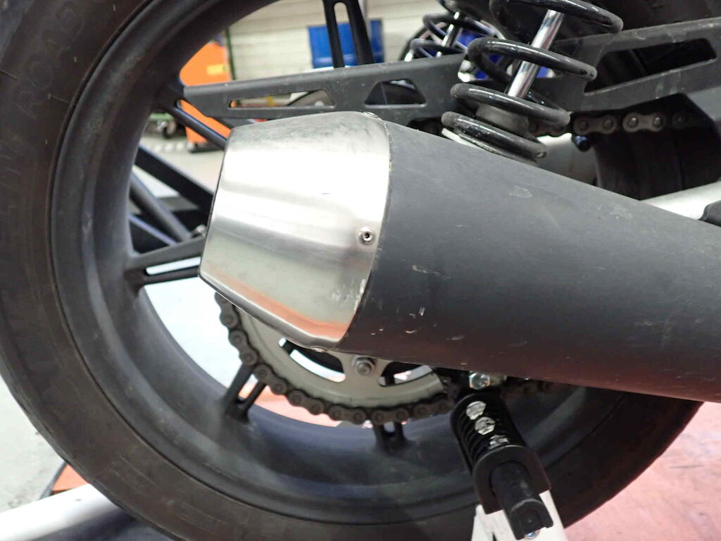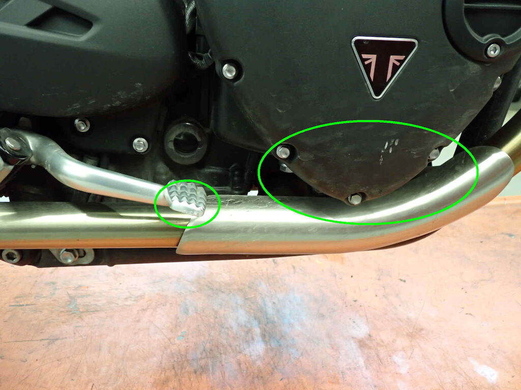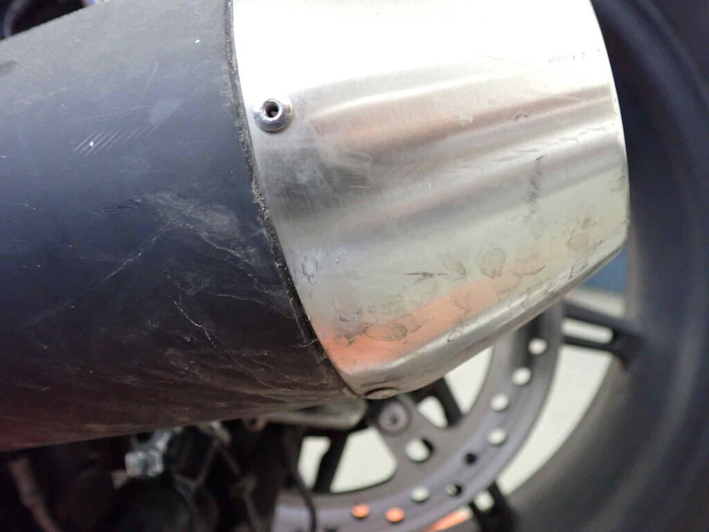 Speiegel, Bremshebel vorne und hinten, Lenker, Fussraster, Motordeckel, Auspuffkrümmer und Endschalldämpfer, Gabelholm rechts