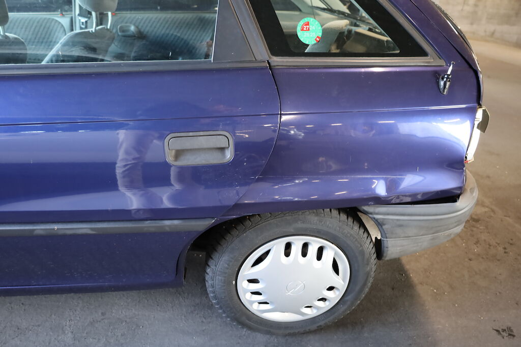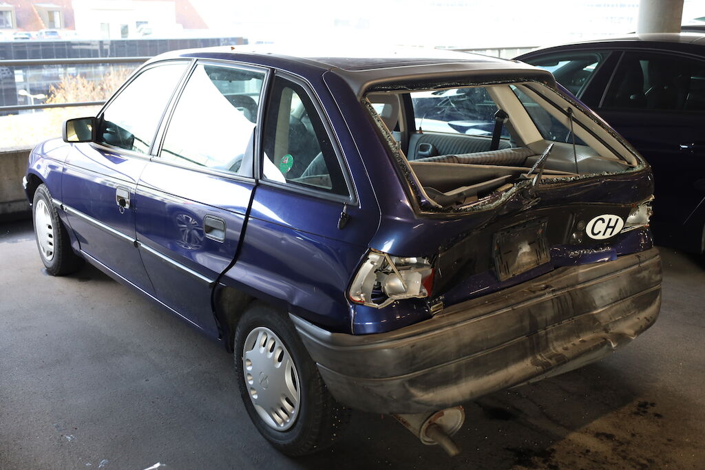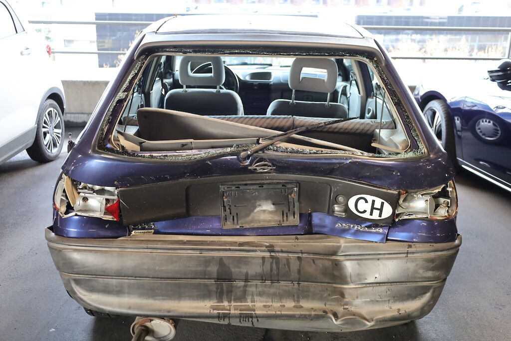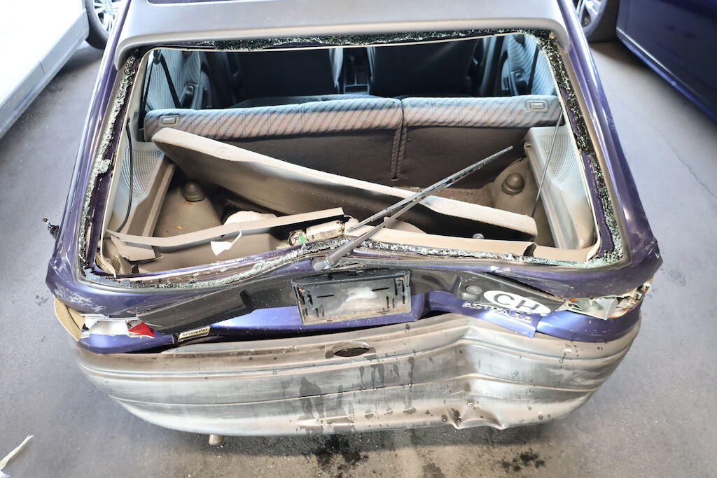 Heckaufprall mit Deformation von Heckklappe, Heckscheibe, Stossfänger, Heckblech, Seitenwand links und rechts sowie Schlussleuchten. Die Karosserie wurde bis in den Bereich der B-Säule gestaucht.