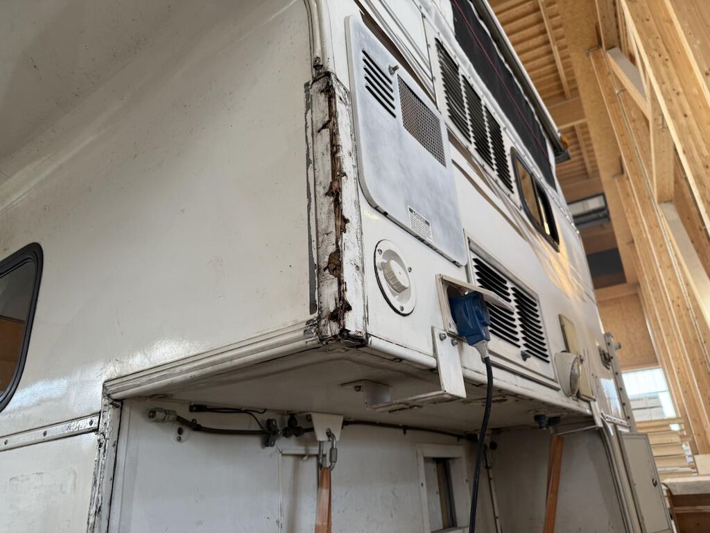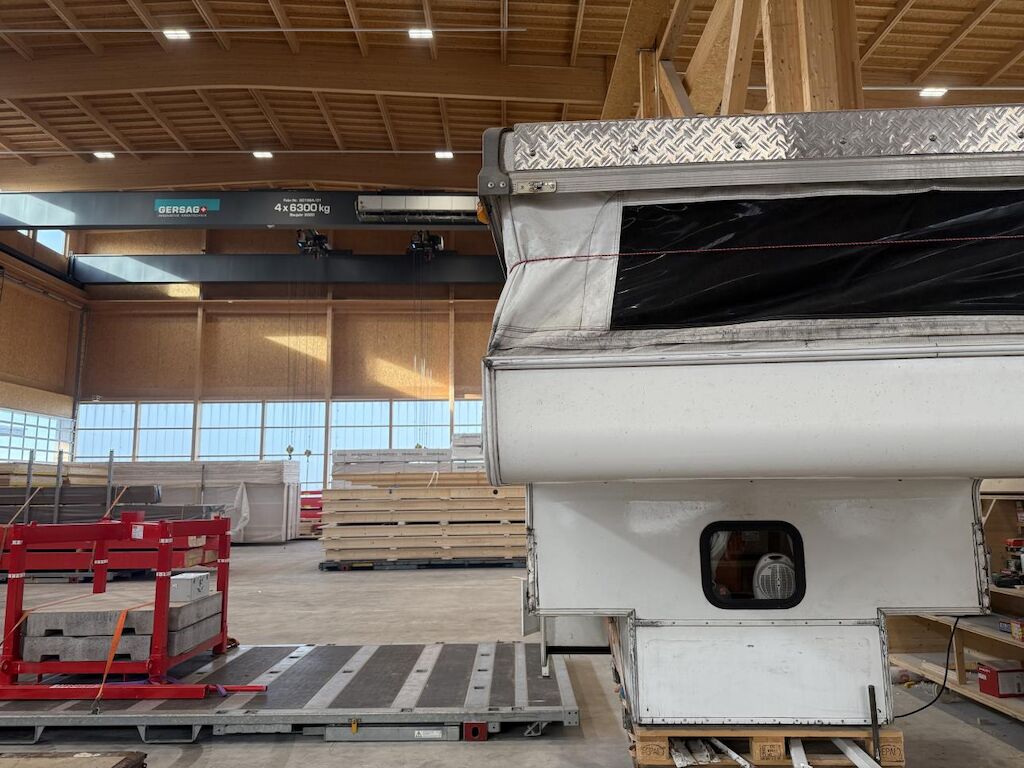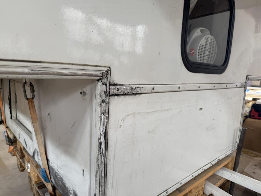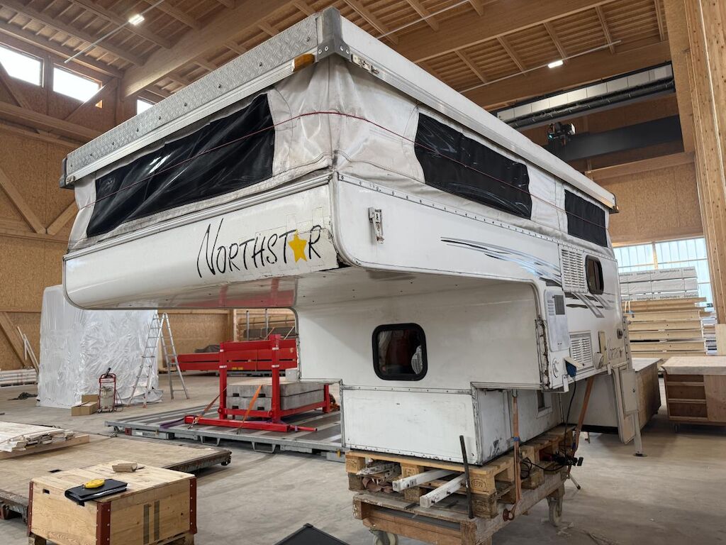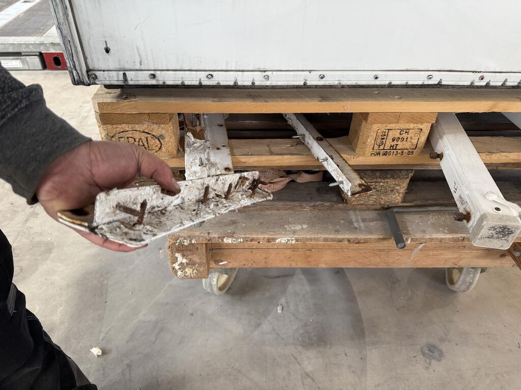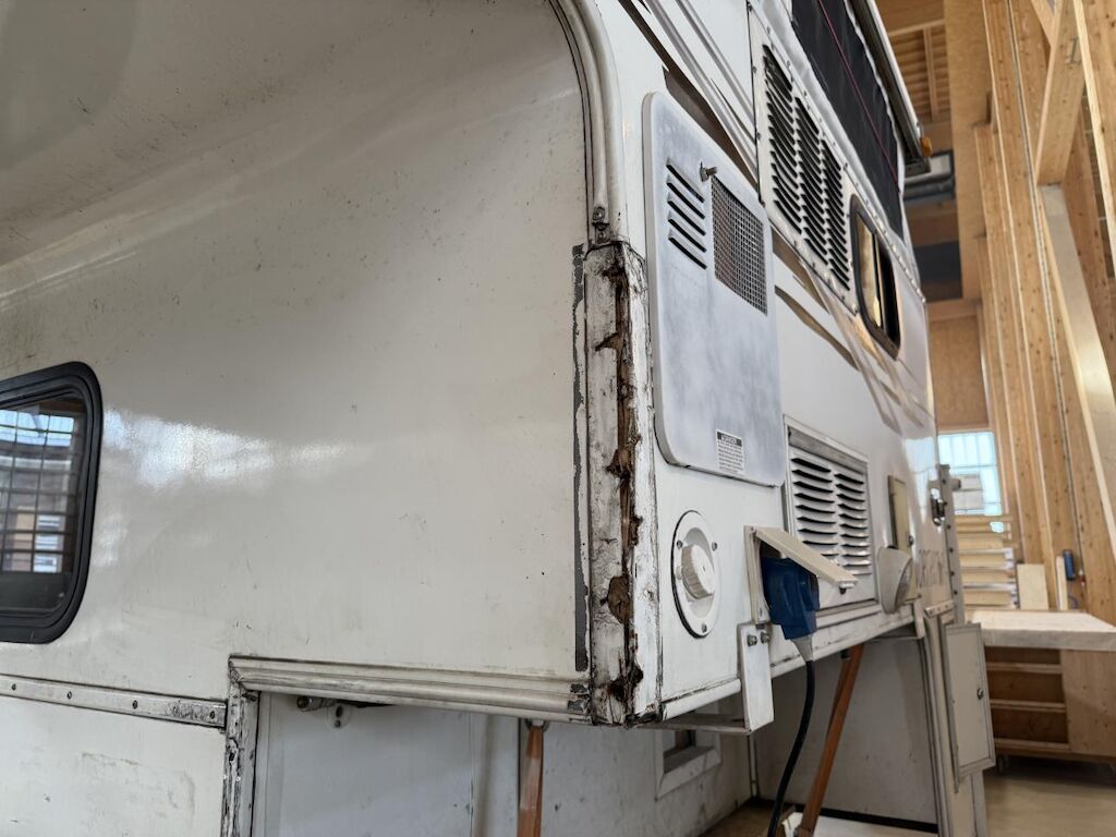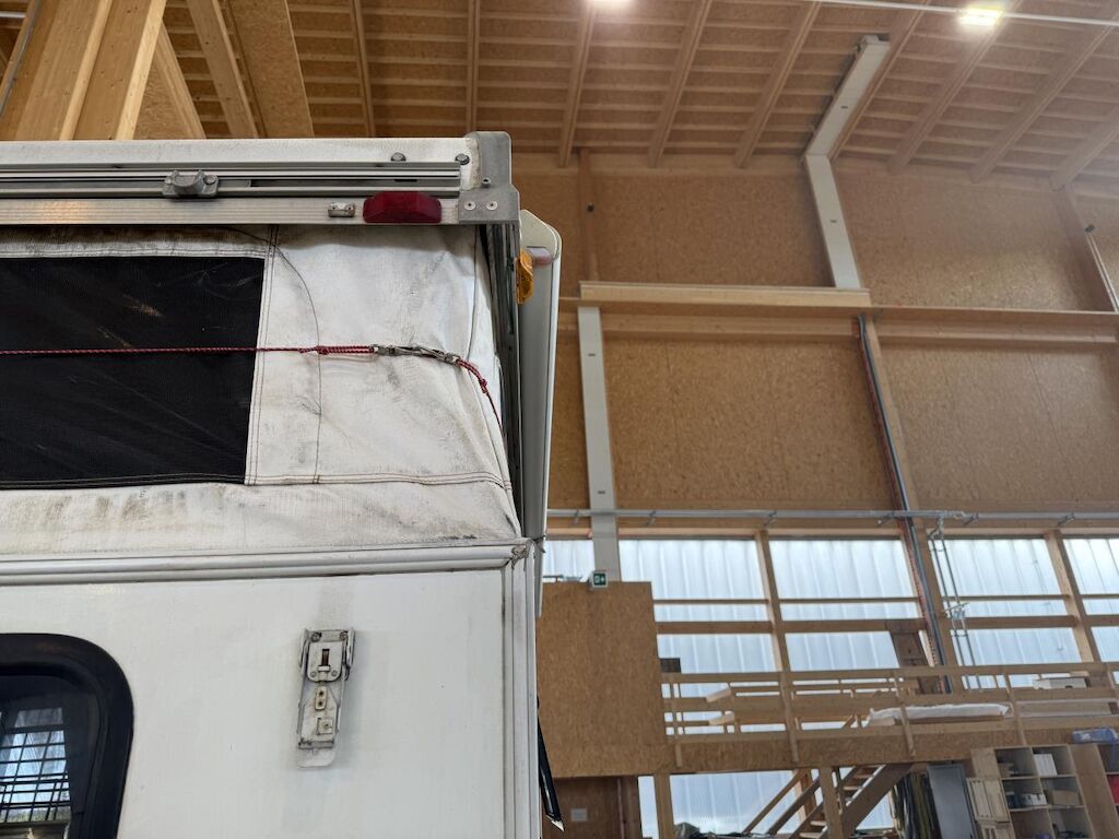 dabei wurde der Frontaufbau, das Gestänge des Daches, die Seitenwand links und rechts im Breich der Stützen, der Unterboden sowie diverse Anbauteile beschädigt. Aufbau verschoben / schräg.