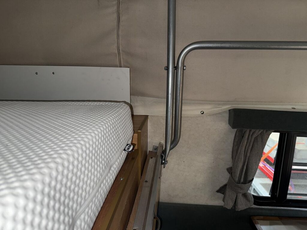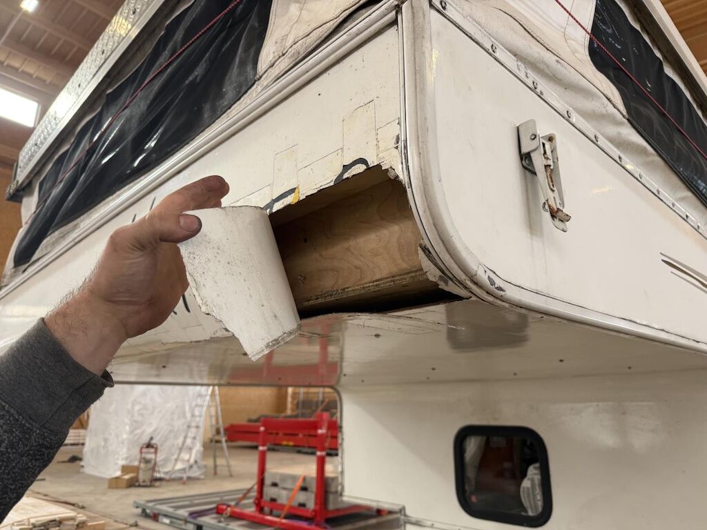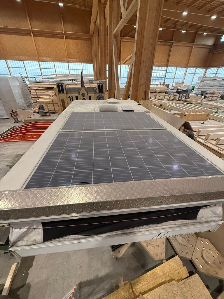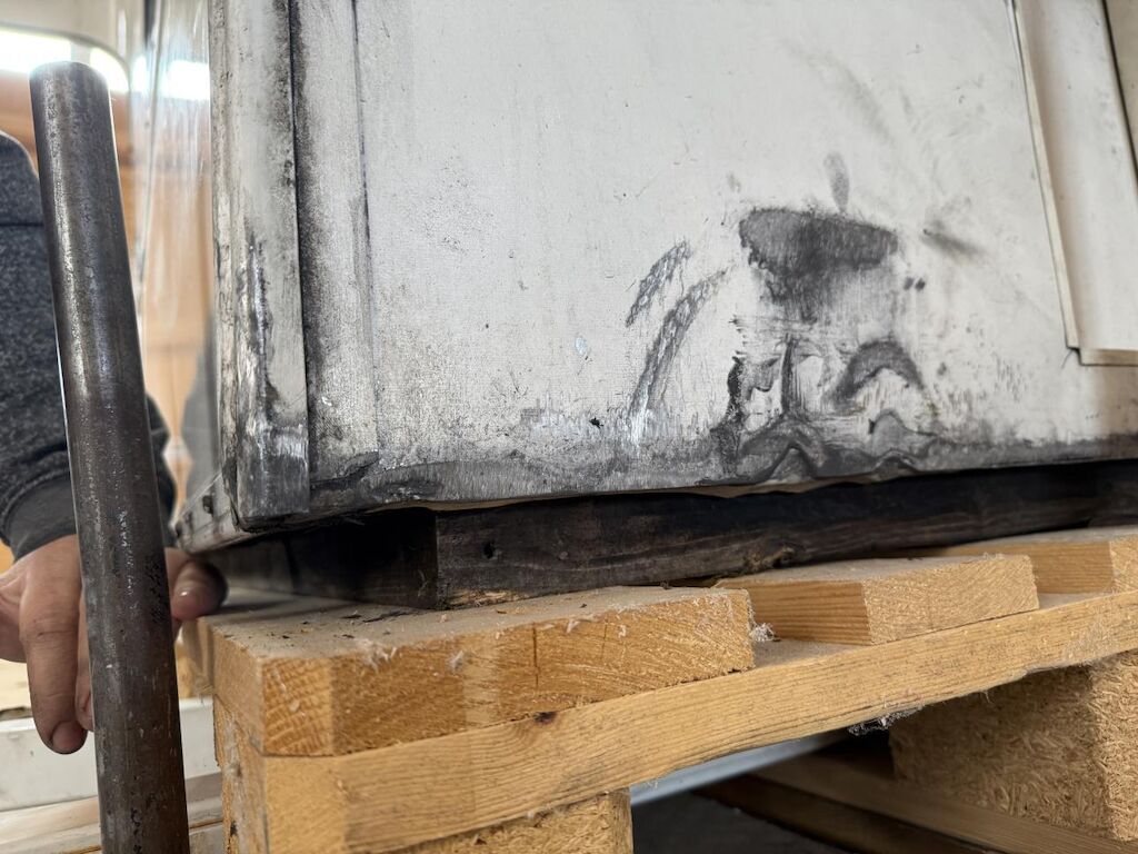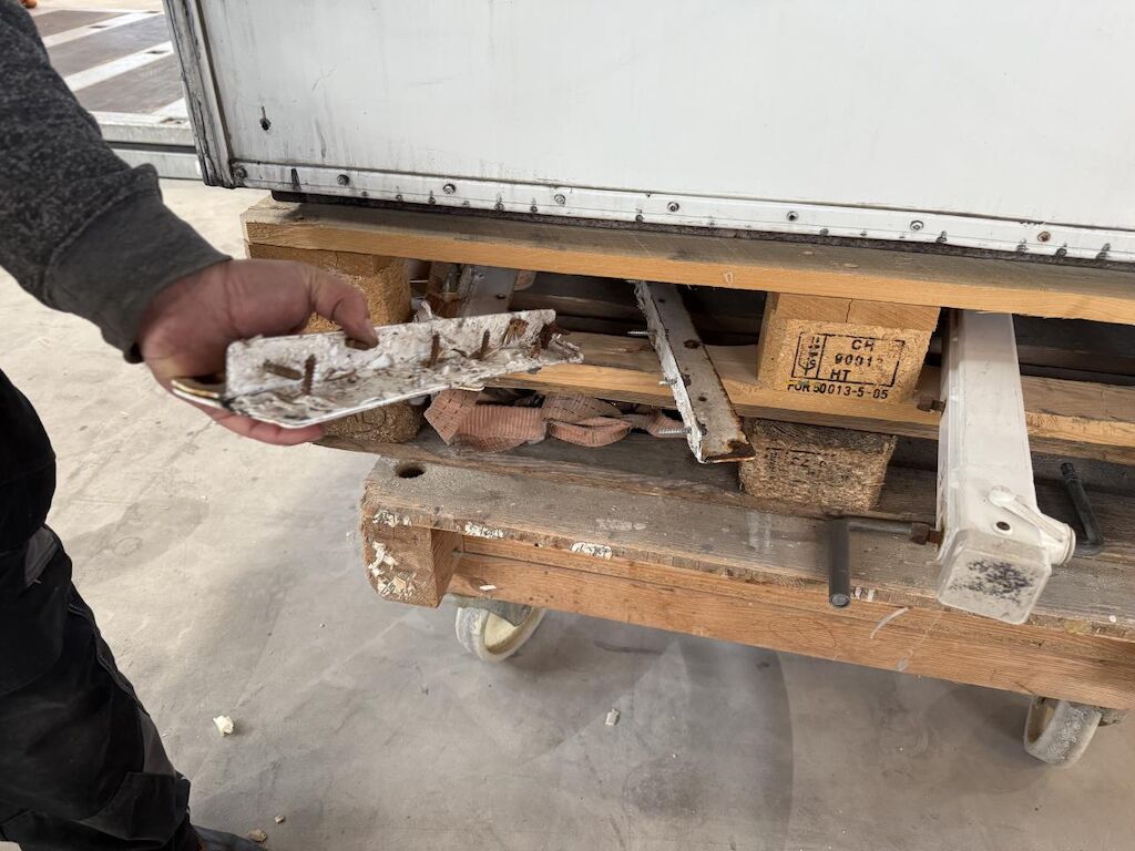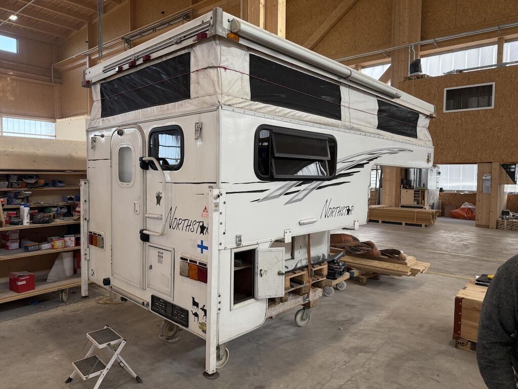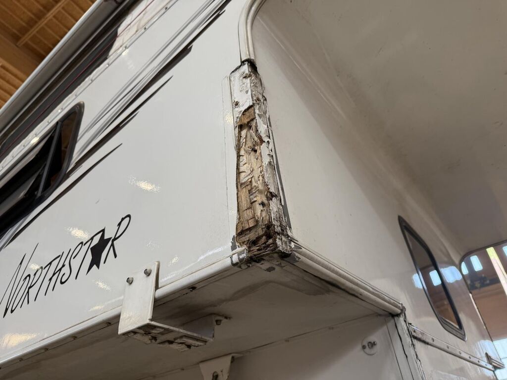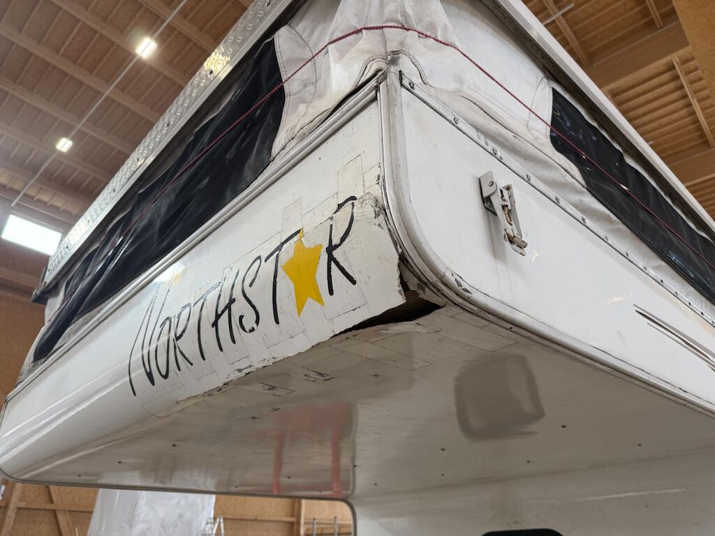 dabei wurde der Frontaufbau, das Gestänge des Daches, die Seitenwand links und rechts im Breich der Stützen, der Unterboden sowie diverse Anbauteile beschädigt. Aufbau verschoben / schräg.