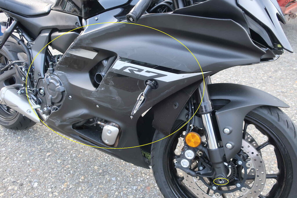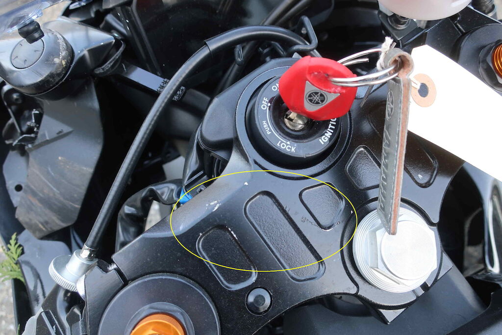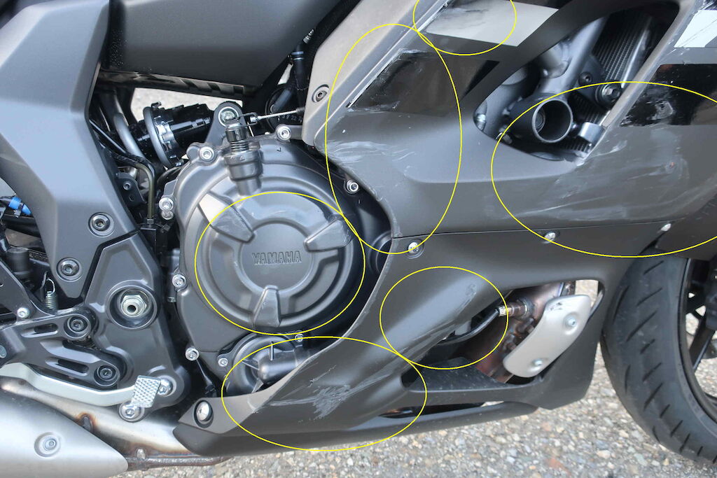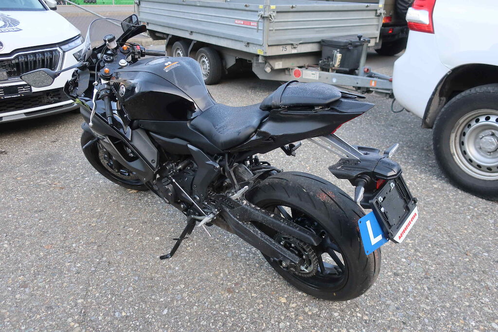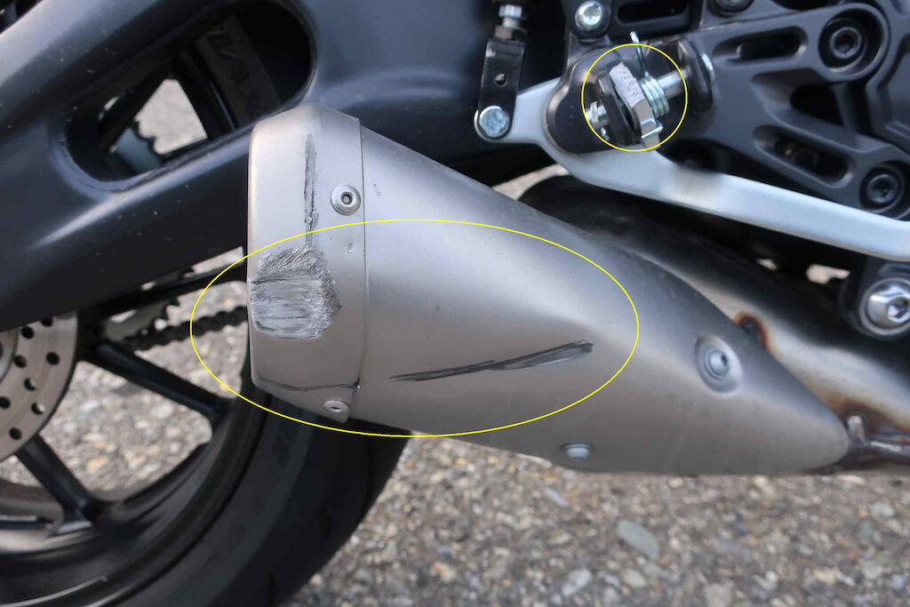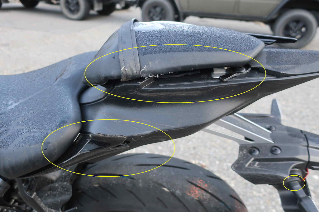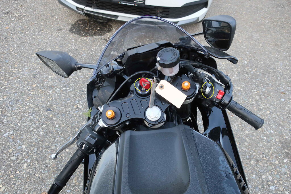 Beschädigung: Front & Seitenverschalungen, Lenker, Spiegel, Gabelfüsse & Gabelbrücke, Windshield, Tacho, Bremshebel & Gaszug, Fussraste re., Auspuff, Druckstelle Schwinge, Sattel hi., Verschalung & Blinker hi. li., Tankverschalung li., Zündschlüssel verbogen
