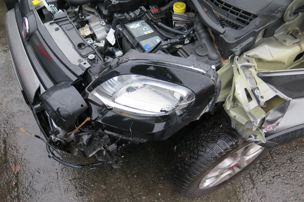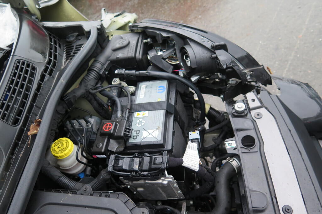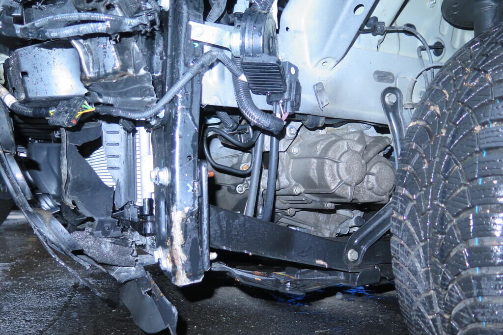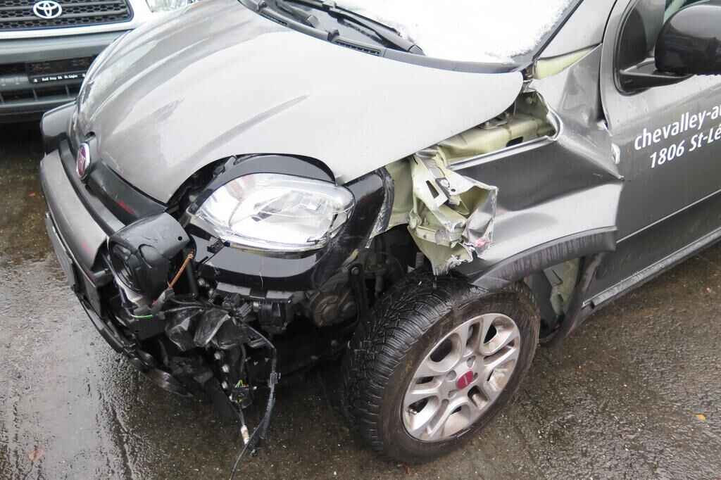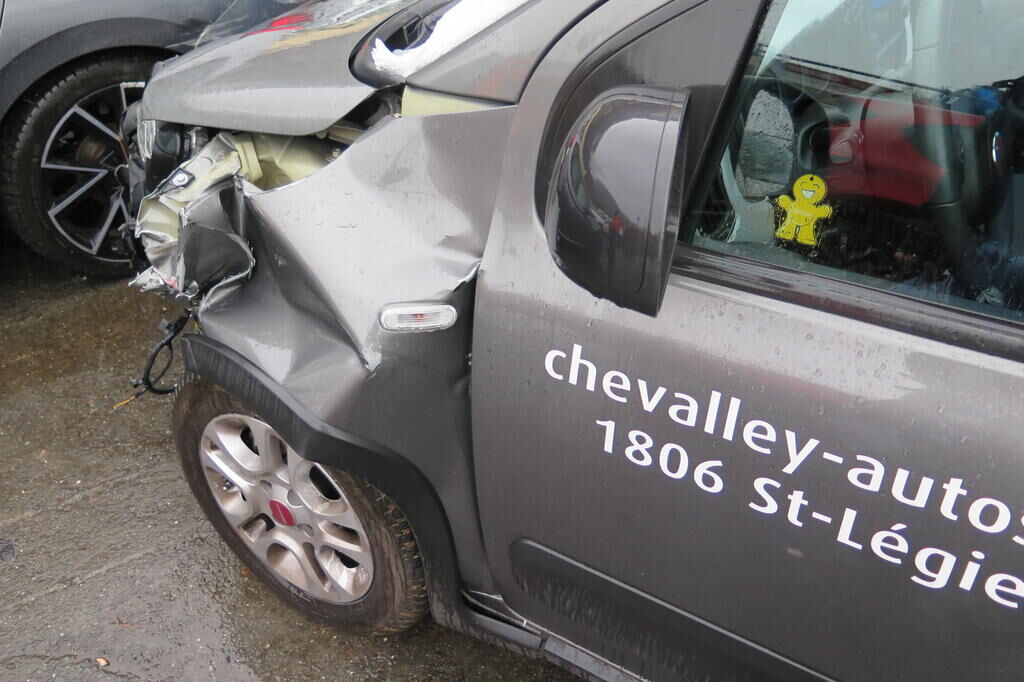Pare-chocs avant enfoncé et cassé, éclairage gauche cassé, capot moteur enfoncé, aile avant gauche enfoncée, tôle frontale enfoncée, radiateurs endommagés, joue d’aile gauche enfoncée, risque train avant faussé, divers garnissages et accessoires cassés.