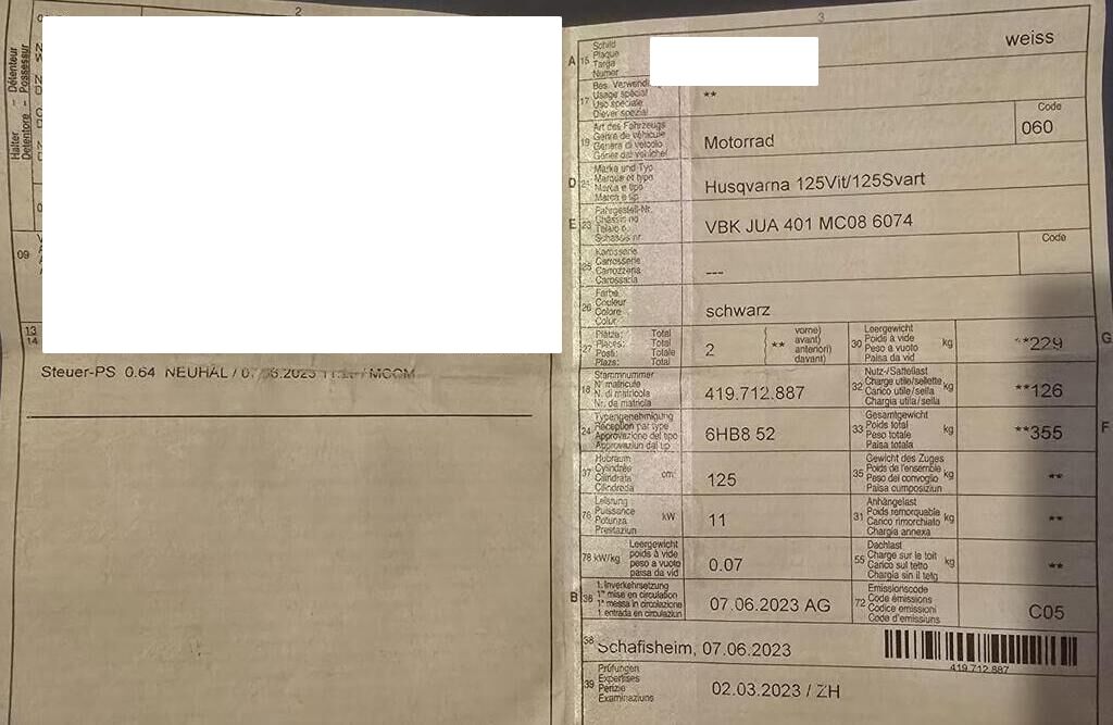 | Tipo veicolo / Costruzione / Porte | Motoveicolo / / 0 |