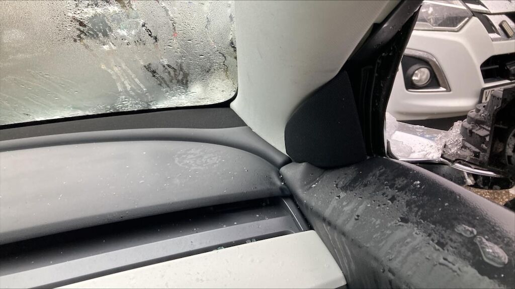 Flanc droite: capot, phare, aile, doublure de l’aile, porte, montant A, porte avant, retro, vitre, tableau de bord, porte arrière enfoncés, cassés.