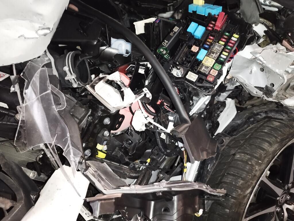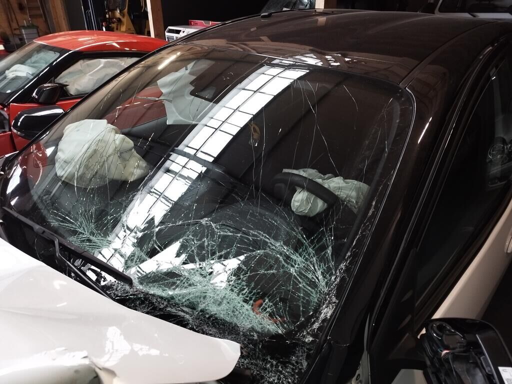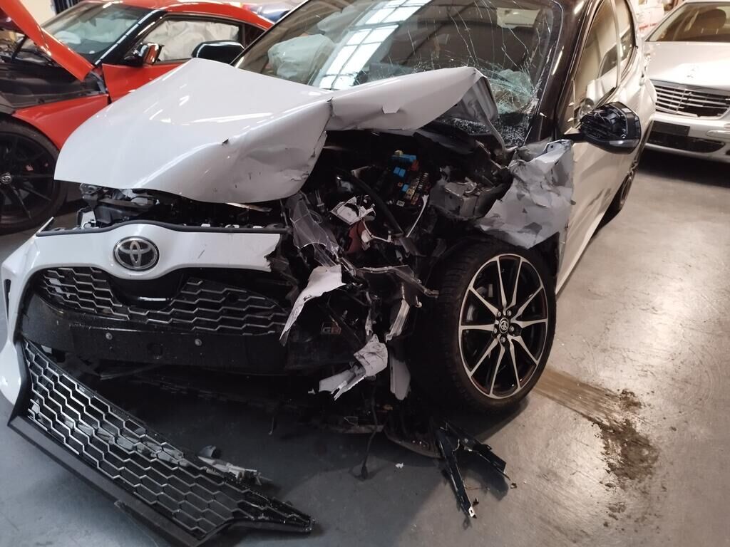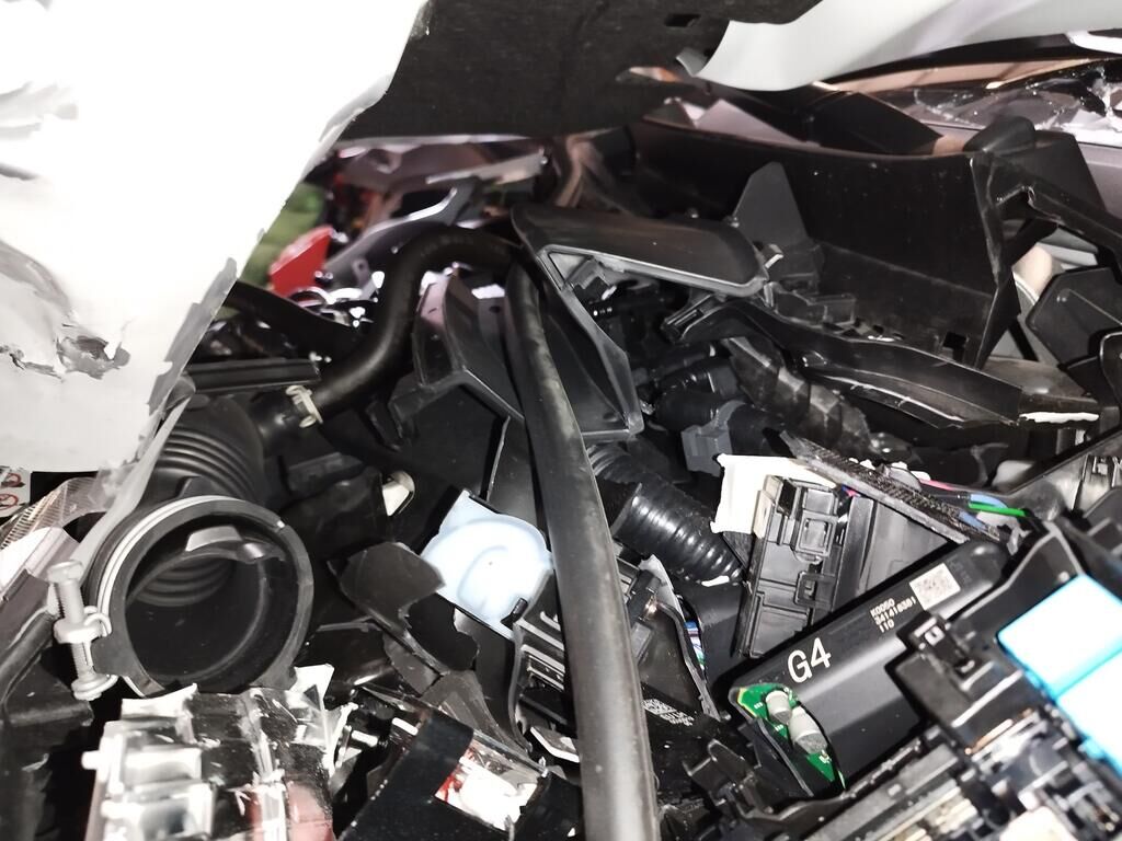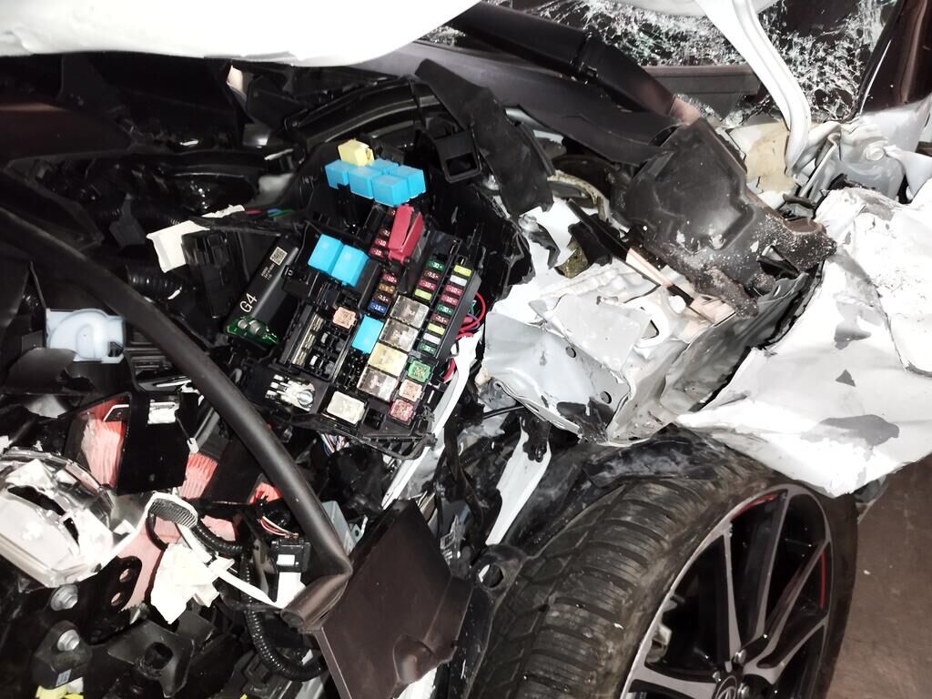 Die ganze Front links ist deformiert, diverse Teile abgerissen, Verkabelungen abgerissen, Sicherungskasten ausgerissen, Aufhängung vorne links abgerissen, die Frontscheibe ist gerissen, Fahrer-Beifahrer sowie beide Kopfairbags sind ausgelöst, alle Gurtstraffer sind ausgelöst, die Stossstange hinten rechts ist deformiert, die Heckleuchte rechts ist gerissen.