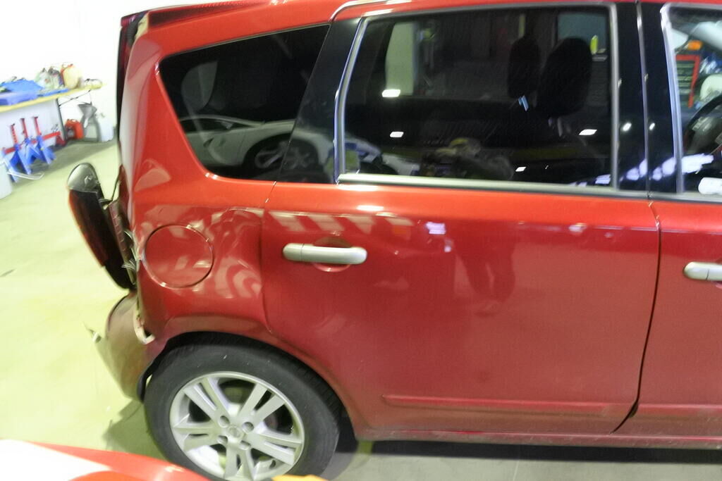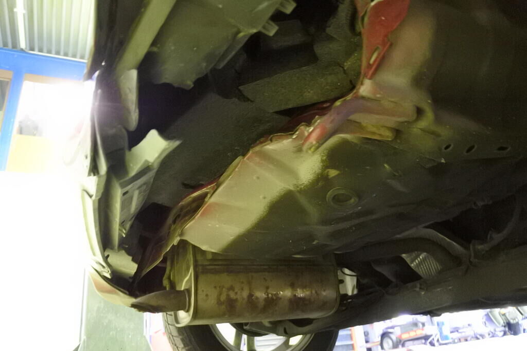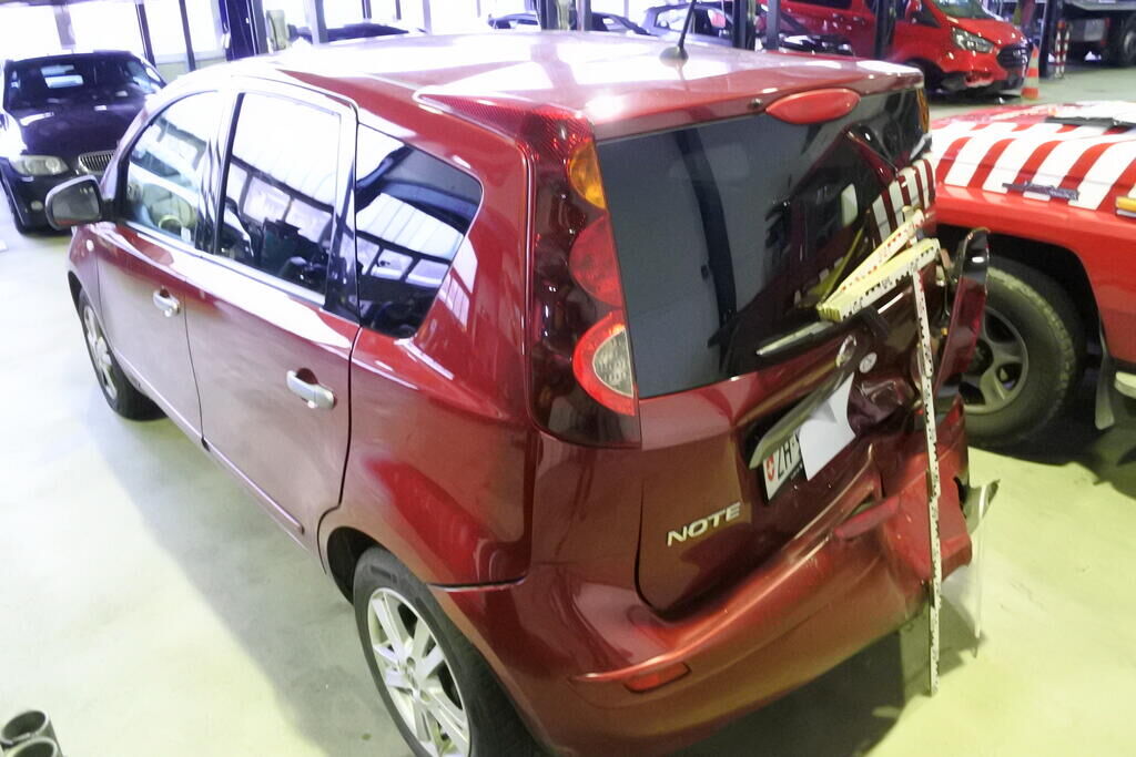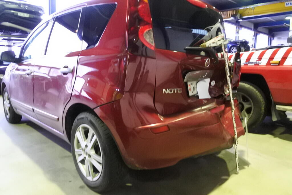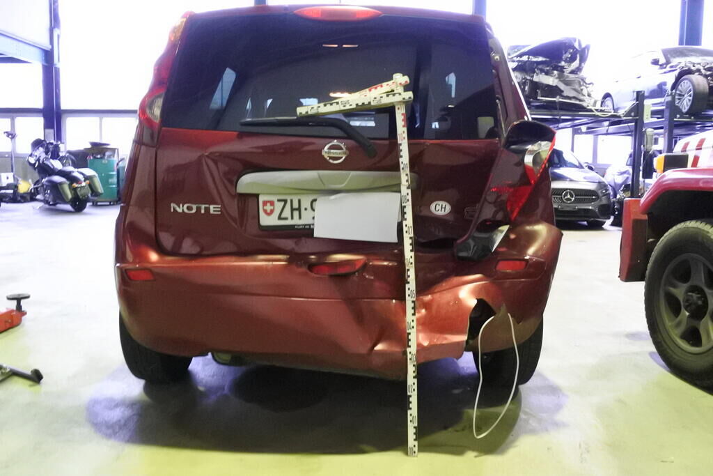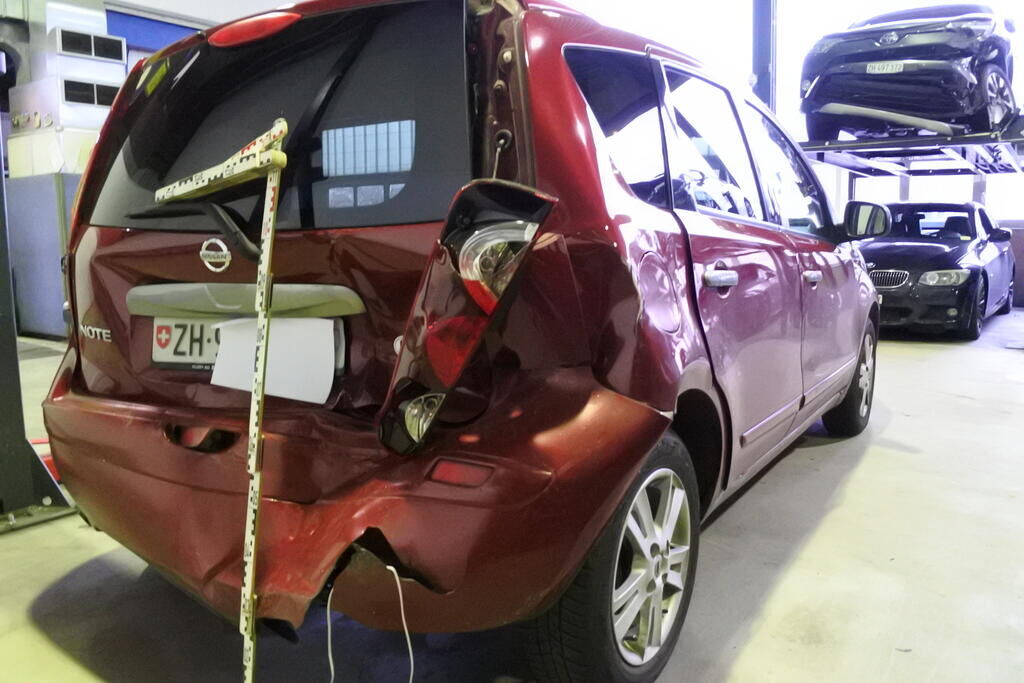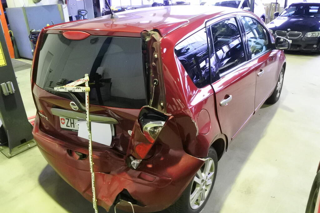 Die Stossstange mit Verstärkung, die Heckklappe, das Heckblech aussen und innen, der Kofferboden sowie die Reserveradmulde sind eingedrückt. Die Seitenwand sowie das Radhaus rechts sind verformt. Die Rückleuchte ist zerborsten. Der Auspuff ist verformt. Verschiedene Anbauteile im direkten Deformationsbereich sind beschädigt.
