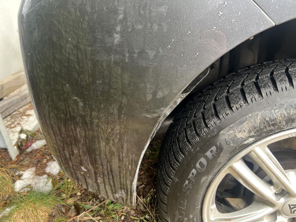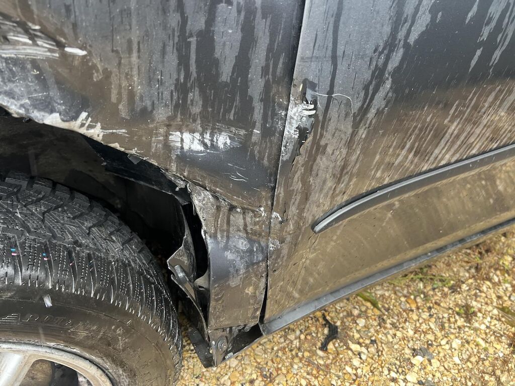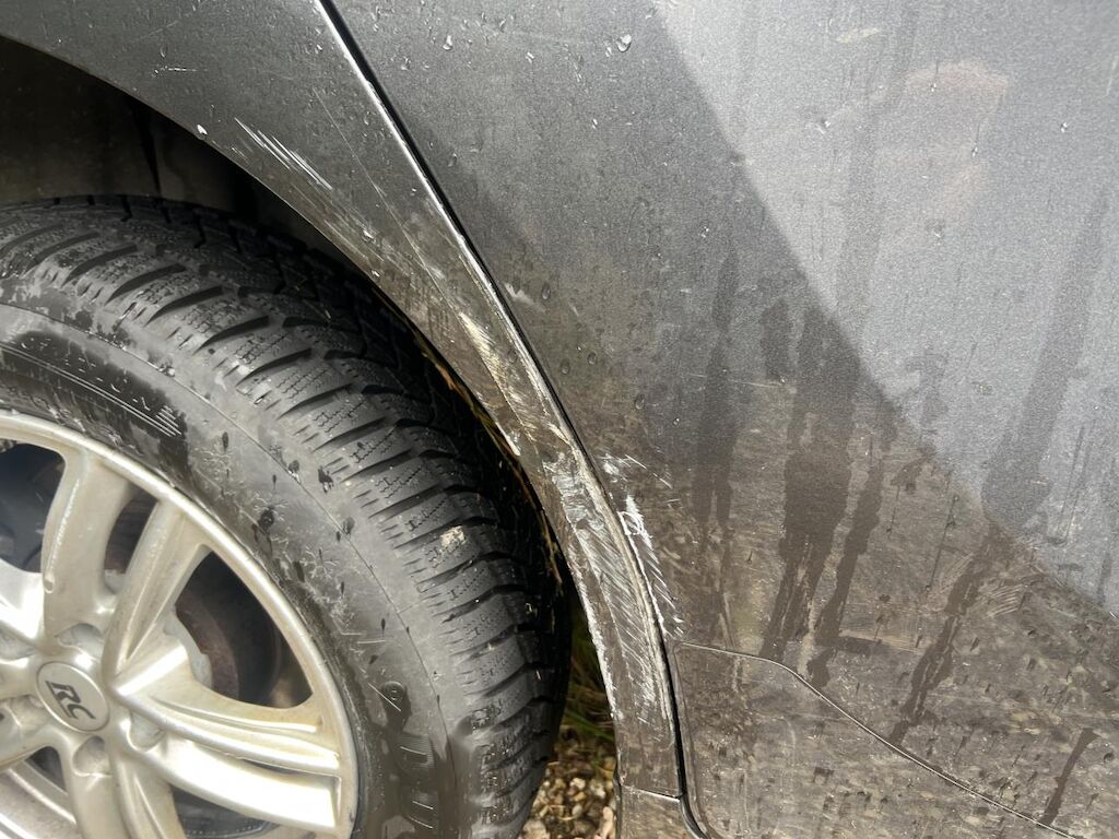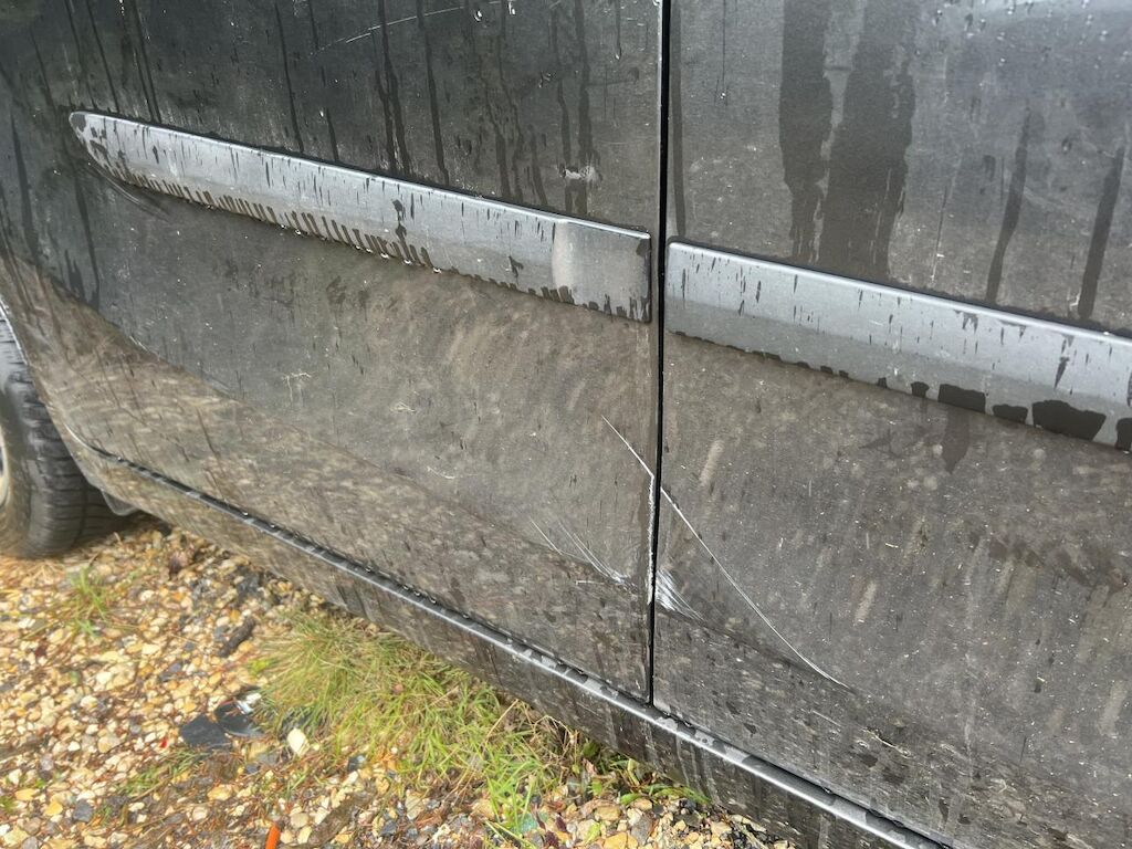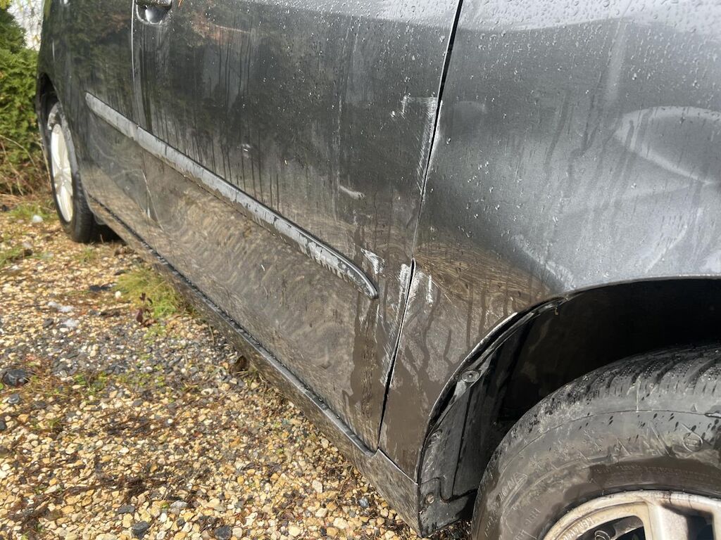 Seite rechts, Verkleidung, Kotflügel, Türen und Radlauf h.r. deformiert und verkratzt. Heckverkl. r. verkratzt.