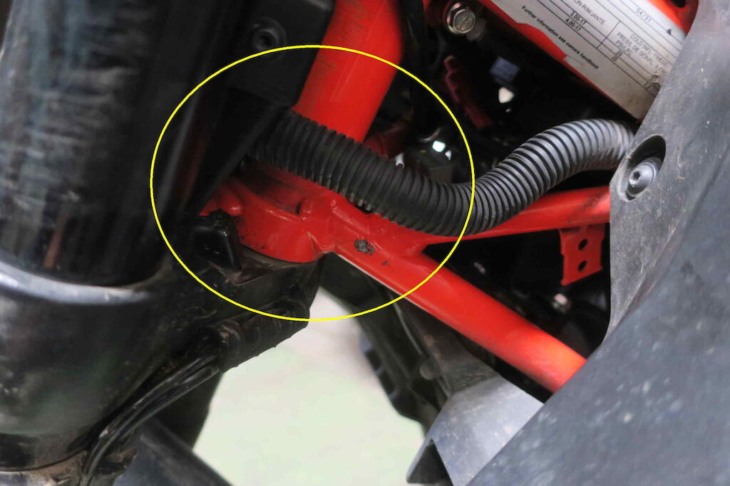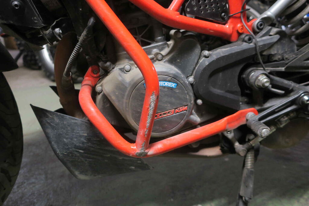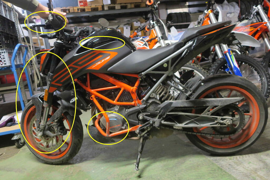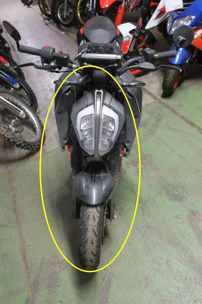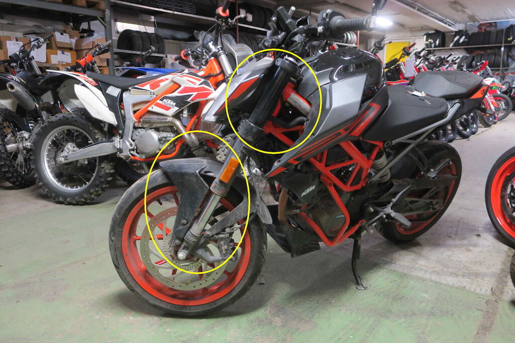 Front, Seite links: Gabel vorne ist gestaucht, Rahmen vorne ist beschädigt.