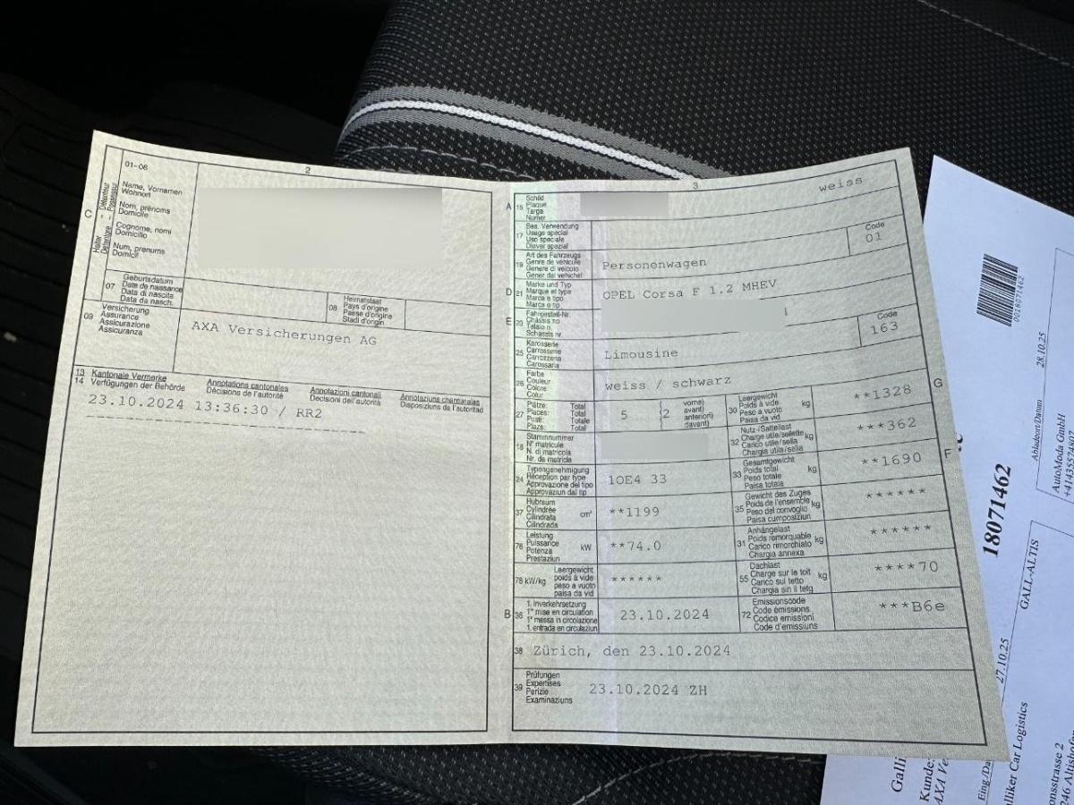 Kopfstützen, höheneinstellbar, vorn und hinten, Assist: Bremsassistent (BAS), Airbag: Seitenairbag für Fahrer und Beifahrer, Assist: Berganfahrhilfe, Türgriffe aussen in Wagenfarbe, Airbag: Airbag Fahrer und Beifahrer, Lackierung: Uni-Lackierung, Airbag: Window-Kopfairbags, Zentralverriegelung mit Fernbedienung, Aussenspiegel rechts und links beheizbar und elektrisch verstellbar, Servolenkung geschwindigkeitsabhängig, Make up-Spiegel rechts, Klima: Pollenfilter (Staubfilter), Elektronischer Bremskraftverteilung EBD, Lenkrad: Lenkrad längs- und höhenverstellbar, Make up-Spiegel links, Katalysator geregelt, Gurtkontrolle, ISOFIX Kindersitzvorrichtung, Elektronisches Stabilitäts-Programm ESP, Licht: Umgebungsausleuchtung (Follow me home), Bordcomputer, 2 Zündschlüssel mit Funkfernbedienung, klappbar, Ablagefächer – Ablagefach in der Mittelkonsole, vorn und hinten; Getränkehalter, in der Mittelkonsole; Handschuhfach; Ablagefach in den vorderen Türen, geeignet für 1,5-Liter-Getränke.laschen; Ablagefach in den hinteren Türen, geeignet für 0,5-Liter-Getränke., Active Aero Shutter (nicht mit 1.2 [55 kW]): Kühlergrill mit aktiv gesteuertem Lufteinlass, Aluminium-Sportpedale, Antiblockiersystem (ABS) mit Kurvenbremskontrolle und Bremsassistent, Assist: Frontkollisionswarner mit automatischer Gefahrenbremsung, Assist: Park-Pilot vorne und hinten, Assist: Rückfahrkamera 130°, Assist: Toter-Winkel-Warner (BSD), Assist: Traktionskontrolle mit Motor- und Bremseingriff (TCPlus), Aussenspiegel elektrisch anklappbar, Aussenspiegel in schwarz, Dach in schwarz, Dach-Designlinie, in Schwarz, Dachhimmel schwarz, Dekor: Dekorleisten, Silent Schwarz/Weiss, Drehzahlmesser, Dreipunkt-Sicherheitsgurte auf allen Plätzen, – Gurtkraftbegrenzer und Gurtstra.fer vorn und auf den äusseren Rücksitzen, Warnton und -leuchte für nicht angelegte Gurte auf allen Plätzen, Fahrer-Instrumentendisplay 7", Fensterheber, elektrisch, vorn und hinten, mit Tippfunktion und Einklemmschutz, Fussmatten, Garantie: 3 Jahre oder 100’000 km (ab 1. Inv.), Getriebe: 6-Stufen-DSG-Automatik (eDCT), Klima: Klimatisierungsautomatik, Lenkrad: Lenkrad aus veganem Kunstleder, unten abgeflacht, Lenkrad: Lenkradheizung, Licht: ECO LED Scheinwerfer inkl. Sichtpaket, Licht: LED Heckleuchten, Media: Multimedia Radio mit 10"-Touchscreen-Farbdisplay, Mittelkonsole mit Armlehne vorne mit veganem Lederlenkrad, Opel Connect – Automatischer Notruf/Pannenruf & Fahrzeuglokalisierung, Paket: Fahrerassistenzsystem BASE, Paket: Tech-Paket Edition, Polster: Sport Stoffsitz, Räder: 17” Leichtmetallfelgen mit Diamantschliff, Sitze: Beifahrersitz 4-fach manuell verstellbar, Sitze: Kopfstützen, vorn, und 3 Kopfstützen, hinten, höhen- und neigungseinstellbar, Sitze: Rückenlehne im Verhältnis 60:40 geteilt umklappbar, Sitze: Vordersitze heizbar, Sitze: Vorrüstung für Kindersitz-Befestigungssystem ISOFIX, Beifahrersitz und hinten aussen, Start/Stop System – verstärkter Anlasser, Hochleistungsbatterie, Schalter zur Deaktivierung der Start/Stop-Funktion, Steckdose, 12 Volt, in der Mittelkonsole
