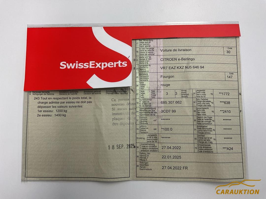 Automatische Entriegelung im Falle eines Stosses, Getriebe: Direktantrieb, kein Getriebe, Aussenspiegel rechts und links beheizbar und elektrisch verstellbar, Verzurrösen, Zentralverriegelung mit Fernbedienung, Aussenspiegel, komplett getönt, Media: DAB-Audio System RD6 Radio + 1 USB-Anschluss + 1 Klinkenanschluss + Bluetooth (1 micro) + + kurzer Cabrio-Antenne (200 mm), MW/UKW/DAB, Elektronische Parkbremse, Klima: Manuelle Klimaanlage, Laderaumverriegelung – Blinkertaste – automatische Verriegelung während der Fahrt, Assist: Berganfahrhilfe (Hill Holder), Automatischer Scheibenwischer vorne, Licht: Drittes Bremslicht, Fixierte Trennwand in voller Höhe mit Kleiderhaken, Assist: Bremsassistent (BAS), Garantie: CITROEN 3 Jahre Garantie bis 80’000 Km auf Teile, Arbeit und Citroën Assistance – 2 Jahre Km unbegrenzt und im 3. Jahr bis 80’000 Km begrenzt., On-Board Charger 11kW, Garantie: CITROEN 8 Jahre / 160’000km Garantie auf die Batterie für 70% der Ladekapazität, Antiblockiersystem (ABS), Polster: Stoff-Ausstattung, Airbag: Airbag Fahrerseite, Lackierter Boden ohne Schutz, Räder: Reifenreparatur-Set, Servolenkung, Vordere und hintere Stossfänger, komplett getönt, Steckdose Typ J Modus 2 8A, Elektronisches Stabilitäts-Programm (ESP), Lenkrad: Lenkrad längs- und höhenverstellbar, Räder: Reifendruck-Kontrollanzeige, Sitze: Fester Einzelsitz mit Staufach unter dem Sitz, Licht: Automatisches Einschalten der Abblendlichter, Garantie: CITROEN 3 Jahre Lackgarantie (2 Jahre Km unbegrenzt und im 3.Jahr bis 80’000 Km begrenzt.), Elektrische Fensterheber vorne, Assist: Antriebsschlupfregelung (ASR), Ablagefach im Dachbereich, Licht: LED-Tagfahrlicht, Laderaumbeleuchtung, Ein normaler Schlüssel und ein PLIP-Schlüssel, Wegfahrsperre elektronisch, Licht: Nebelschlussleuchte, Seitenschutz-Zierleisten
