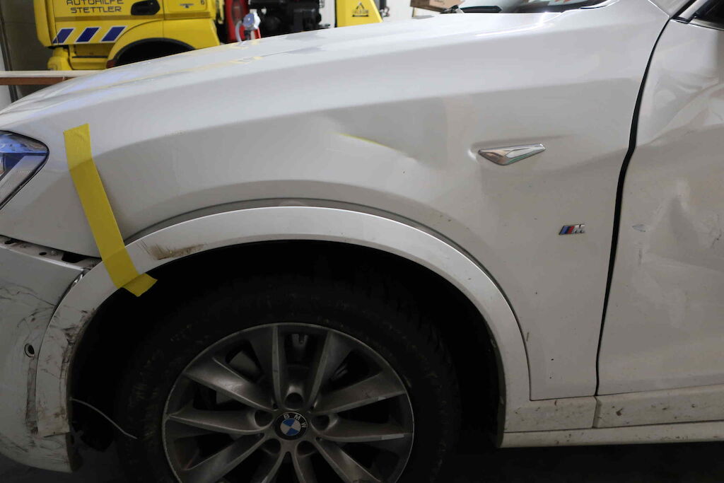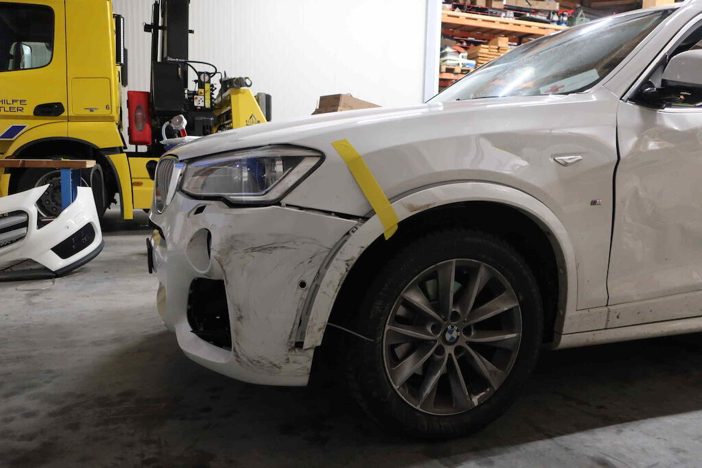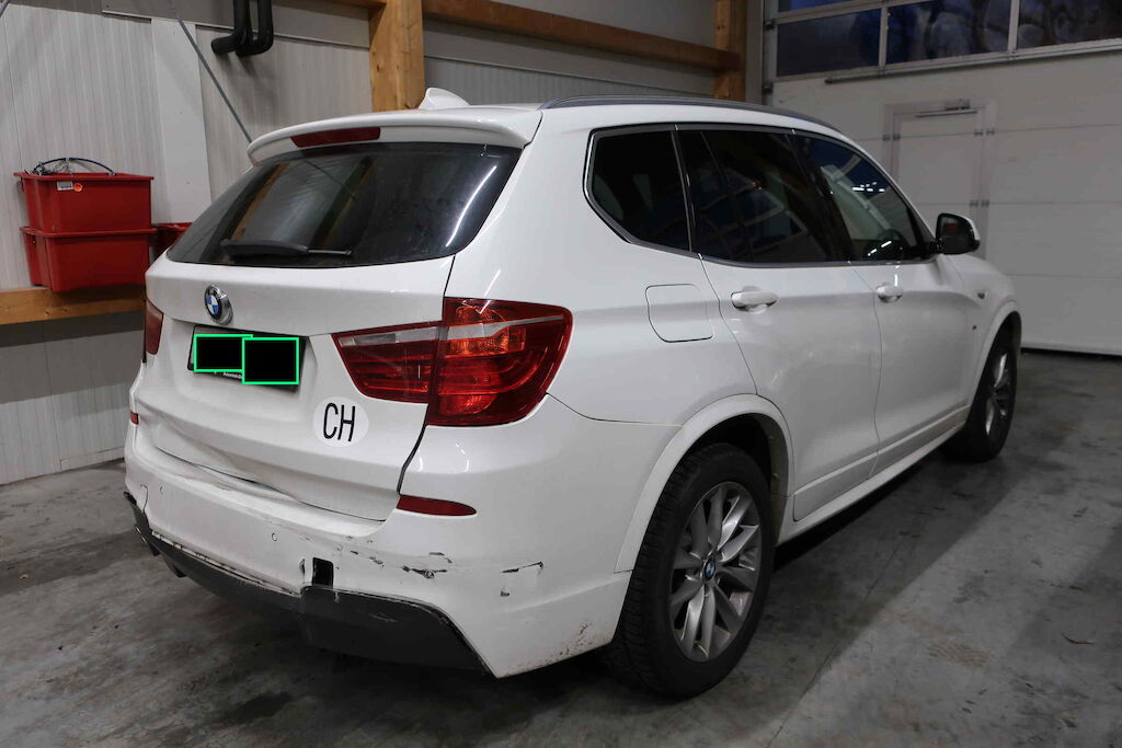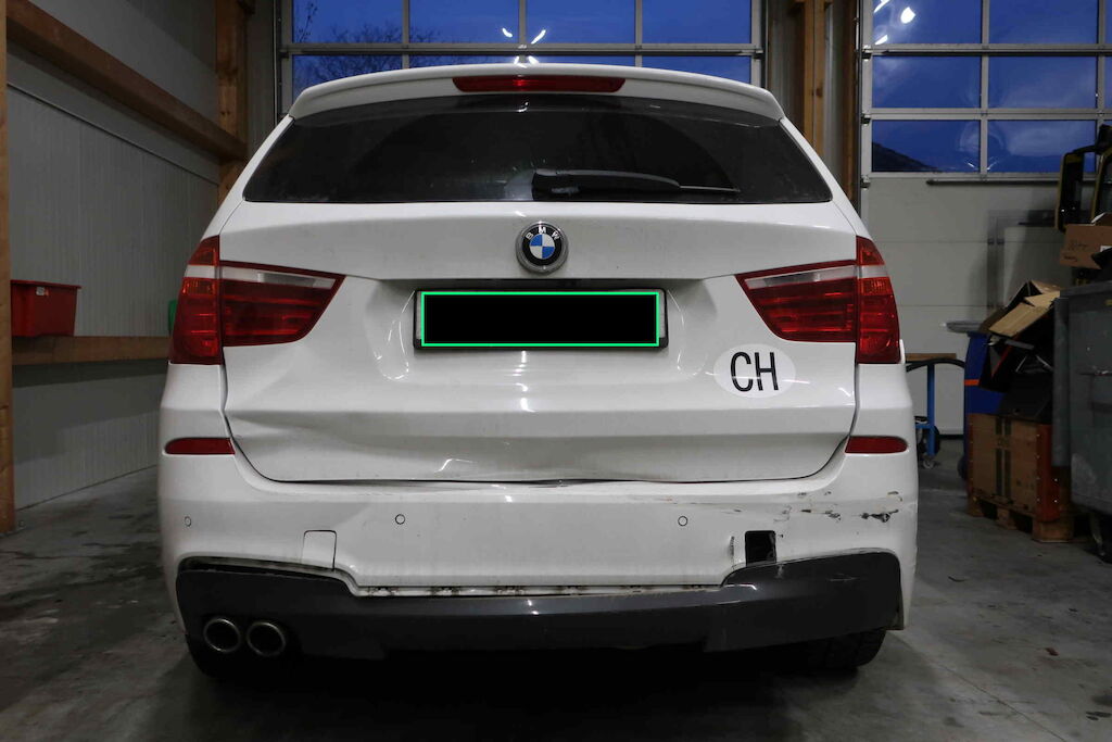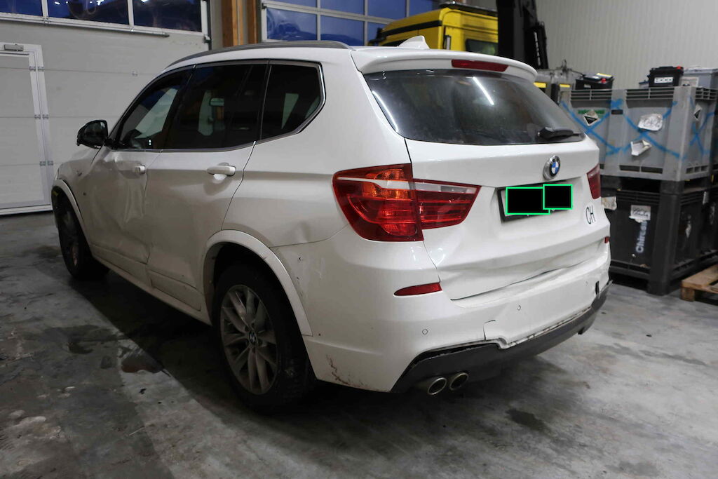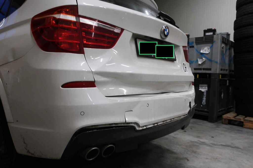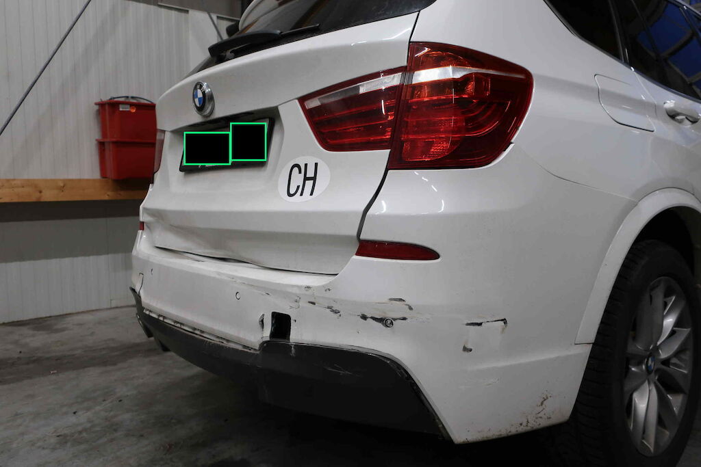 Stossfänger vo li, Kotflügel vo li, Radlaufzierleiste vo li, Scheinwerfer li, Felge vo li, Türe vo li, Spiegel li, B-Säule li, Türe hi li, Seitenwand hi li, Schlussleuchte li, Radlaufzierleiste hi li, Stossfänger hi li, Spoiler hi, Heckdeckel beschädigt