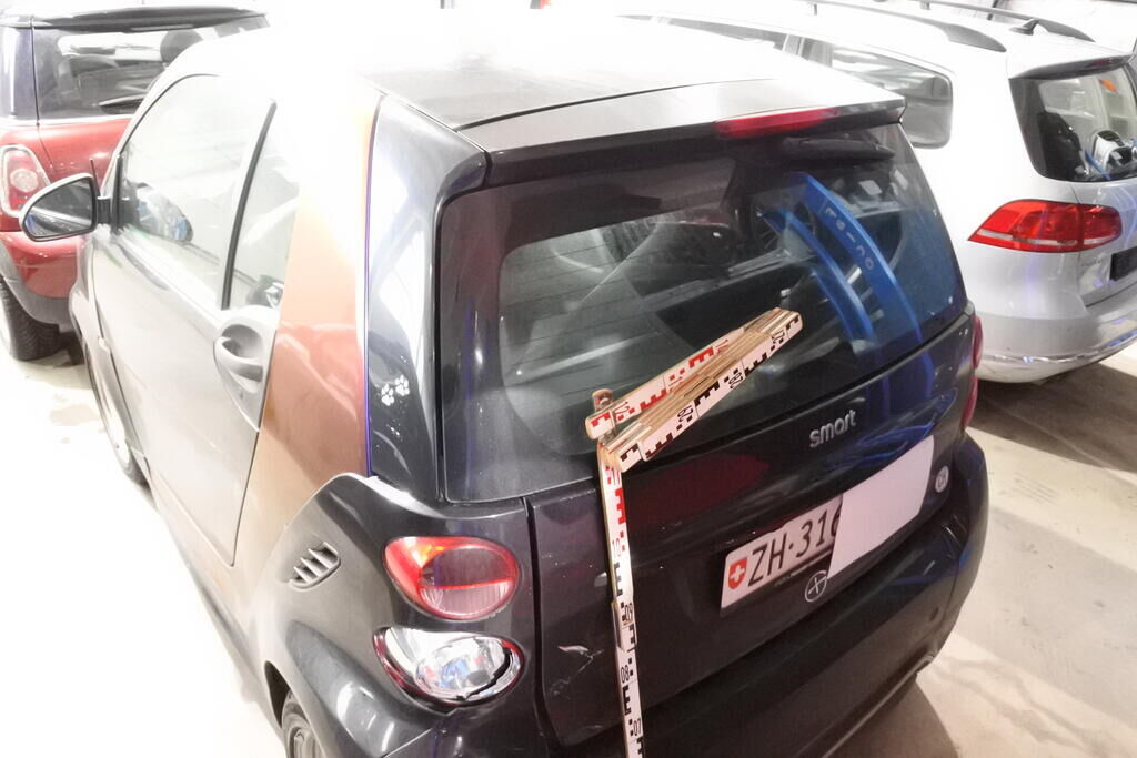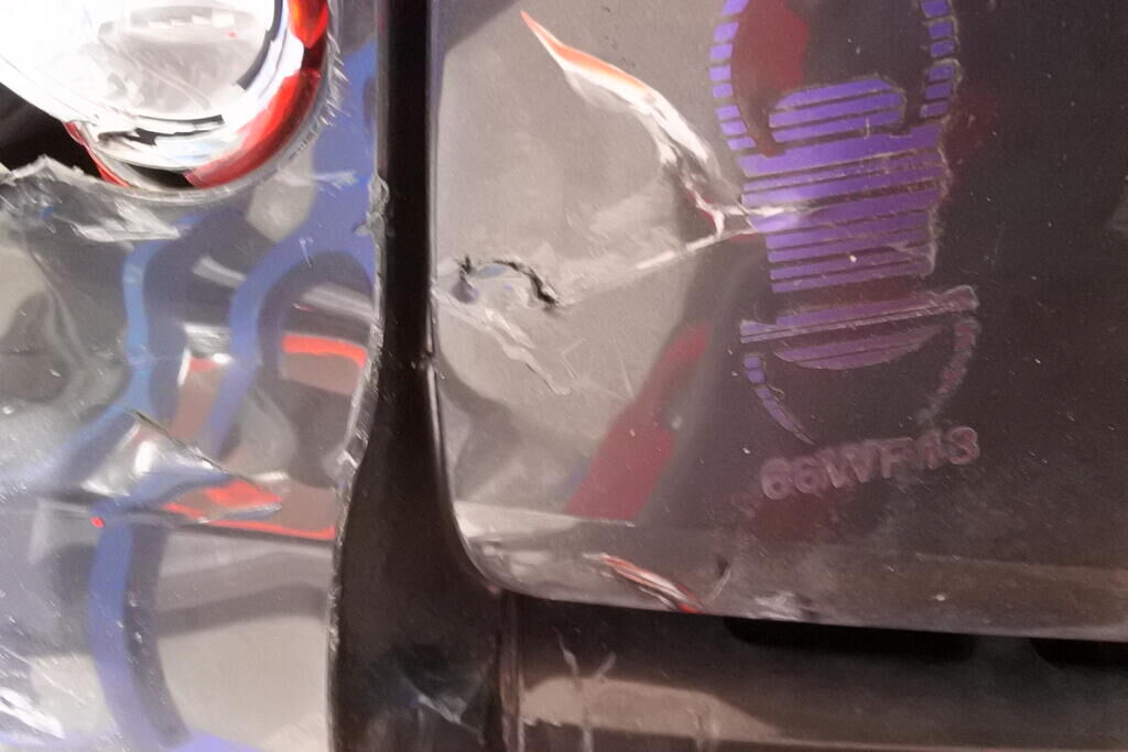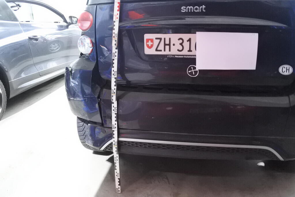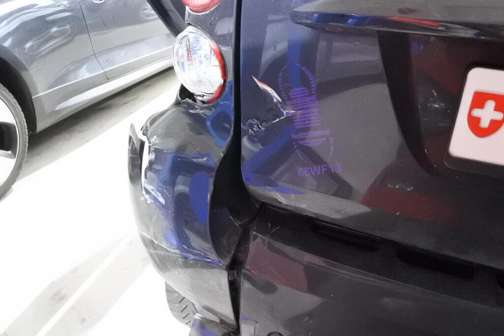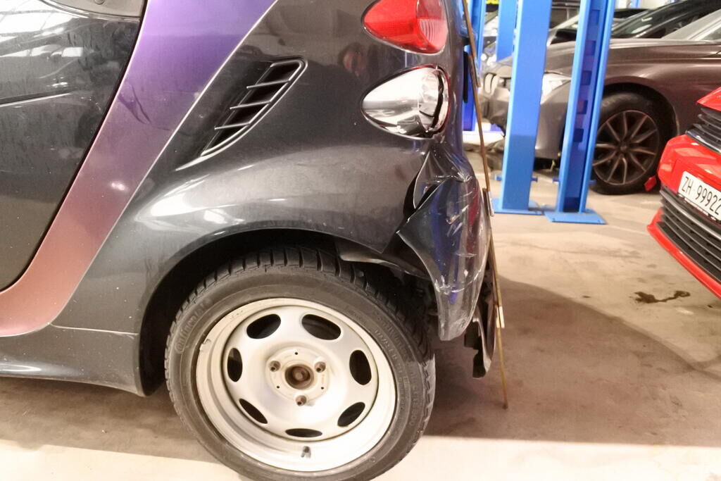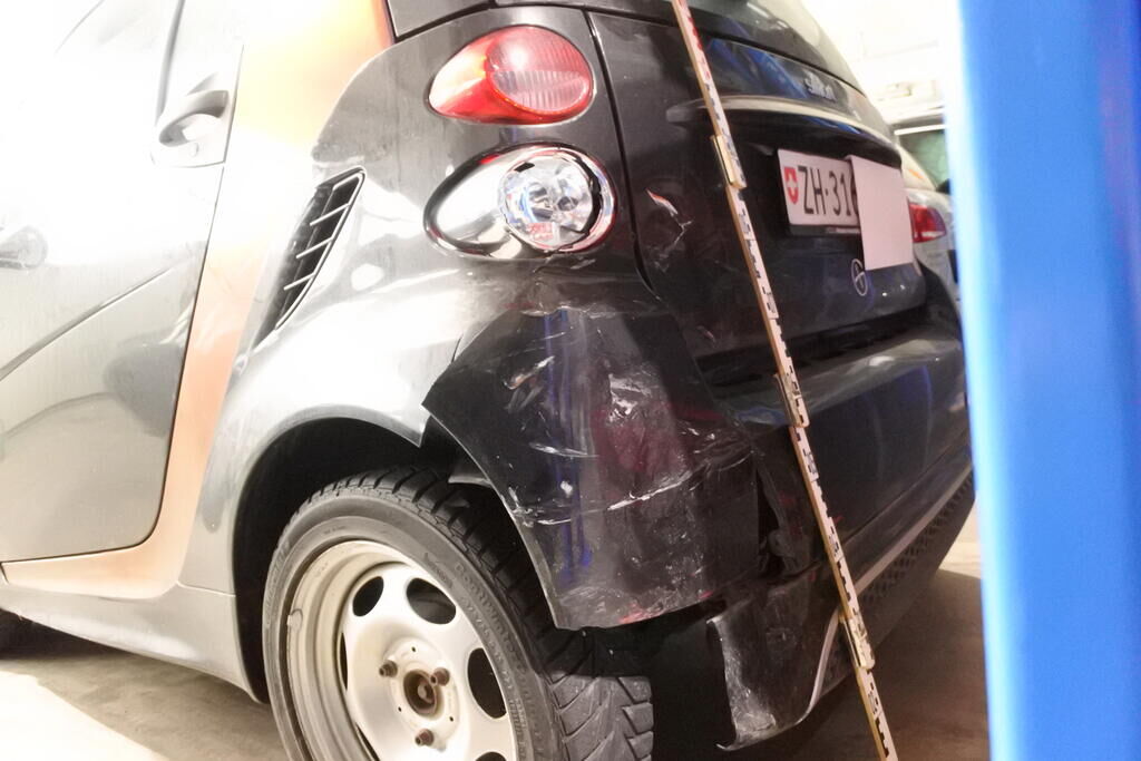 Die Stossstange mittit und deren Ecke mit Halterung, Verstärkung und Quertraverse, der Spoiler, die Rückleuchte und das Heckblech sind eingedrückt und beschädigt. Die Hinterachse ist deformiert.