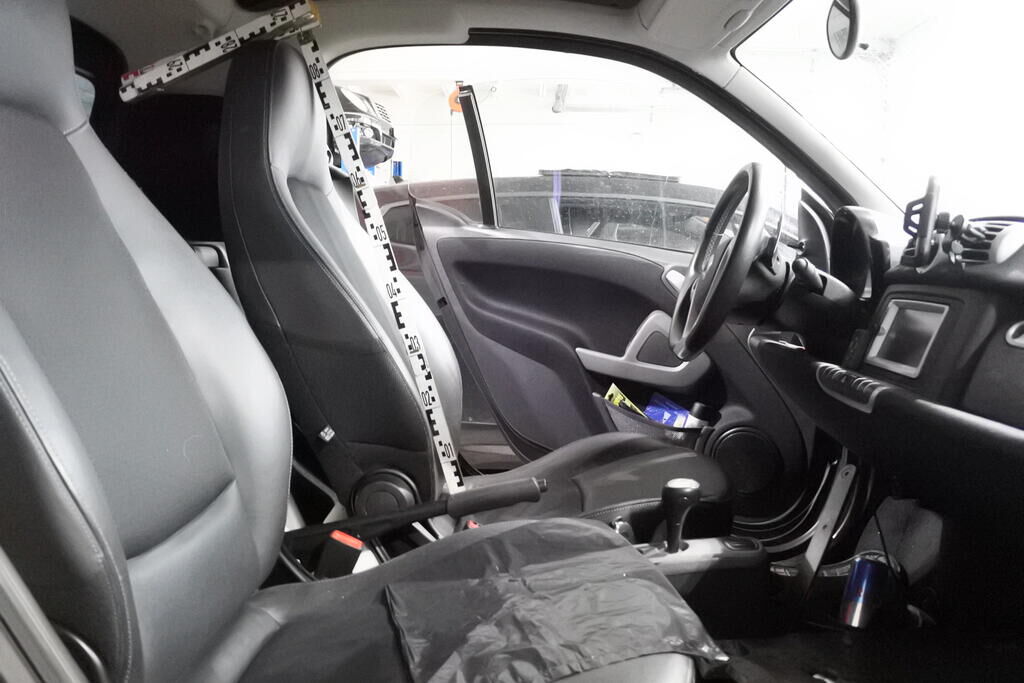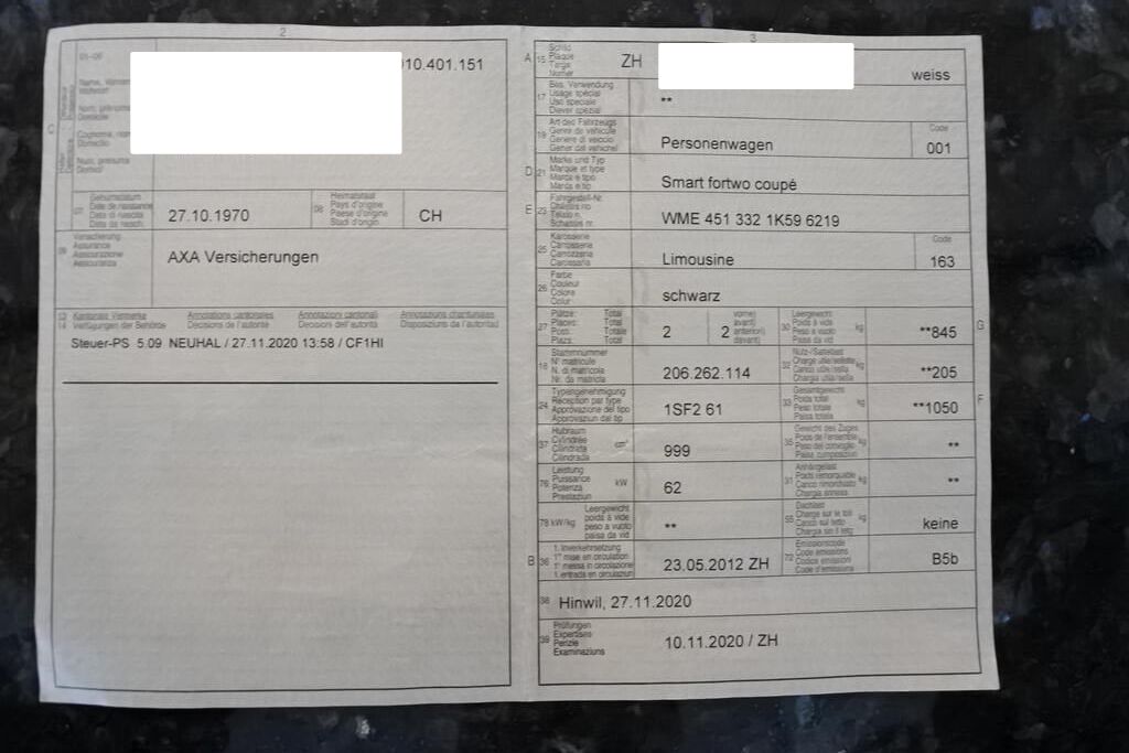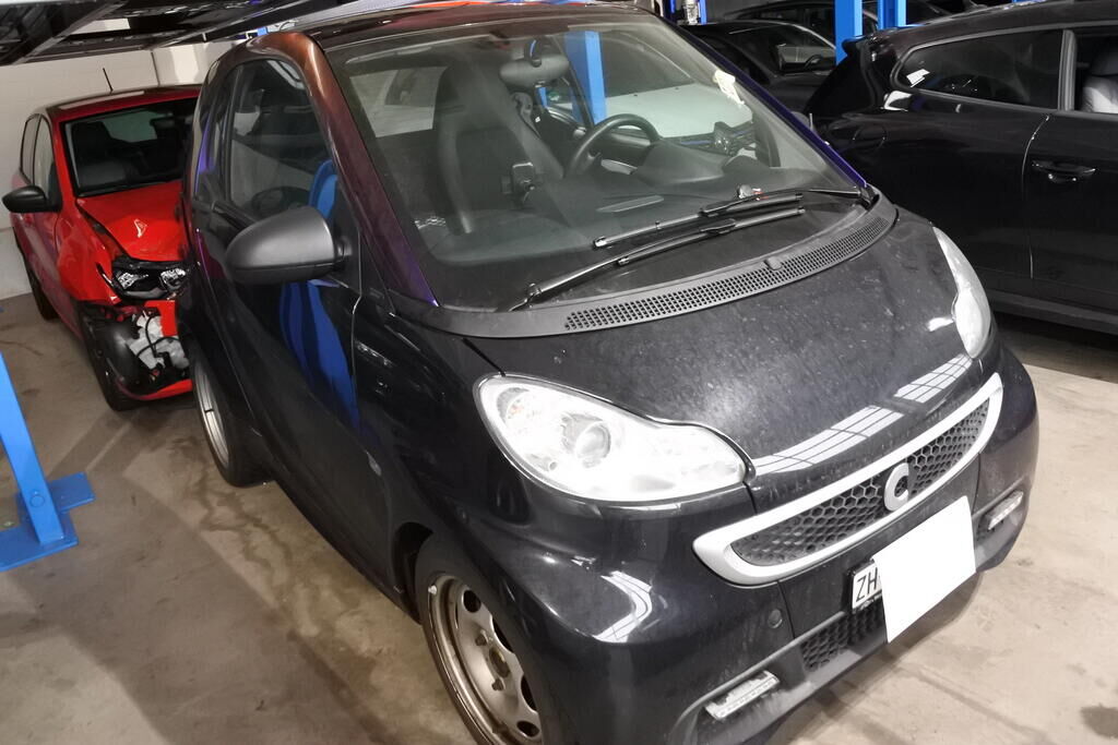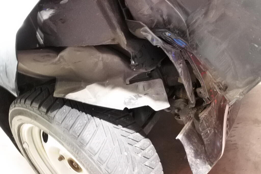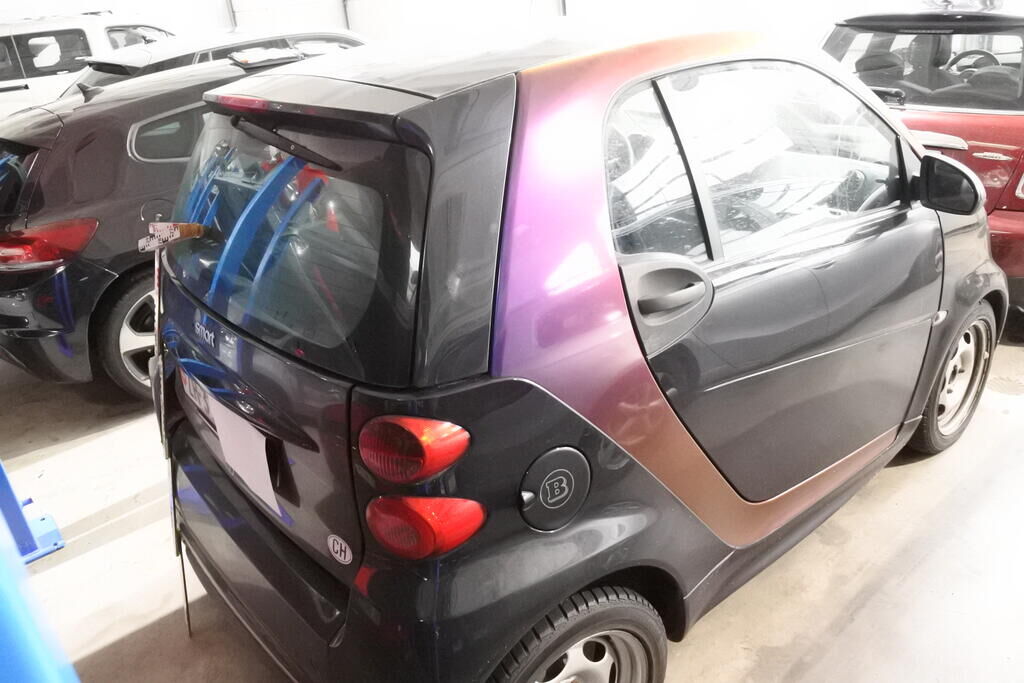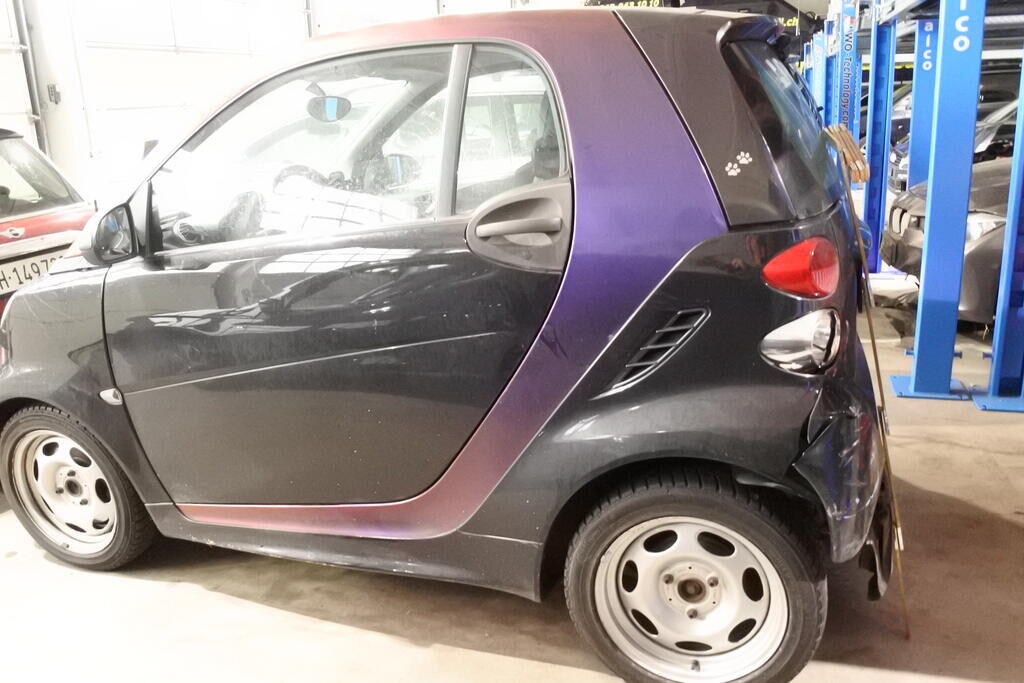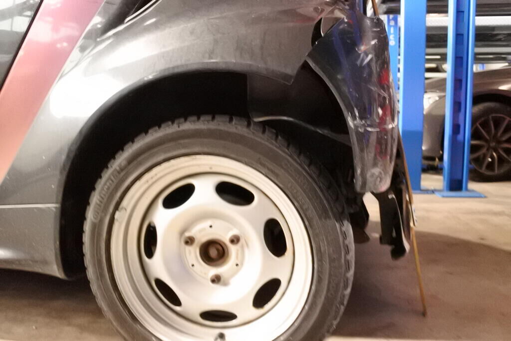 Die Stossstange mittit und deren Ecke mit Halterung, Verstärkung und Quertraverse, der Spoiler, die Rückleuchte und das Heckblech sind eingedrückt und beschädigt. Die Hinterachse ist deformiert.