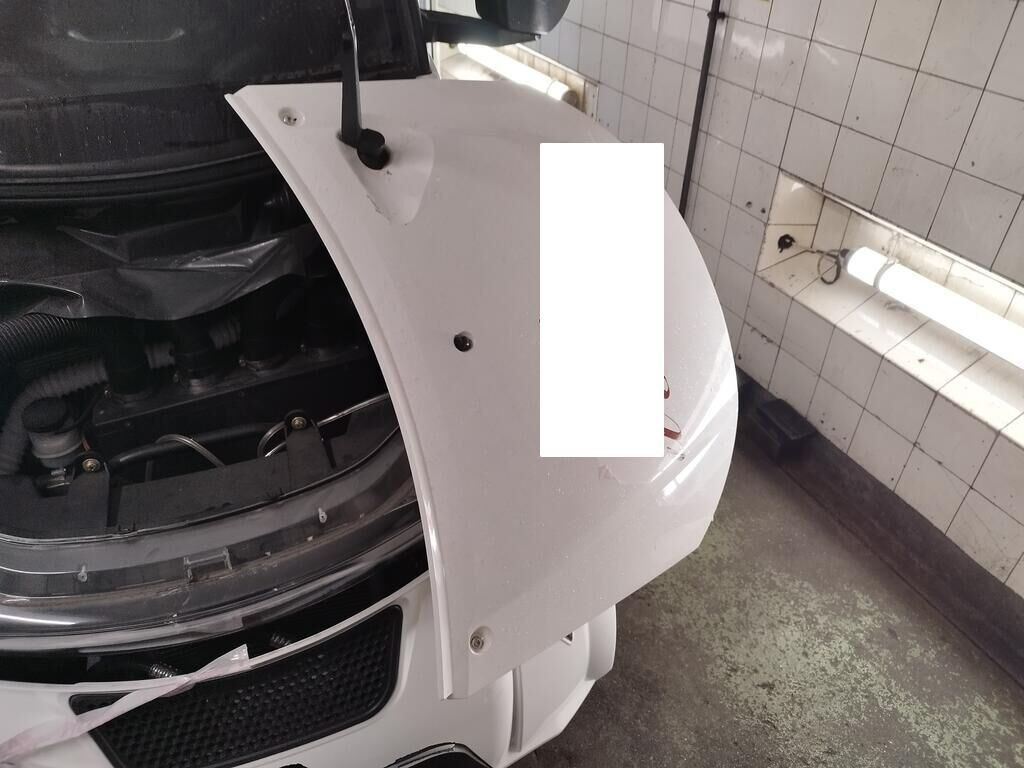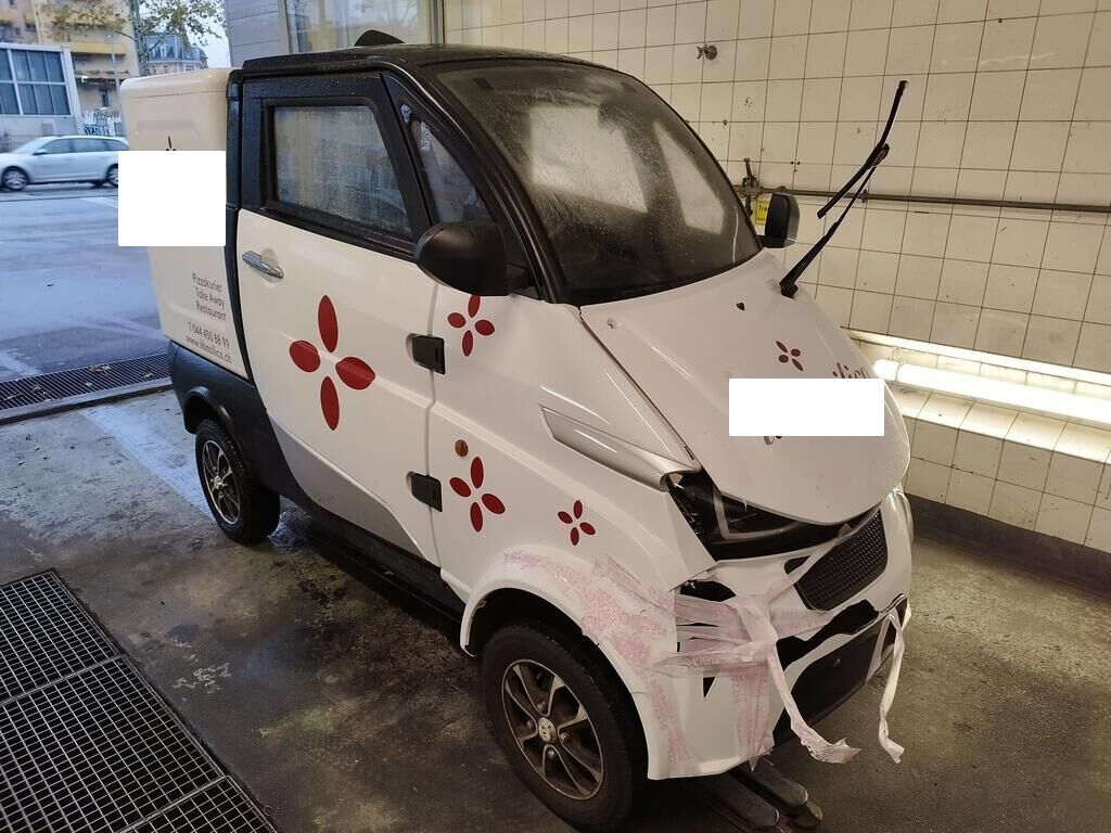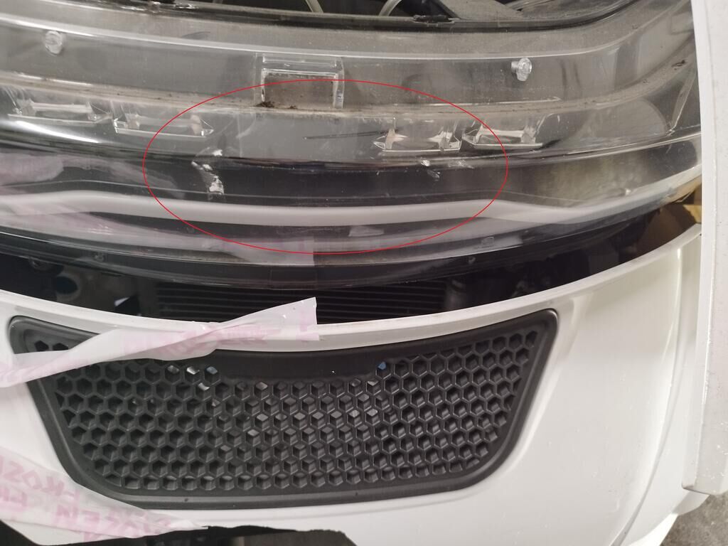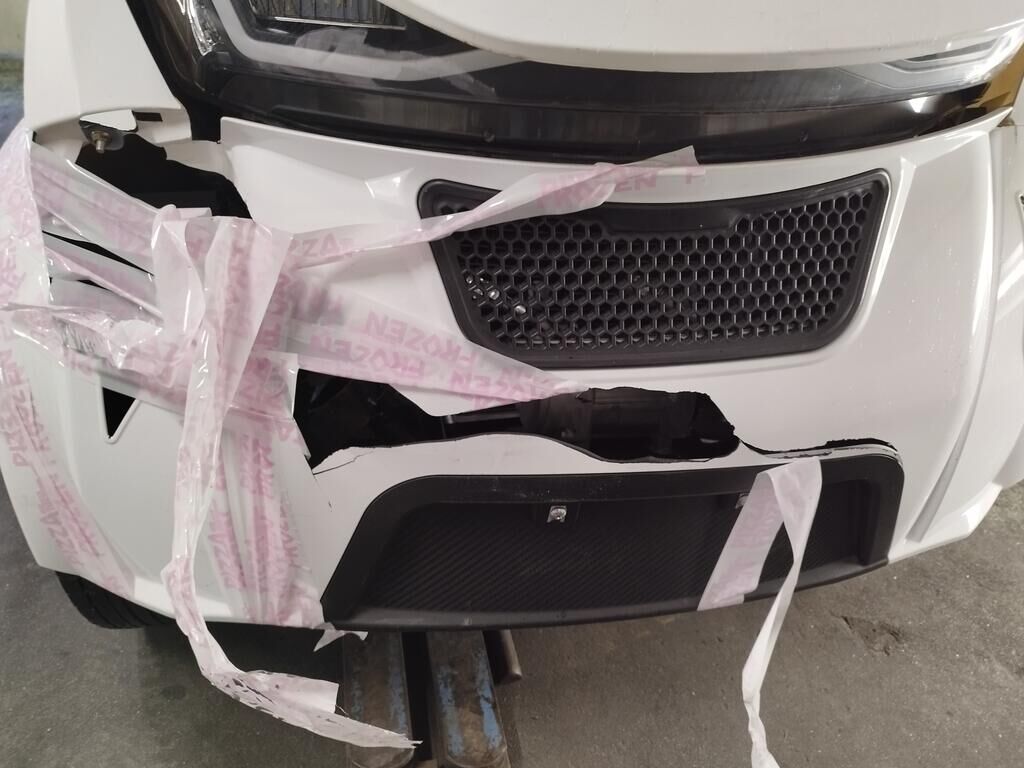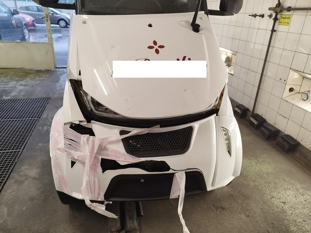 Die Motorhaube ist ausgerissen, die Stossstange vorne ist gerissen, der Scheinwerfer hat Kratzspuren, der Kühler ist deformiert, der Klimakompressor wurde beschädigt, der Rahmen vorne ist deformiert.