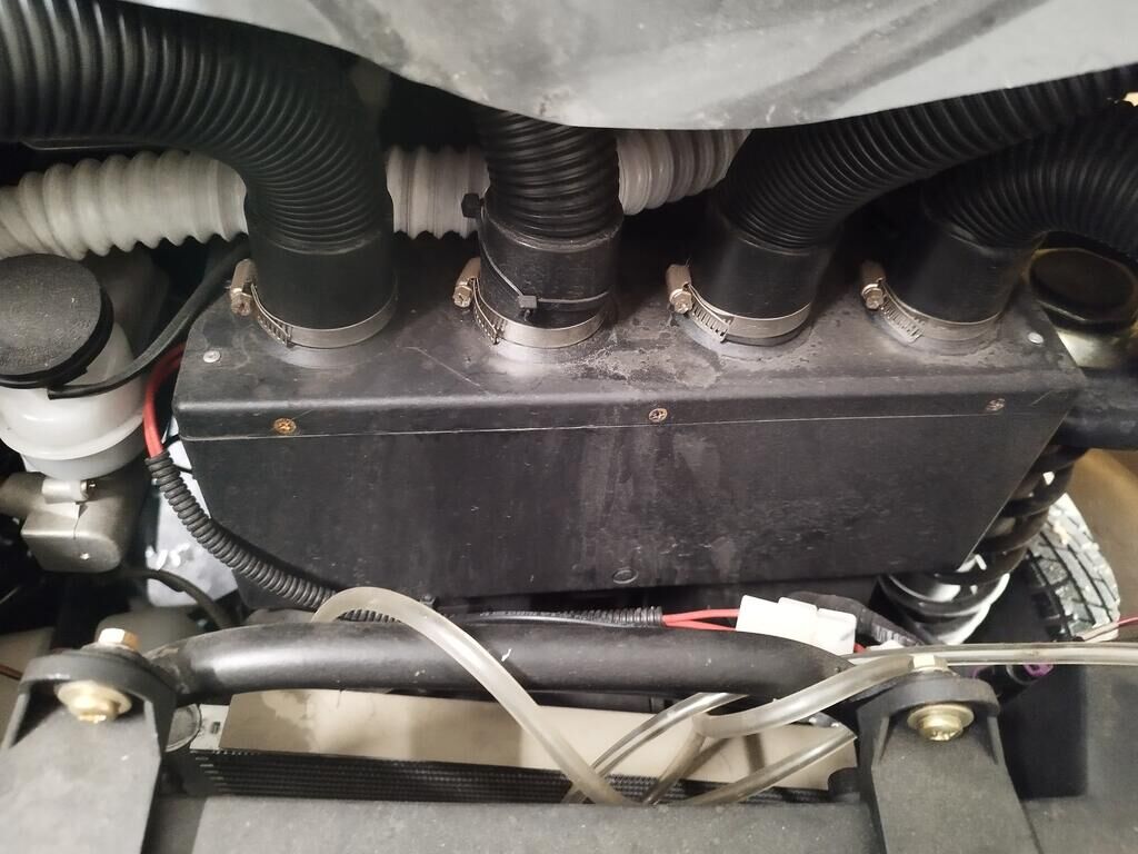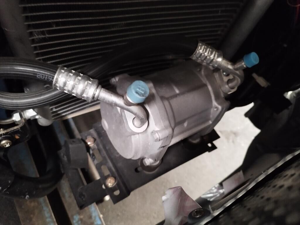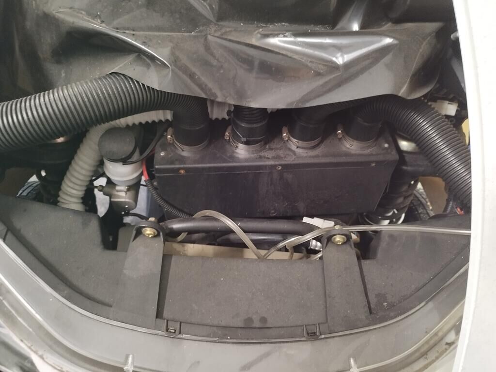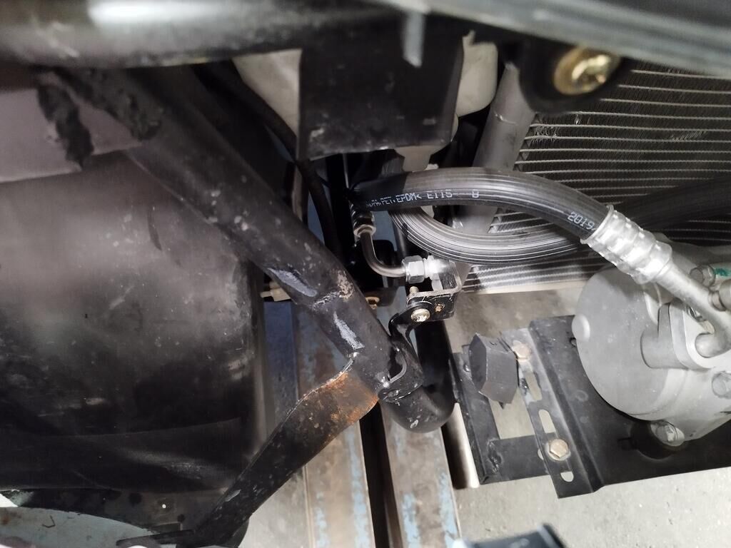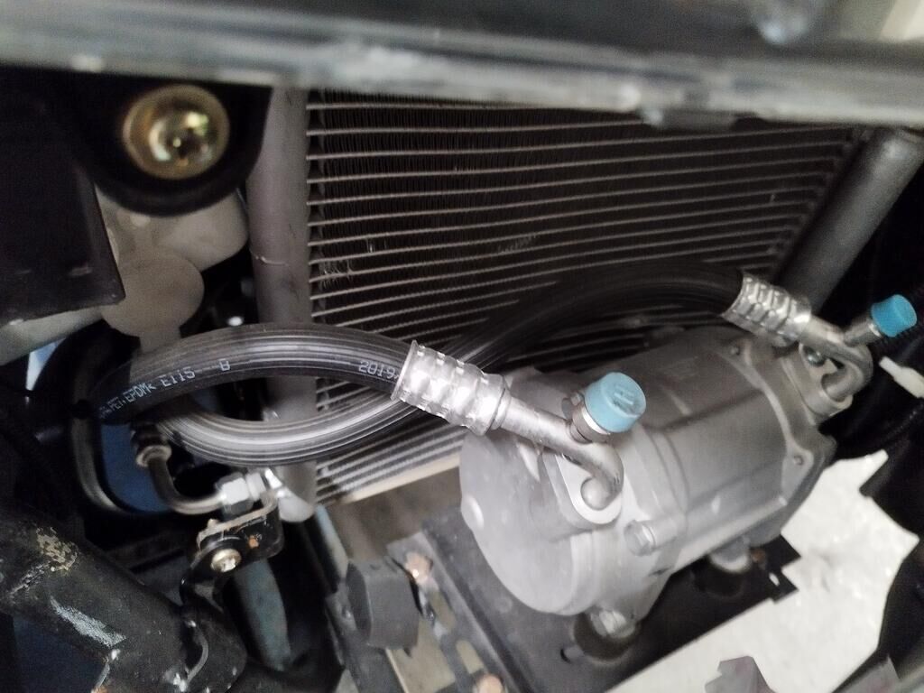 Die Motorhaube ist ausgerissen, die Stossstange vorne ist gerissen, der Scheinwerfer hat Kratzspuren, der Kühler ist deformiert, der Klimakompressor wurde beschädigt, der Rahmen vorne ist deformiert.