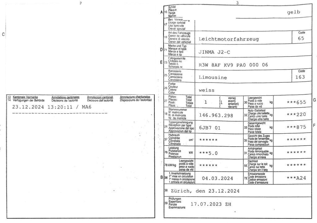 | Pneumatici | Achse 1: L: 5 mm, R: 5 mm, Dimension: 145/70 R12 Winter Achse 2: L: 5 mm, R: 5 mm, Dimension: 145/70 R12 Winter |