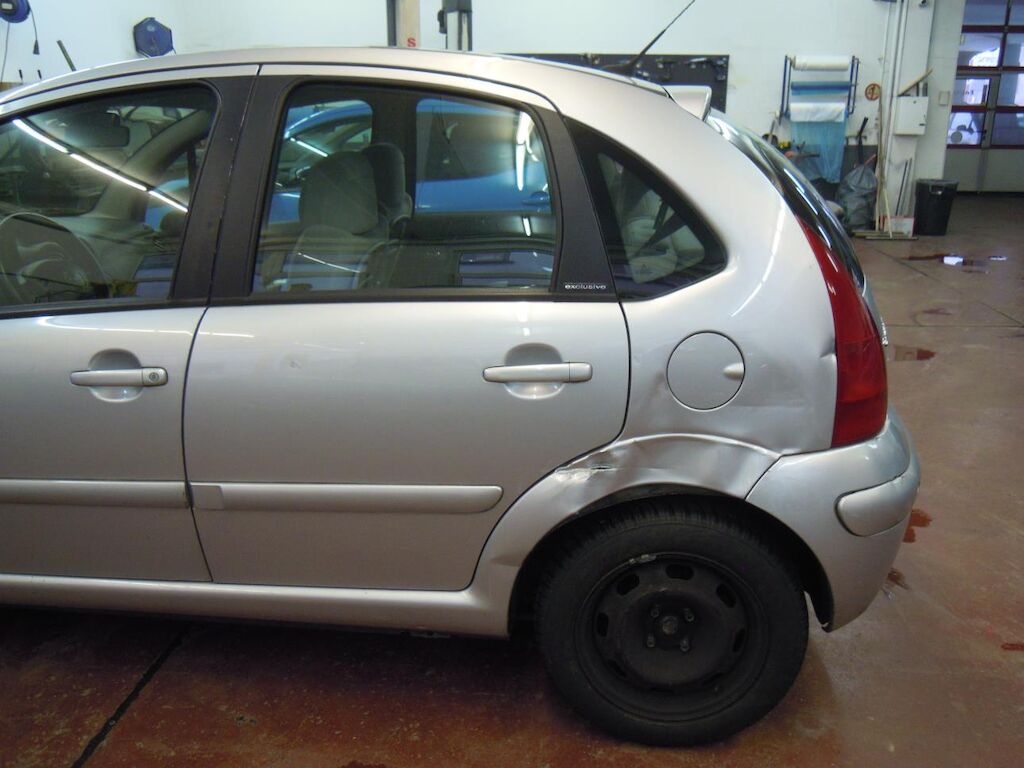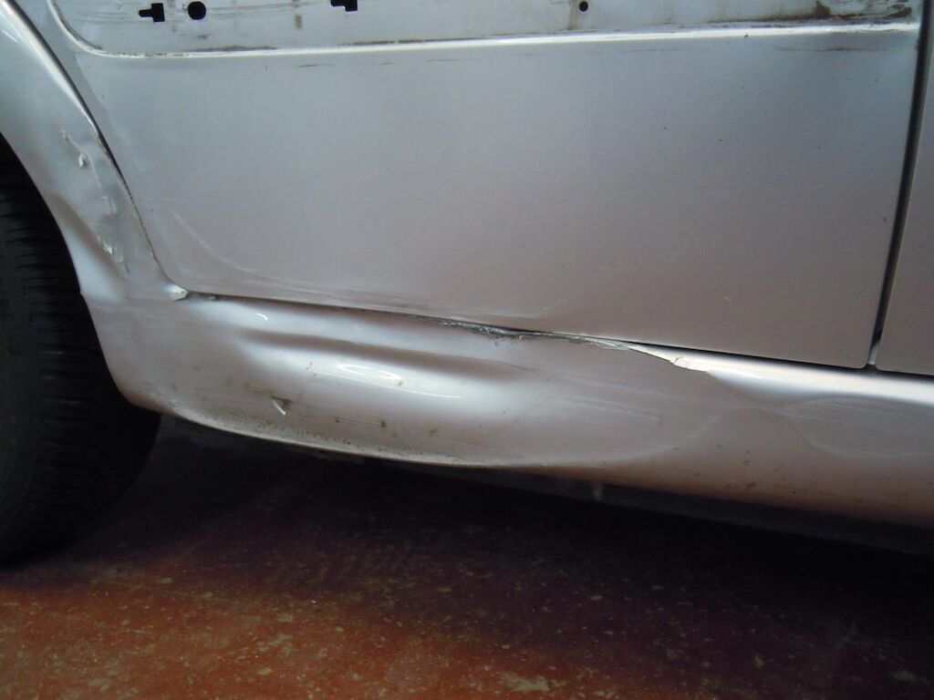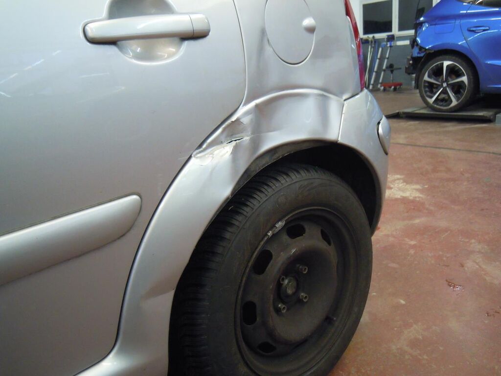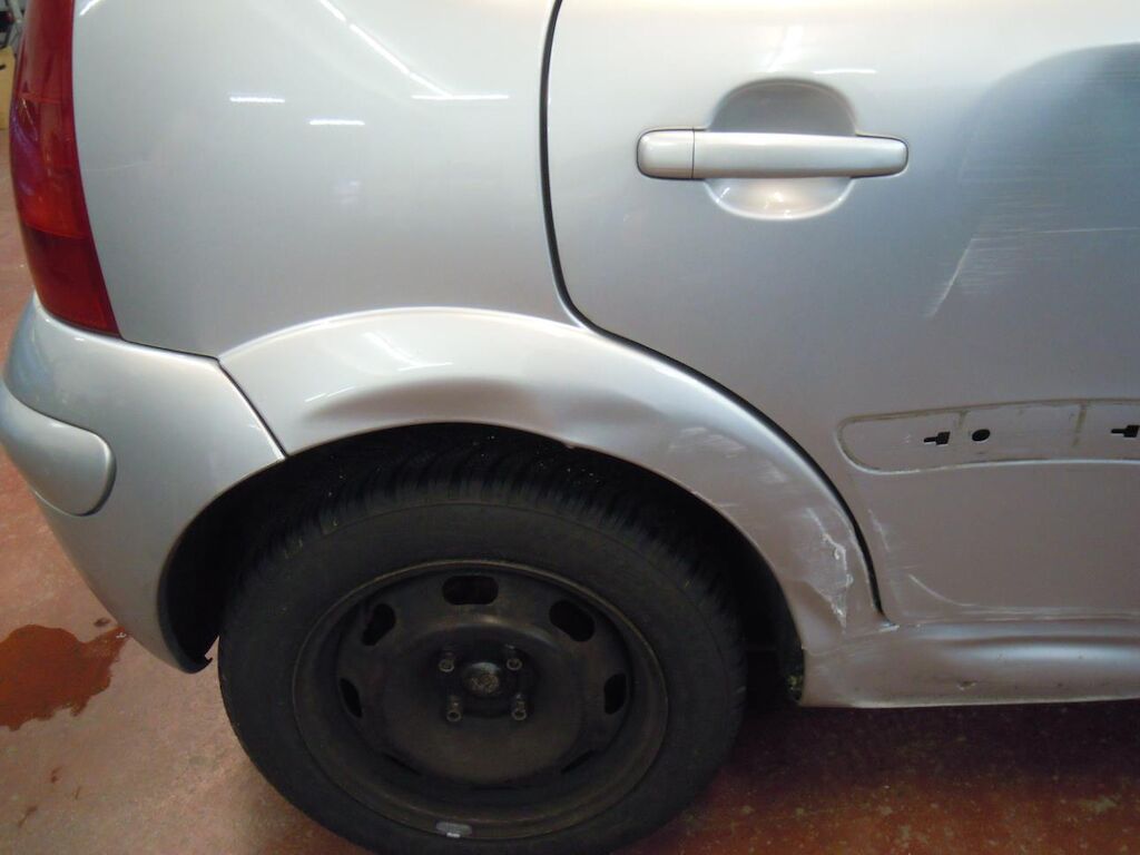 Arrière gauche: Aile fortement déformée et déchirée, porte déformée et griffée.