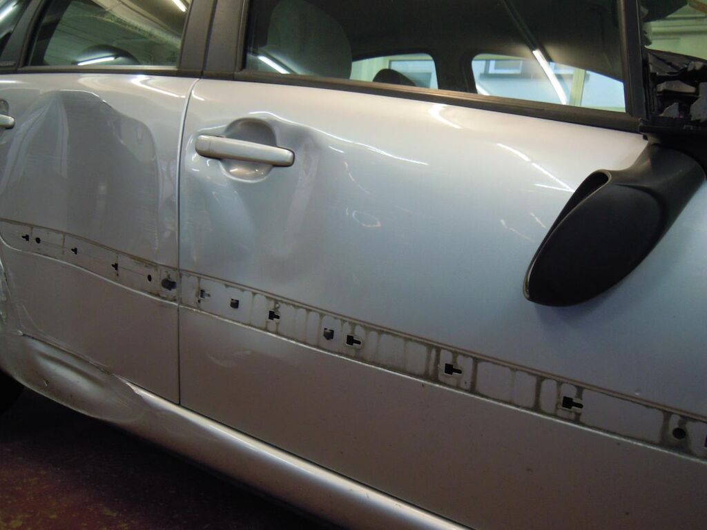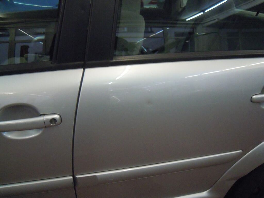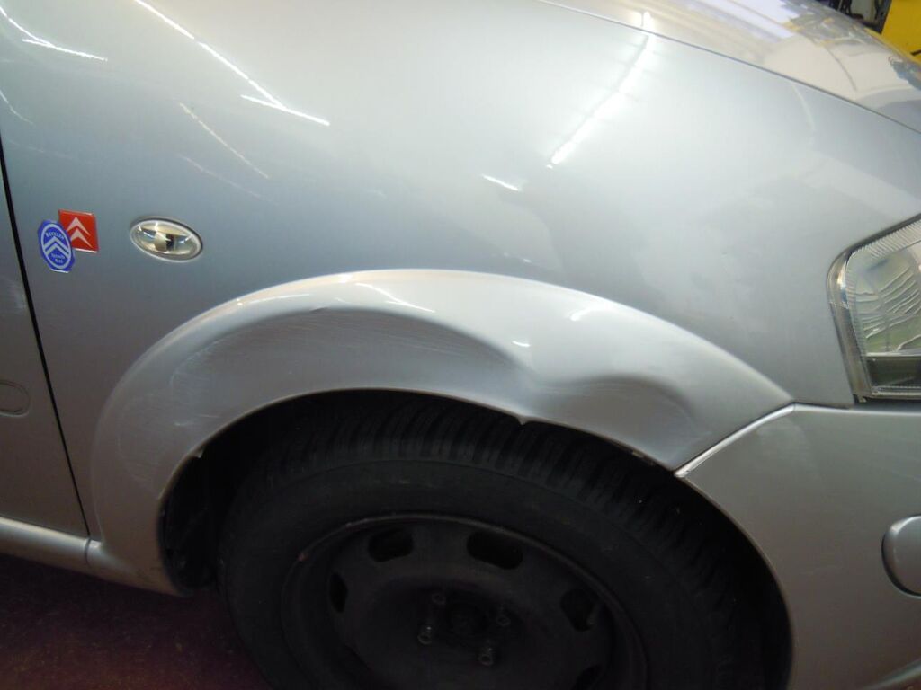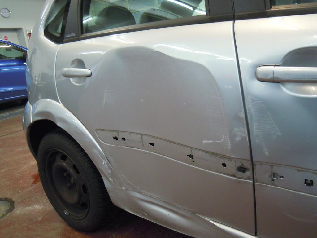 Arrière gauche: Aile fortement déformée et déchirée, porte déformée et griffée.