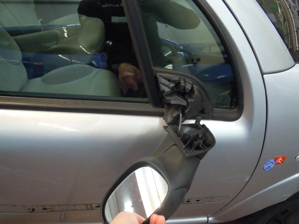 Latéral droit: Ailes, portes et bas de caisse fortement déformées, rétroviseur cassé.