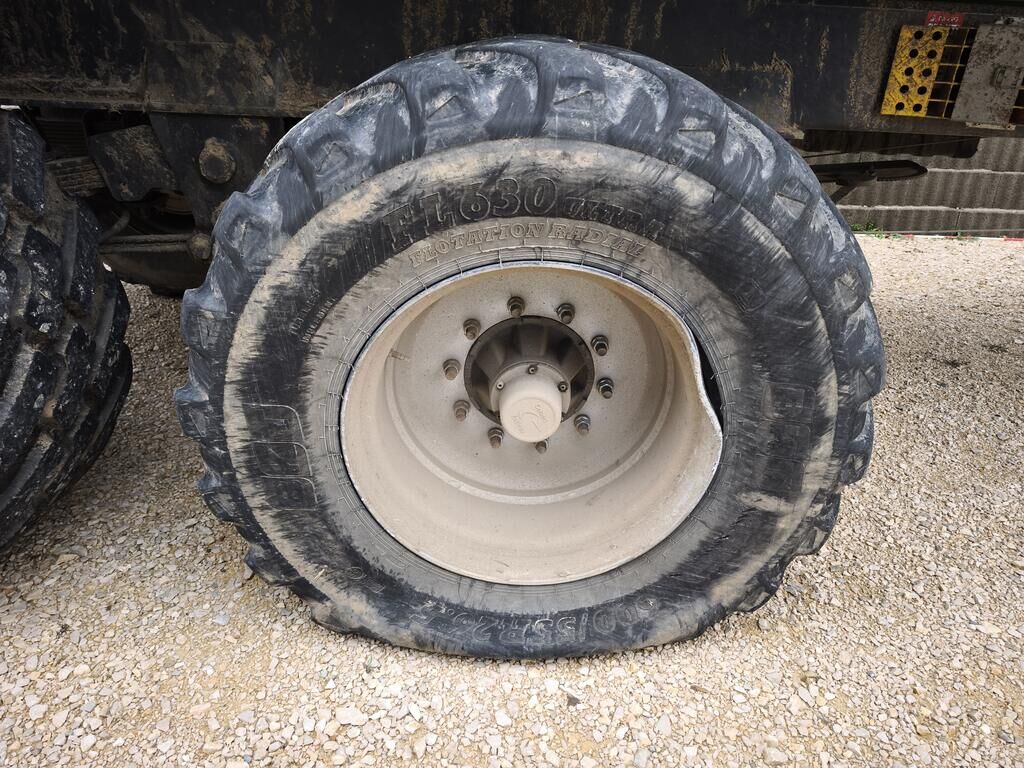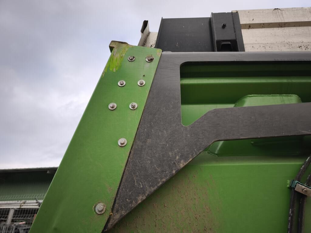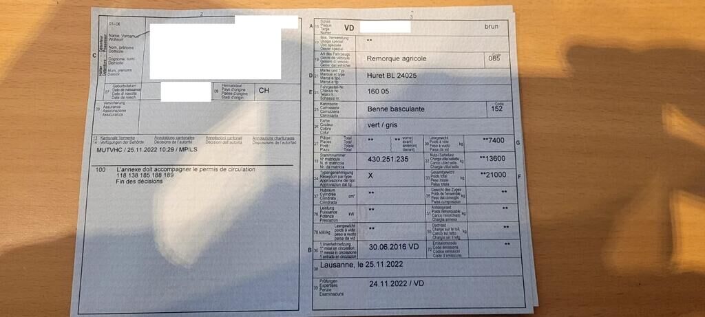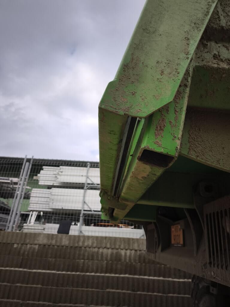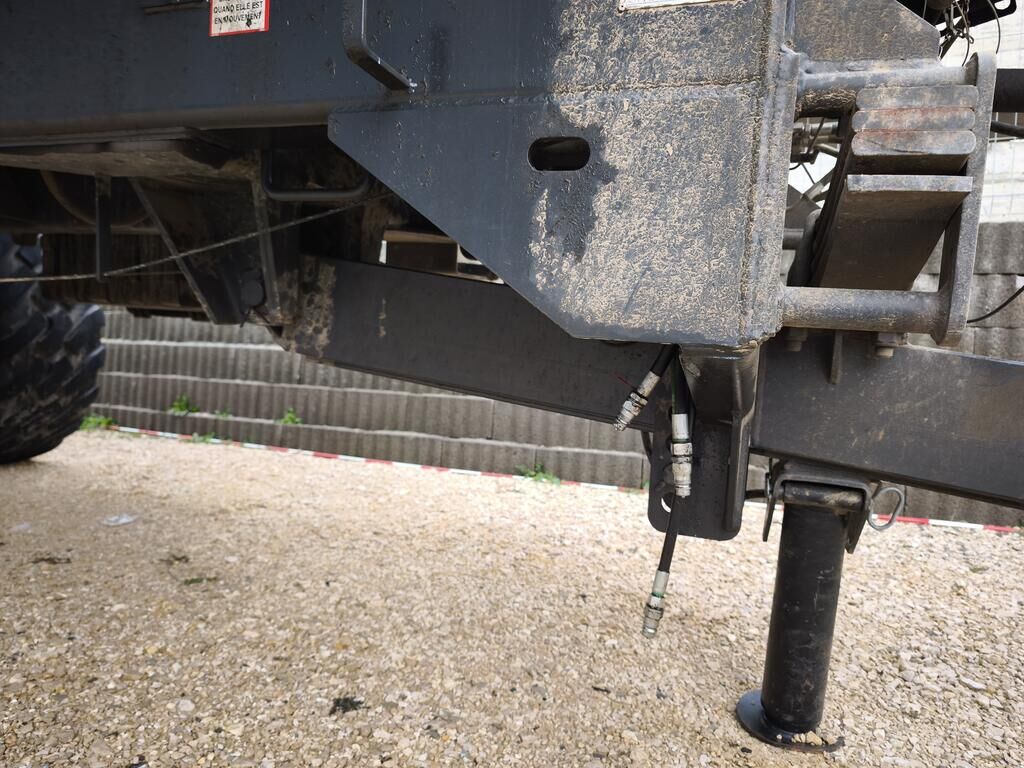 Timon, jante avant droite, flanc droite de la benne frotté et enfoncé, benne voilée et n’est plus d’équerre, charnière droite de ridelle arrière.