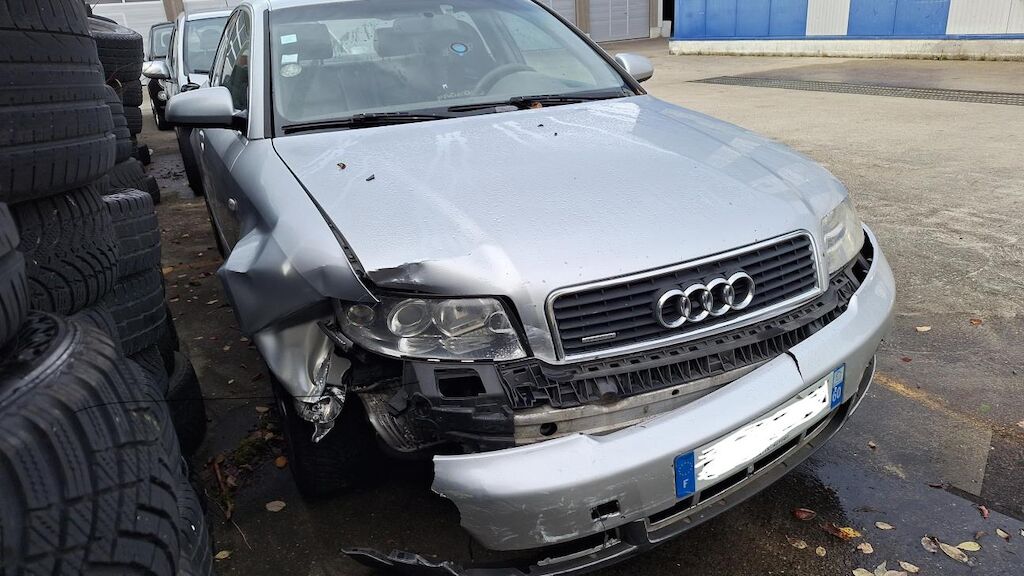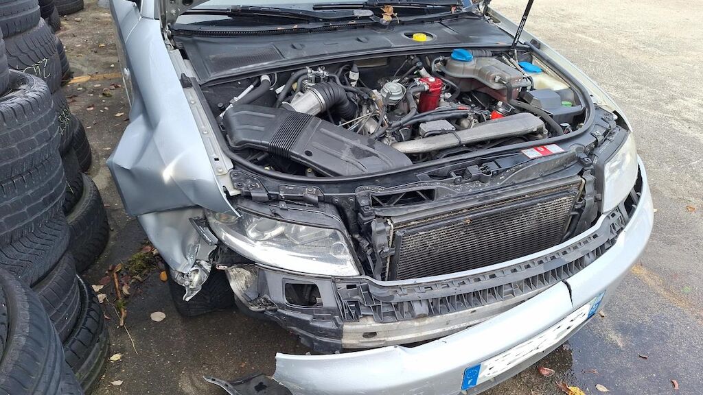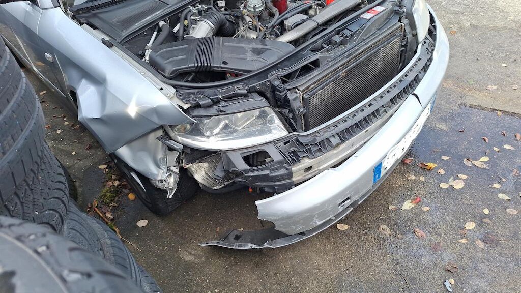Angle avant droit enfoncé, pare-chocs arrière endommagé, porte gauche, dommage total clair