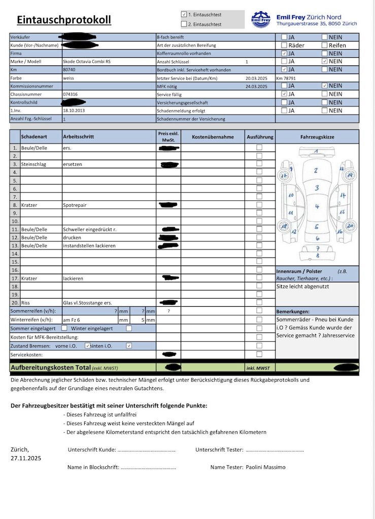 | Keine Gewähr auf die Angaben der Sonder- und Serienausstattung / keine mechanische Prüfung. Fahrzeug wurde unzerlegt expertisiert / keine Haftung für allfällige, nach Demontage bekanntwerdenden Mängel. Fahrzeugbereifung und Ausstattung gemäss Fotos / Fahrzeugkauf auf eigenes Risiko ab Platz ohne Nachwährschaft. DPF/FAP Filter nicht kontrolliert. Keine technische Prüfung (Werkstatttest) vorgenommen. Fahrzeug ab Platz, ohne Garantie und Aufbereitung. – Diverse Kratzer und Dellen am gesamten Fahrzeug – Glas vl. Stosstange ersetzten – Letzter Service 20.03.2025 bei 78791 KM |
