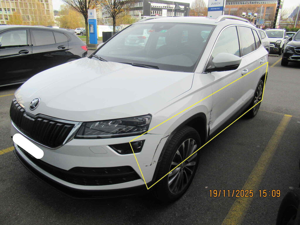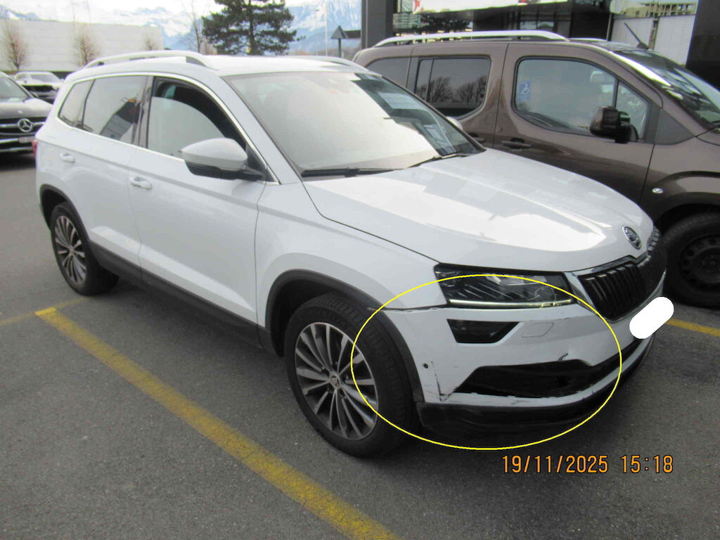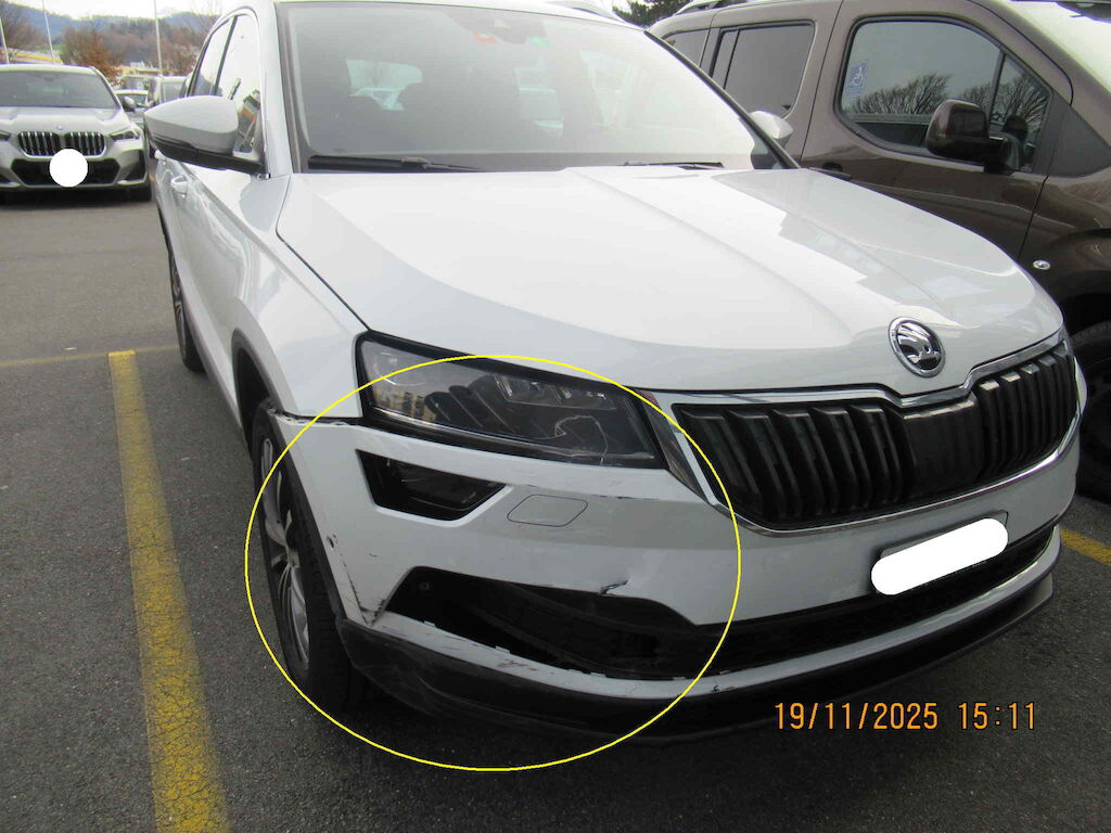Stossfänger, Scheinwerfer, Kotflügel vorne rechts. Kotfflügel, Türen, Kniestück/Seitenwand links, Felge vorne links und Stossfänger hinten links beschädigt