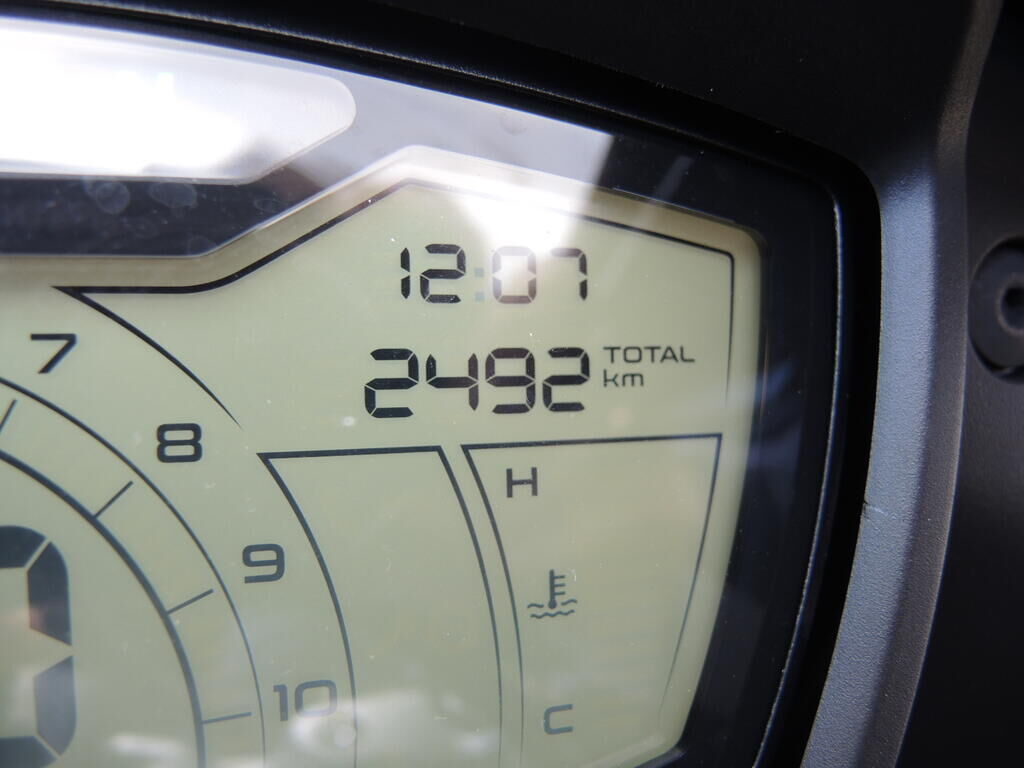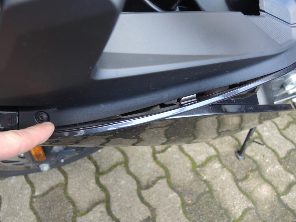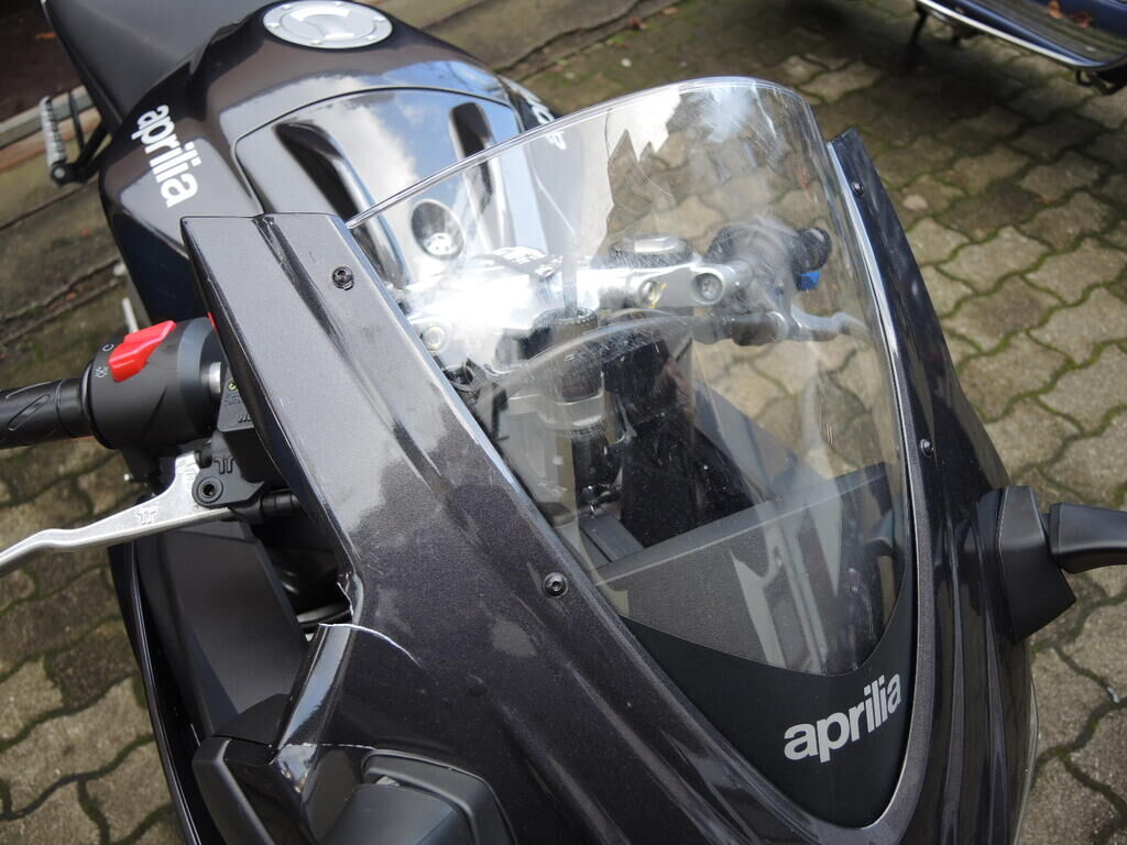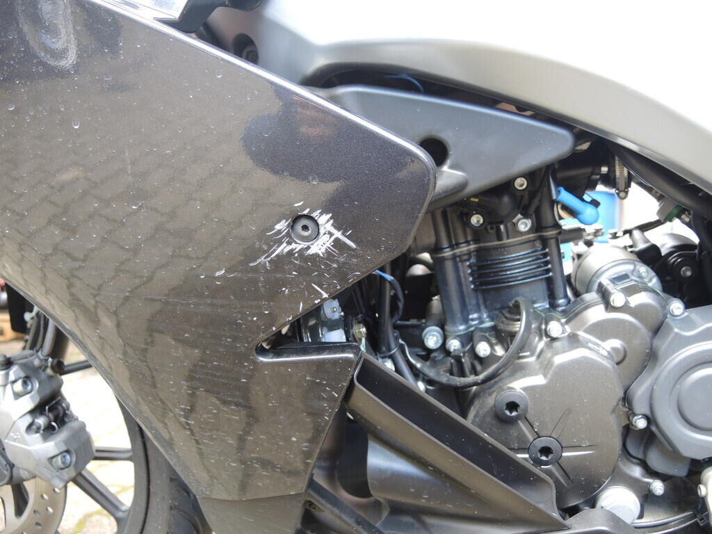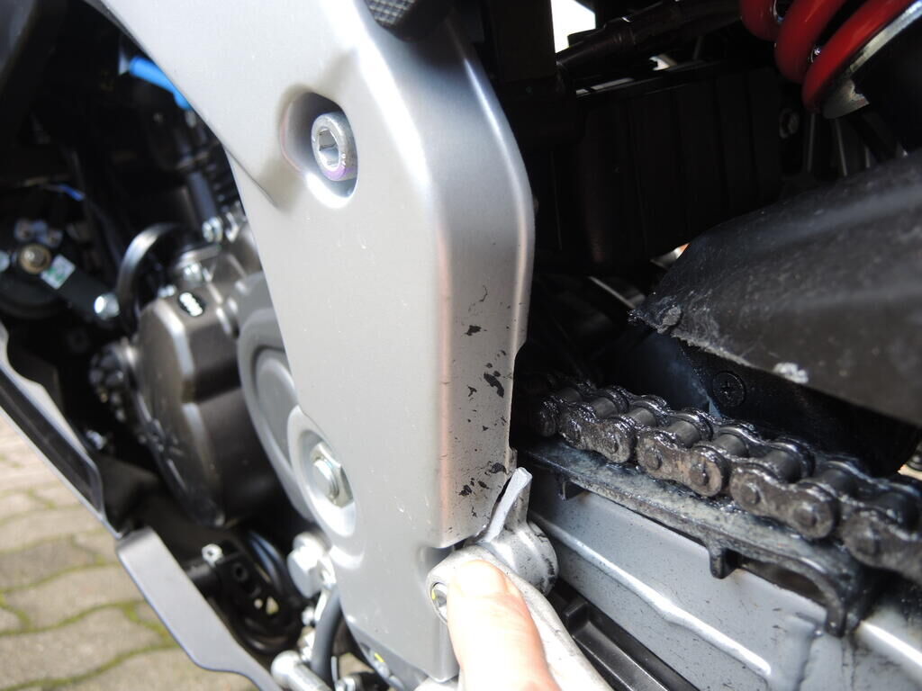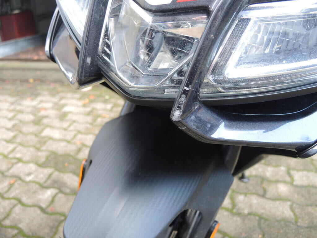 Front und Seitenverkleidung links zwerkratzt und gebrochen, Lenkergriffe und Fussrasten zerkratzt, Rahmen unten gebrochen, Seitenständer und Schwinge zerkratzt