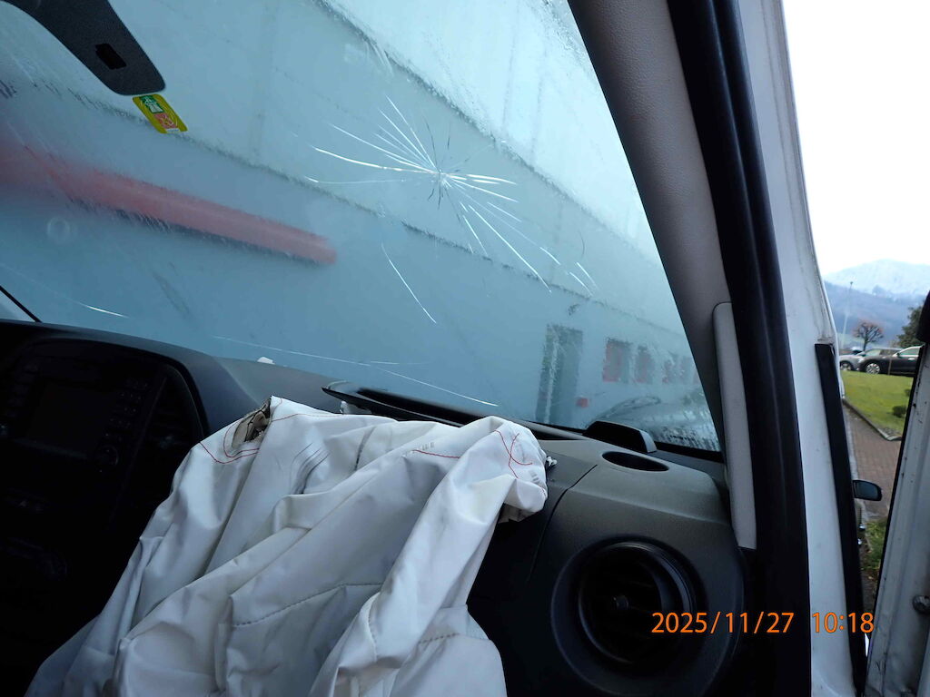Stossstange vorne, Frontscheibe, Felge und Reifen vorne rechts und Radaufhängung vorne rechts beschädigt. Fahrer und Beifahrerairbag ausgelöst. Gurtstraffer Fahrerseite ausgelöst.