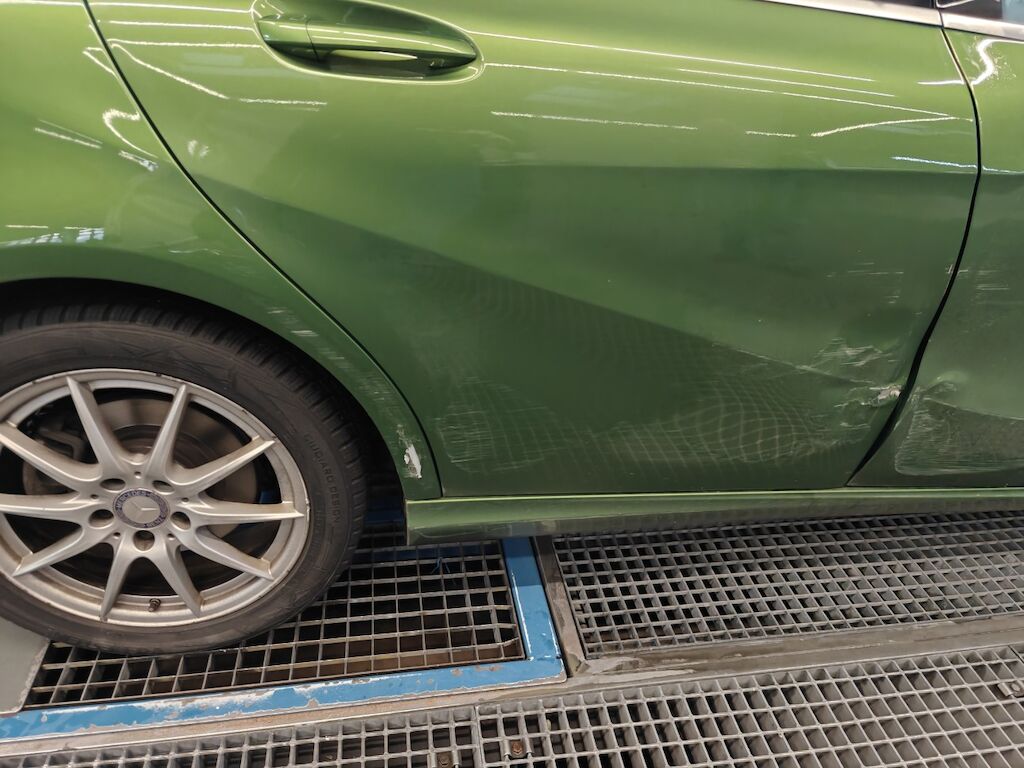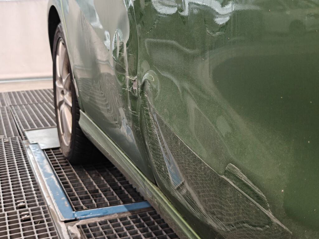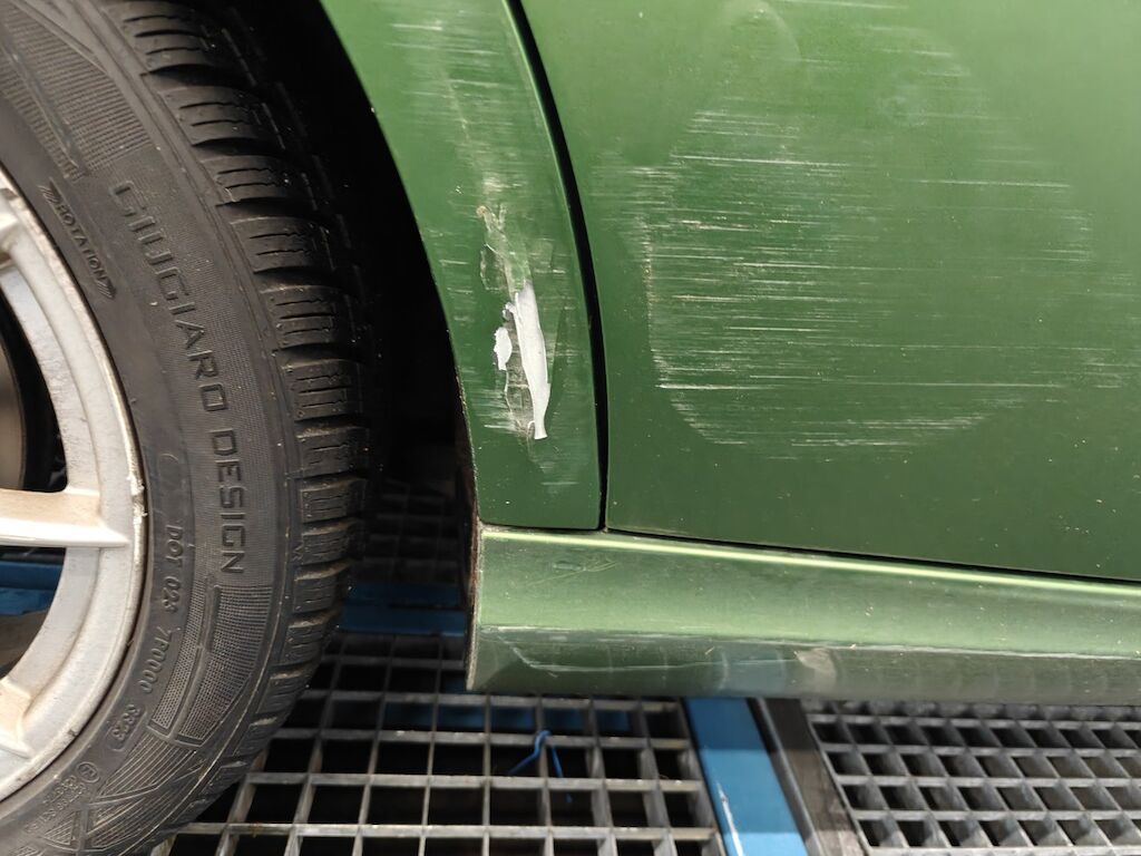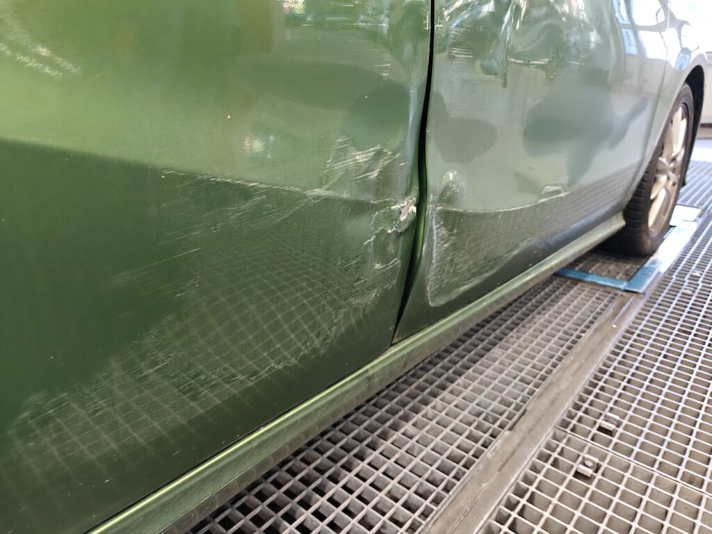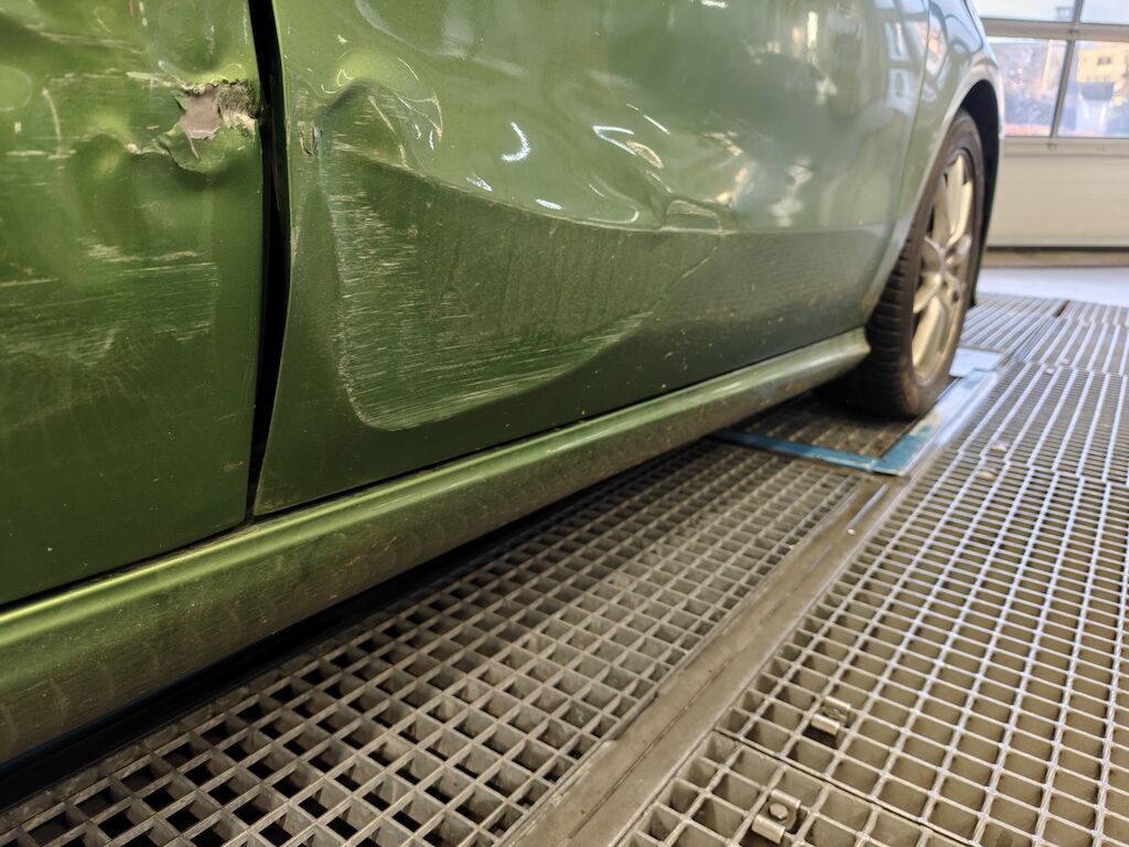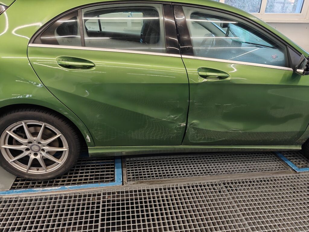 Der rechte Aussenspiegel, die vordere und hintere Türe, die Seitenwand, die Schwellerverkleidung sowie die hintere Felge sind beschädigt.