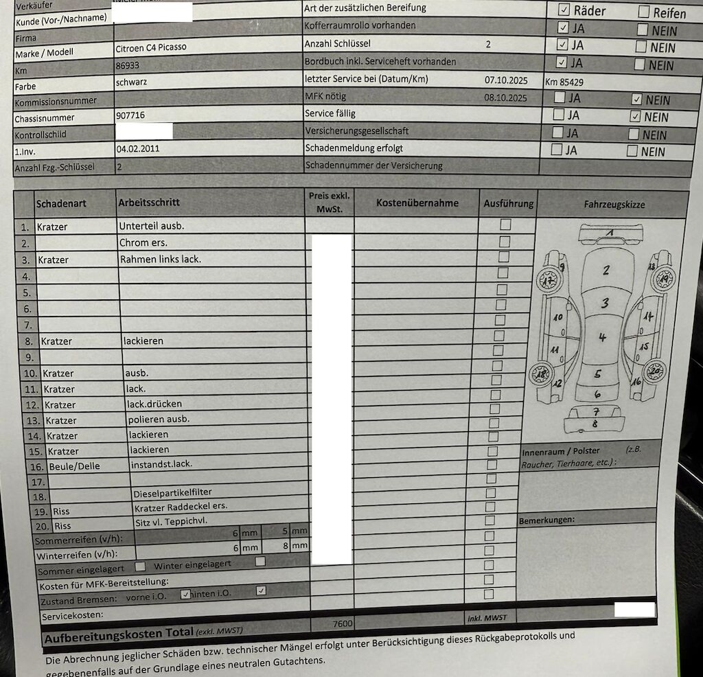 | Keine Gewähr auf die Angaben der Sonder- und Serienausstattung / keine mechanische Prüfung. Fahrzeug wurde unzerlegt expertisiert / keine Haftung für allfällige, nach Demontage bekanntwerdenden Mängel. Fahrzeugbereifung und Ausstattung gemäss Fotos / Fahrzeugkauf auf eigenes Risiko ab Platz ohne Nachwährschaft. DPF/FAP Filter nicht kontrolliert. Keine technische Prüfung (Werkstatttest) vorgenommen. Fahrzeug ab Platz, ohne Garantie und Aufbereitung. – Diverse Kratzer und Dellen am gesamten Fahrzeug – Letzter Service 07.10.2025 bei 85429 KM |