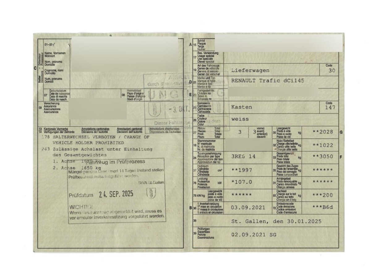 Brauchbare Teile: Interieur vorne teilweise Motor läuft Laderaum: Diverses beschädigtes Malermaterial, Farbbehälter usw. ( Farbe ausgelaufen) Die (vom Fahrzeugexperten) ermittelten Reparaturkosten beziehen sich auf das versicherte Ereignis. Allfällige zusätzliche, nicht versicherte Schäden/Vorschäden, sind in den Reparaturkosten nicht enthalten. Die deklarierten Ausstattungsmerkmale können von der effektiven Ausstattung abweichen. Achtung Bei einem Hochvoltsystem – Spannungsfreiheit prüfen. Sicherheitshinweise und Betriebsanleitungen des Herstellers konsultieren und befolgen. |