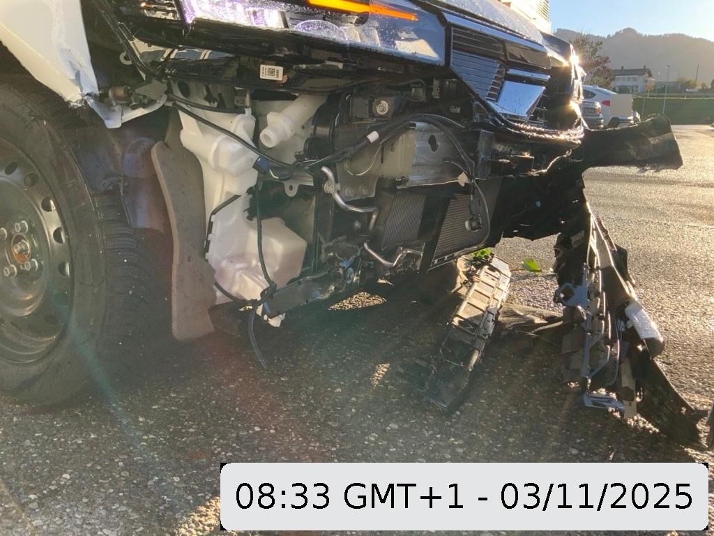 Achsträger, Auspufftopf, Federbein vorne links, Federbein vorne rechts, Front, Front rechts, Frontblech, Klimakühler, Kotflügel rechts, Kühler, Kühlgitter, Querträger, Rad vorne rechts, Radhaus vorne rechts, Scheinwerfer rechts, Seitenwand rechts, Stosstange vorne, Wagenboden, Ölwanne