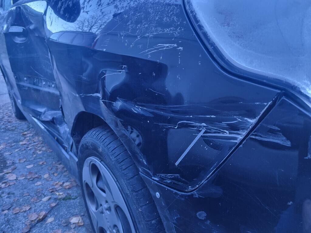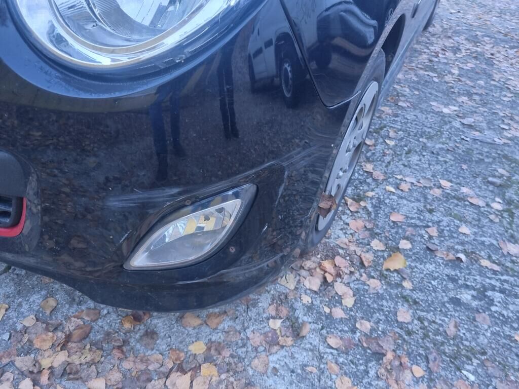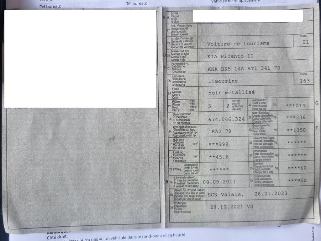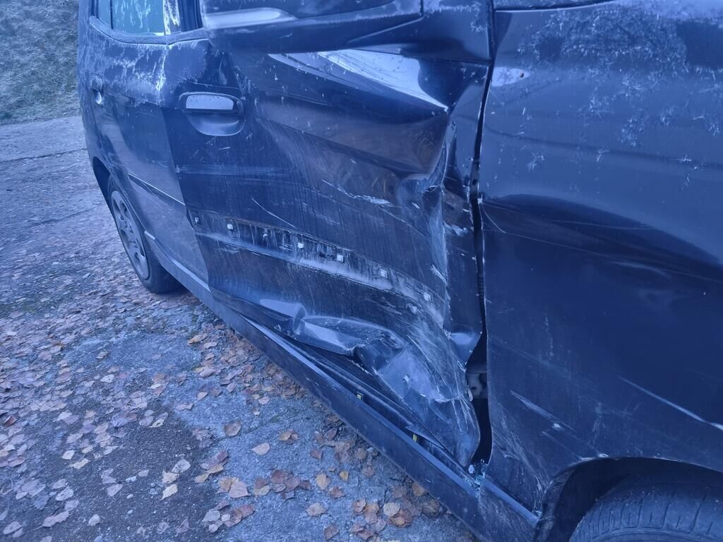 Pare-chocs avant griffé, aile avant droite, porte avant droite, pied avant droit et bas de caisse droit enfoncés, panneau de porte avant droit et rétroviseur droit cassé, risque sur suspension avant droite.