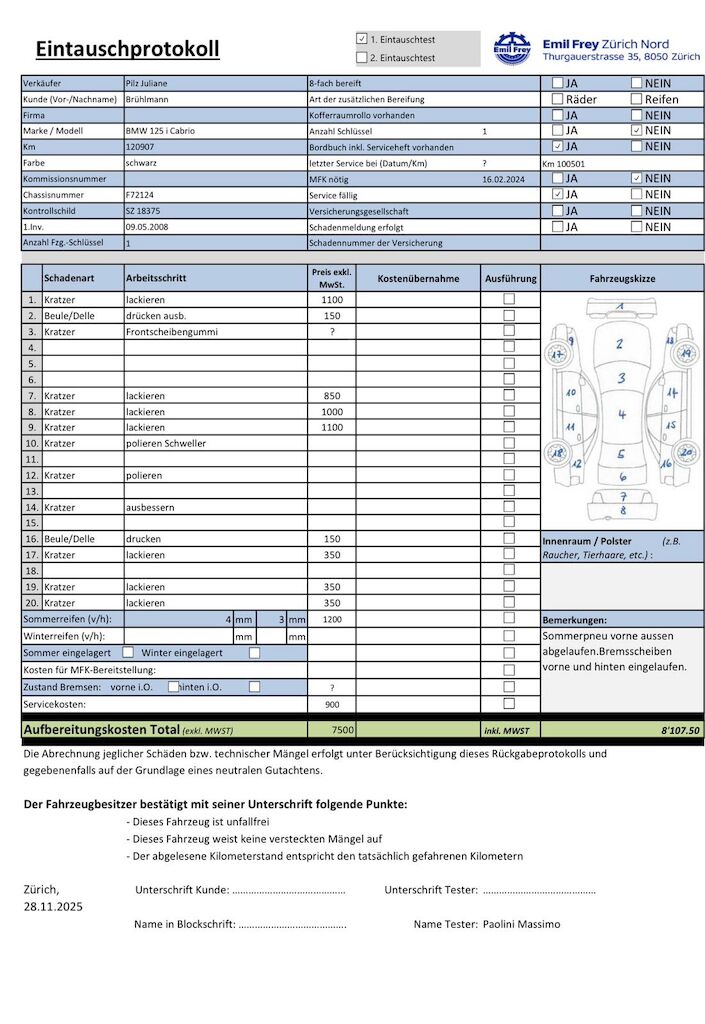 | Keine technische Prüfung (Werkstatttest) vorgenommen Diverse Schäden an Karosserie/Lack. Fahrzeug ab Platz, ohne Garantie und Aufbereitung. DPF/FAP Filter nicht kontrolliert Keine Gewähr auf die Angaben der Sonder- und Serienausstattung / keine mechanische Prüfung. Fahrzeug wurde unzerlegt expertisiert / keine Haftung für allfällige, nach Demontage bekanntwerdenden Mängel. Fahrzeugbereifung und Ausstattung gemäss Fotos / Fahrzeugkauf auf eigenes Risiko ab Platz ohne Nachwährschaft. – Div. Kratzer und Dellen am gesamten Fahrzeug. – Kratzer am Frontscheibengummi – Letzter Service bei 100501 KM |