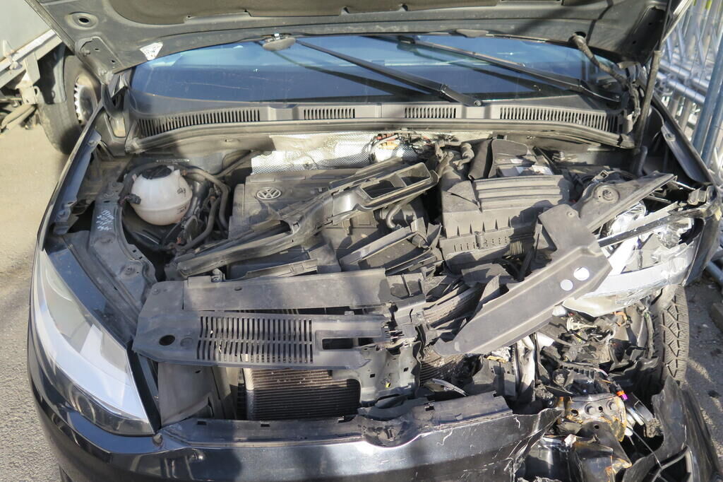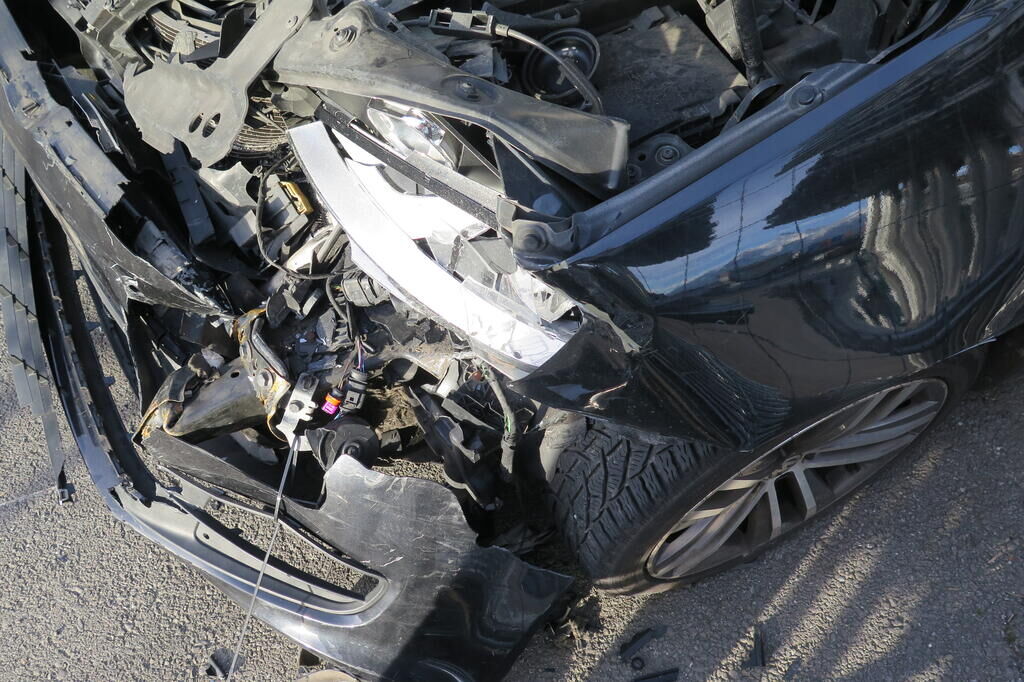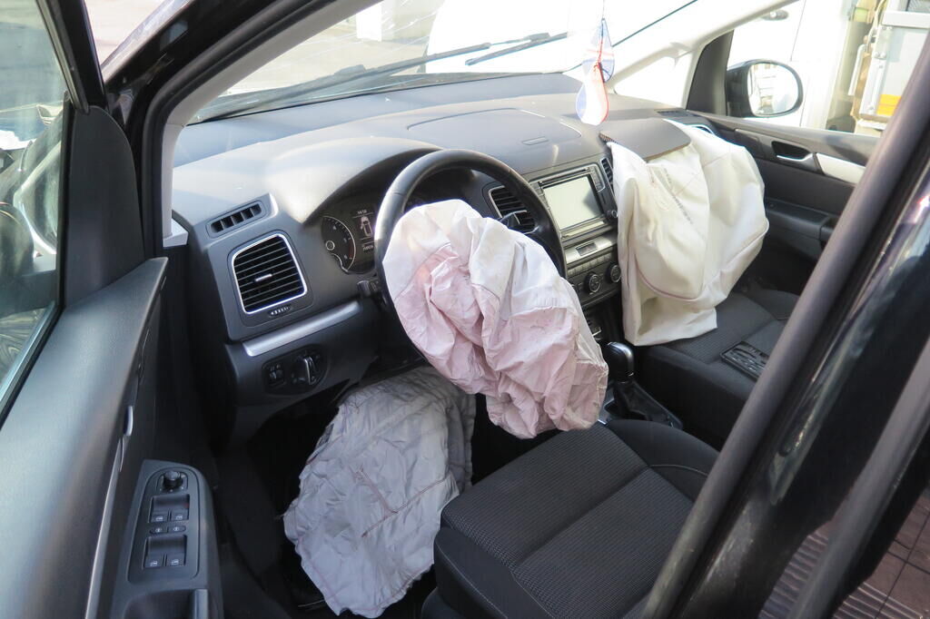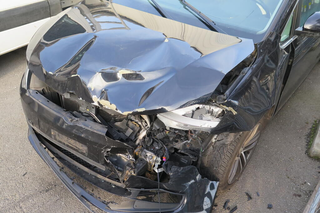 Bloc avant fortement enfoncé, armatures intérieures refoulées, suspension avant gauche refoulée, pare-brise cassé, airbags déployés, divers garnissages et accessoires cassés.