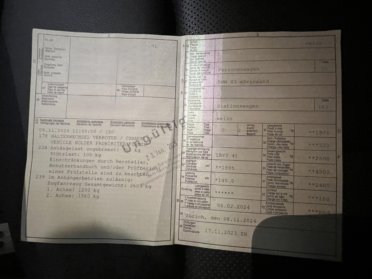 Hill Descent Control (HDC), Licht: Heckleuchten in LED-Technik – einteilige LED-Heckleuchten mit Rauchglas Komponenten – Heckleuchte mit Schlusslicht, Bremslicht, Fahrtrichtungsanzeiger (LED-Technologie), Servotronic, Assist: Active Guard – Frontkollisionswarnung mit Bremseingriff (Radfahrer- und Personenwarnung), Assist: Geschwindigkeitsregelung mit Bremsfunktion und Speed Limiter, Sitze: Ausführung 5 Sitzplätze, Media: USB-Anschluss, Bordcomputer, Media: DAB+ Tuner, Licht: LED Scheinwerfer, Regensensor und automatische Fahrlichtsteuerung, Veloursfussmatten, Media: BMW Live Cockpit Plus – Zentrale Informationsanzeige (CID) mit 10,25″ Display und Touchfunktionalität – Analoges Instrumenten-Cluster mit 5,1″ Display – Freisprecheinrichtung mit USB-Schnittstelle – Radio, MP3-Player und RDS-Doppeltuner – Navigationssystem – iDrive Controller mit Touchfunktion – Intelligente Sprachbedienung – 2 USB-Anschlüsse – Bluetooth/WiFi-Schnittstelle zur kabellosen Verbindung – 4G LTE Connectivity: festverbaute SIM-Karte mit 4G Netz, Scheibenwaschdüsen beheizt, Paket: Innen- und Aussenspiegelpaket, Start/Stop-Funktion, Armauflage vorn und hinten, in Türverkleidung integriert, Airbag: Knie-Airbag für Fahrer und Beifahrer, Antiblockiersystem (ABS), Assist: Passiver Fussgängerschutz, Intelligenter Notruf, Räder: Reifendruck-Kontrollanzeige, Wärmeschutzverglasung, Assist: Dynamische Traktionskontrolle (DTC), Licht: LED-Tagfahrlicht, BMW Mobile Care, Räder: Radschraubensicherung, Airbag: Seitenairbag für Fahrer und Beifahrer, BMW Service Plus, Paket: Connected Package Professional, Licht: Begrüssungslicht, Getriebe: 8-Stufen-Automat Steptronic, Seitenaufprall-Schutzsystem, Assist: Park Distance Control vorne und hinten, Wegfahrsperre elektronisch, Beide Make up-Spiegel beleuchtet, Gepäcktrennnetz, Sitze: Rücksitzlehne, umklappbar, 40:20:40-Teilung, Grösserer Kraftstofftank Mehrinhalt ca. 8 Liter, Teleservices, 3-Punkt-Sicherheitsgurte auf allen Plätzen, Assist: ATTENTION ASSIST (Aufmerksamkeits-assistent), Assist: Crash-Sensor, Warndreieck mit Erste-Hilfe-Set, Fensterheber, elektrisch – Einklemmschutz und Komfortöffnung/-schließung, Steckdose 12V, Dekor: Interieurleisten schwarz hochglänzend mit Akzentleisten Perlglanz Chrom, Sitze: Kindersitzbefestigung ISOFIX, äussere Fondsitze, Lenkrad: Lenkrad längs- und höhenverstellbar, Dachreling Aluminium satiniert, Media: ConnectedDrive Services – Beinhaltet die kostenlose Nutzung von Fahrzeug Apps über BMW Online (inkl. Zugriff auf Wetterinformationen, Nachrichten, Adresssuche etc.) für 3 Jahre – Registrierung erforderlich für personalisierbare Dienste – Der Dienst BMW Online ist ab 2 Wochen vor Ablaufdatum via BMW ConnectedDrive Store kostenpflichtig verlängerbar, Klima: Klimaautomatik – 3-Zonen-Klimaautomatik mit erweiterten Umfängen – Soll-Temperaturregelung sowie Einstellung von Luftmenge und Luftverteilung für Fahrer und Beifahrer getrennt einstellbar. – Temperierung Belüftung Oberkörper über MMI für Fahrer/Beifahrer getrennt einstellbar. – Individuelle Automatik-Regelung mit 5 Intensitätsstufen für Fahrer/Beifahrer getrennt einstellbar. – SYNC-Funktion: Fahrereinstellung gelten für den gesamten Fahrzeuginnenraum. – Digitales Display Mittelkonsole hinten, Innenbeleuchtung, Allradantrieb permanent, Airbag: Kopfairbag 1. und 2. Sitzreihe, Parkbremse, elektromechanisch, BMW Garantie: Repair Inclusive – 3 Jahre/100.000 km Gültigkeit: 3 Jahre oder 100.000 Kilometer – es gilt das zuerst Erreichte, Türen: Automatische Heckklappenbetätigung, Schliessystem mit Zentralverriegelung inklusive 2 Fernbedienungen mit integriertem Schlüssel, Dynamische Stabilitätskontrolle (DSC), Airbag: Airbag Beifahrer deaktivierbar, Lackierung: Uni-Lackierung, Nichtraucherausführung, Einstiegsschienen, Bremsenergie-Rückgewinnung, Airbag: Airbag Fahrer und Beifahrer, Bremsbelag-Verschleissanzeige, Räder: 18″ Leichtmetallräder V-Speiche 618 Reflexsilber 7 J×18/Bereifung 225/60 R 18, Sitze: Sportsitze vorne, Aussenspiegel rechts und links beheizt und elektrisch verstellbar, asphärisch gewölbtes Spiegelglas, Partikelfilter und Oxydationskatalysator, Multifunktionales Instrumentendisplay, Leuchtweitenregulierung, Lenkrad: Sport-Lederlenkrad, Innenspiegel automatisch abblendbar, Licht: LED Nebelscheinwerfer, Assist: Parking Assistant Kamera- und ultraschallbasiertes Assistenzsystem bestehend aus: – Park Distance Control (PDC) – Rückfahrkamera – Active Park Distance Control – Parkassistent – Rückfahrassistent – Einparkhilfe Seite