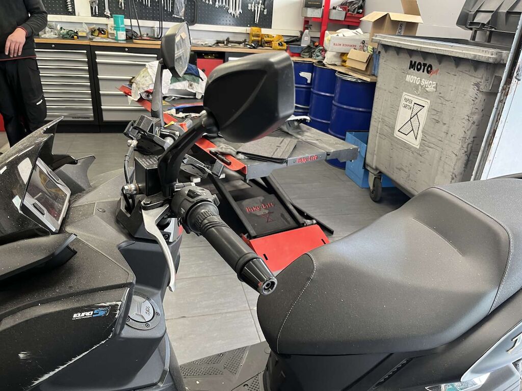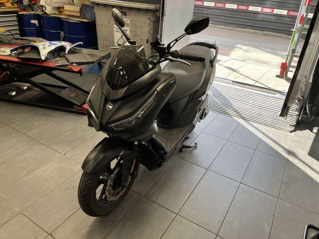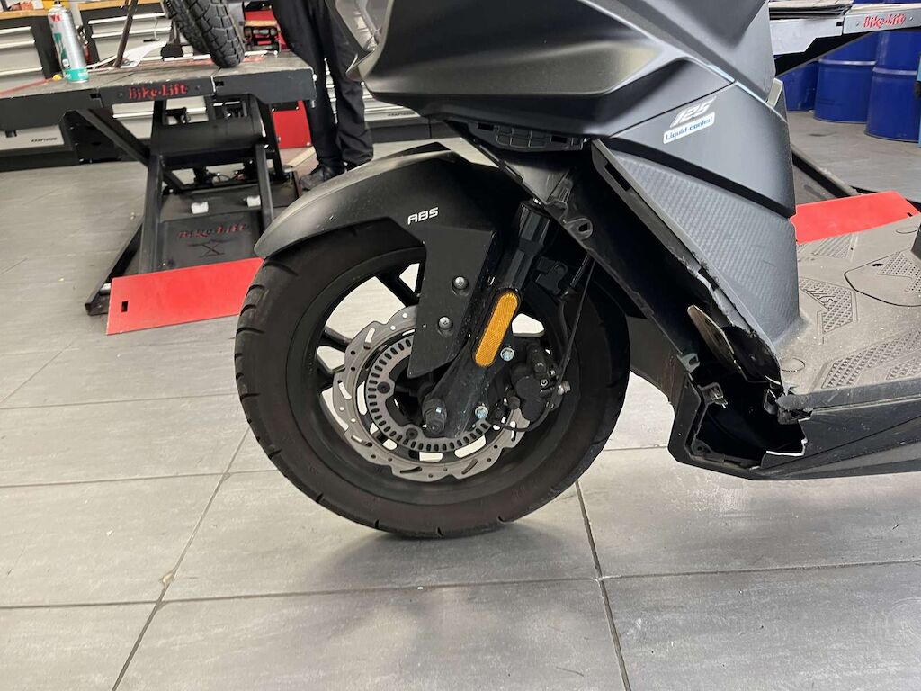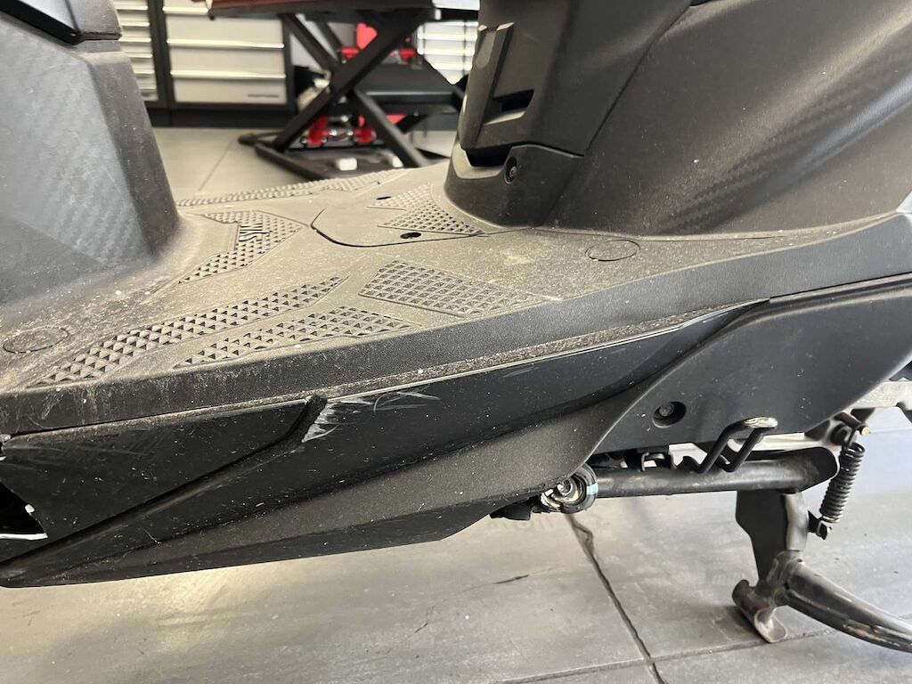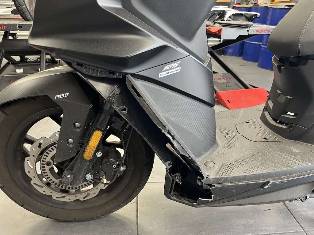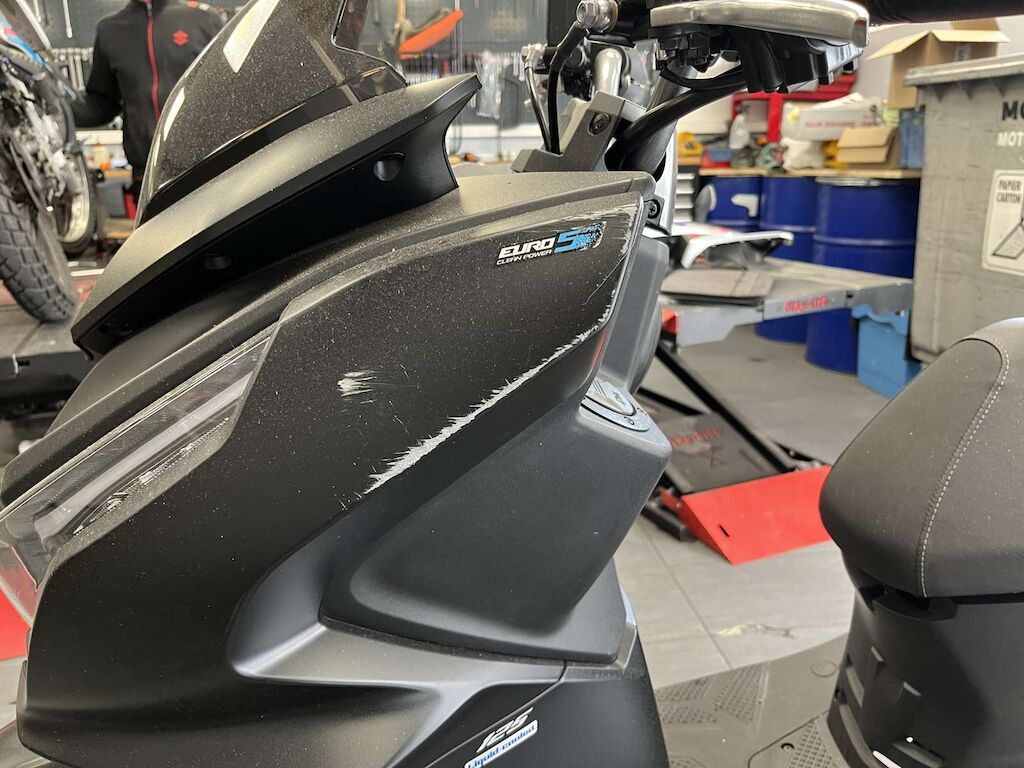 Carénage avant gauche, bas de caisse tablier intérieur, levier de frein, embout de guidon, rétroviseur, béquilles, carter variateur, boite à air, carénage arrière gauche endommagés et râpés.