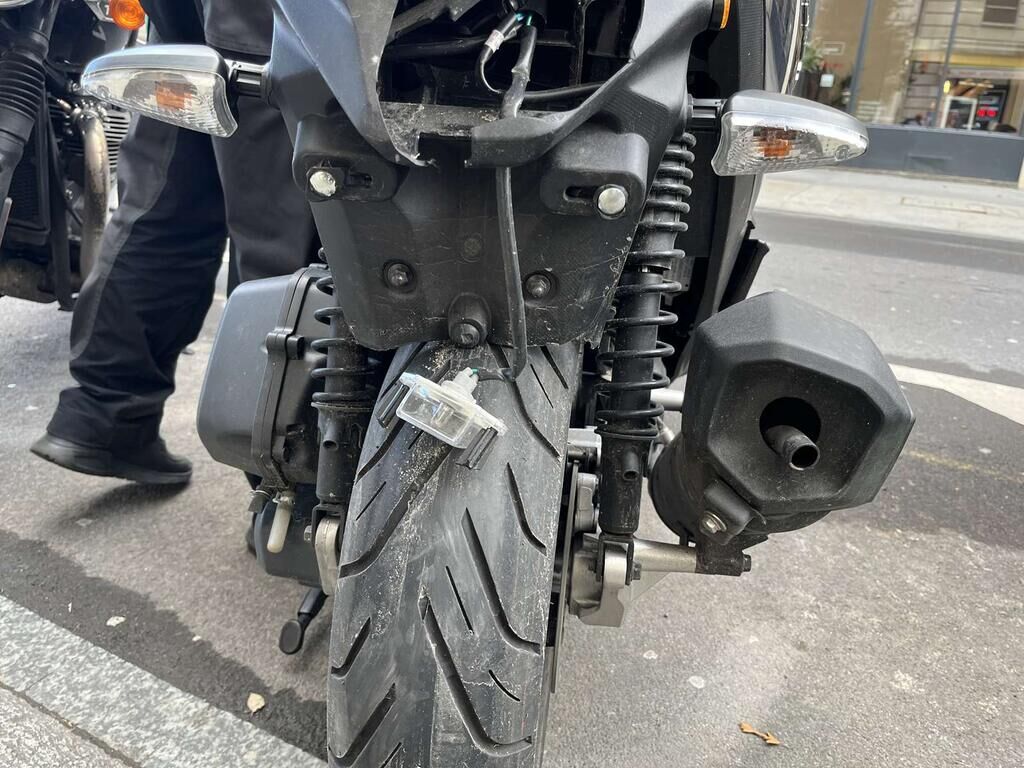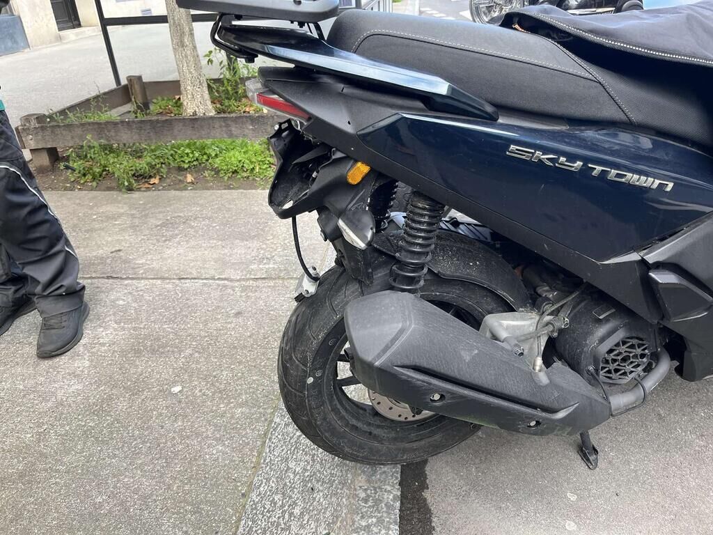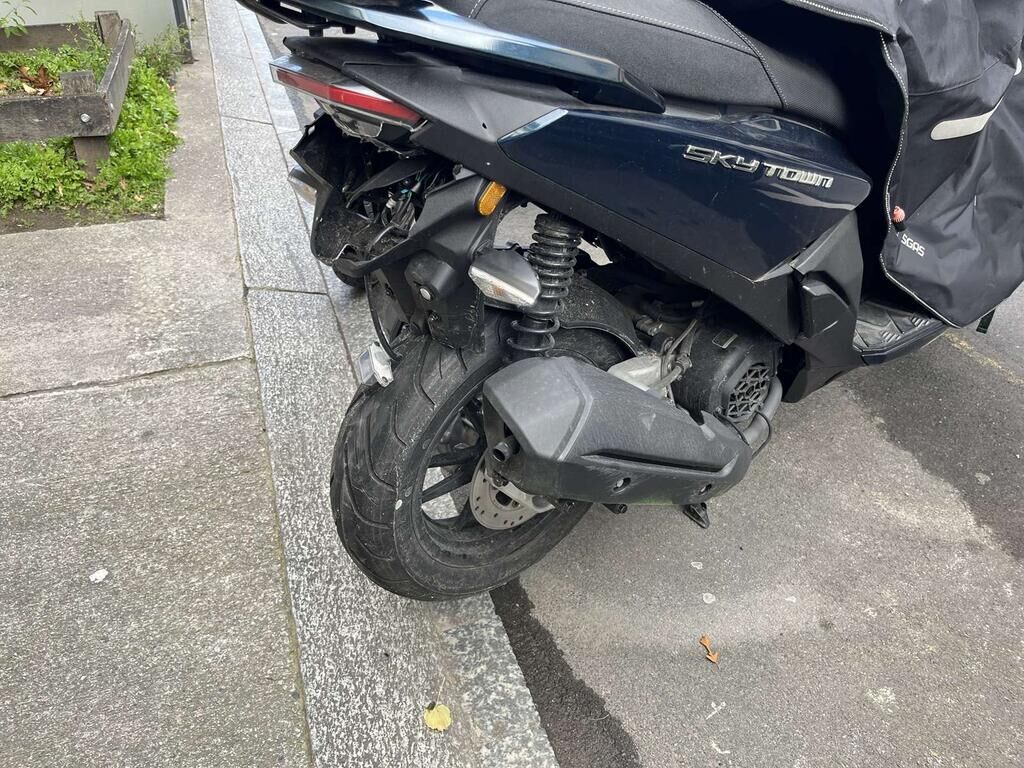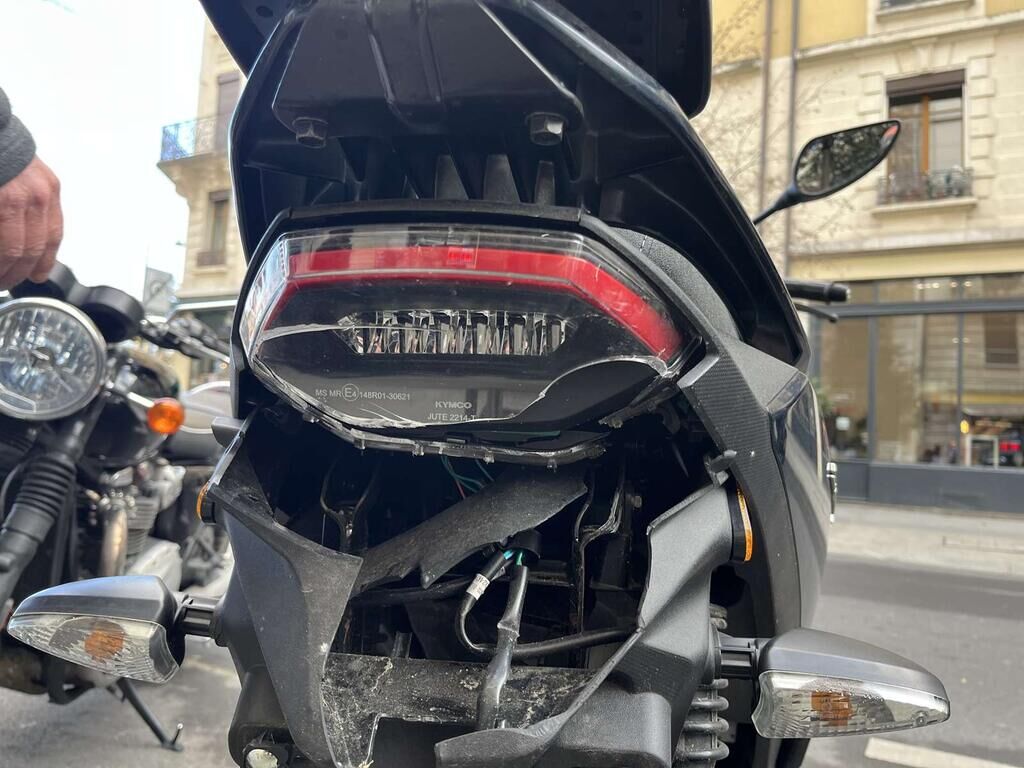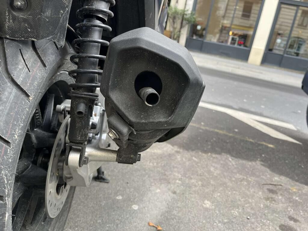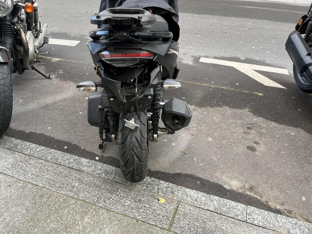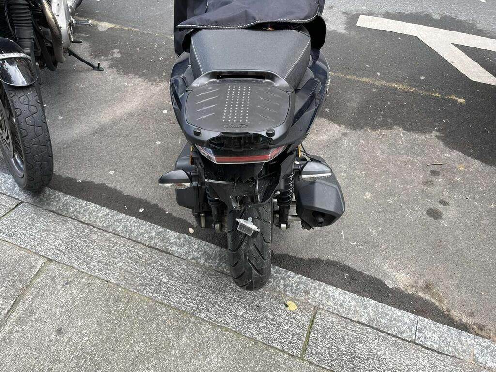 Choc arrière et chute côté droit: Pare-boue arrière, support de plaque. feu arrière, amortisseur arrière, échappement, top-case, support top-case, rétroviseur, levier de frein, embout de guidon, carénage avant droit, couverture, pare-boue avant, bas de caisse, repose pied, béquilles endommagés et cassés.