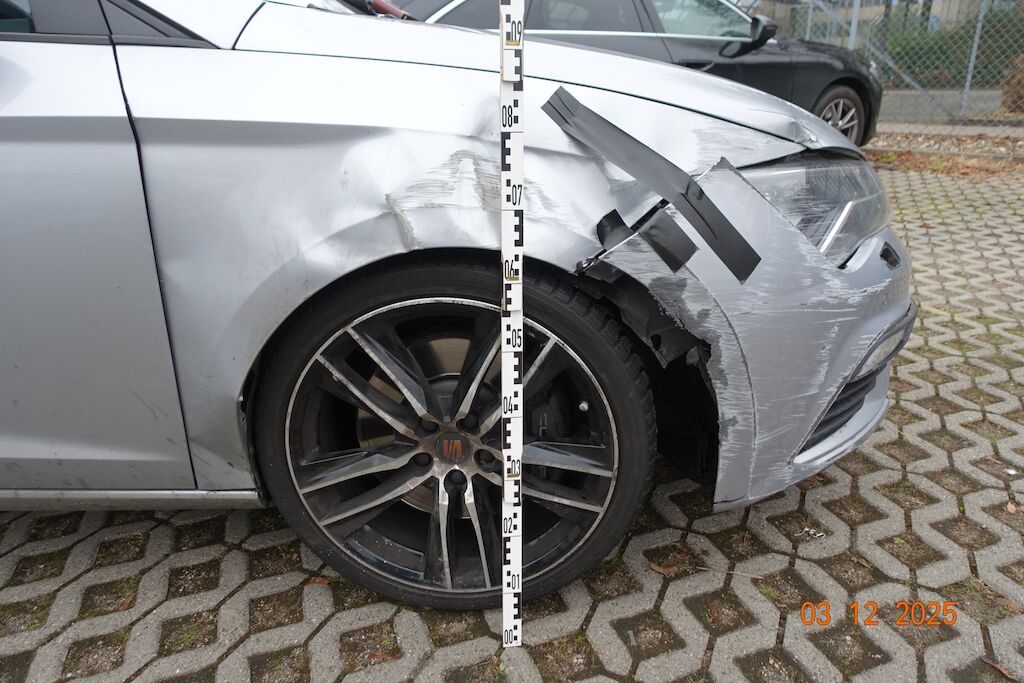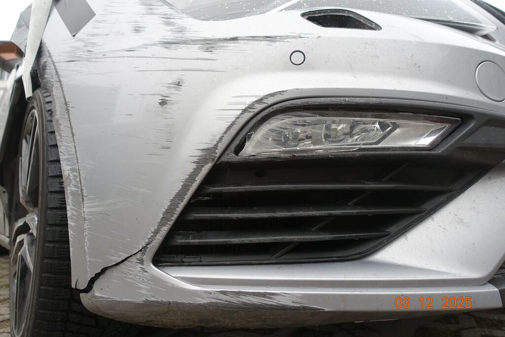 Der Kotflügel sowie der Scheinwerfer/Zusatzkühler/Motorhaube/Achshälfte VR sind beschädigt. Des Weiteren ist an der Seitenwand HR sowie an der Stossstange HR ebenfalls eine Beschädigung sichtbar.
