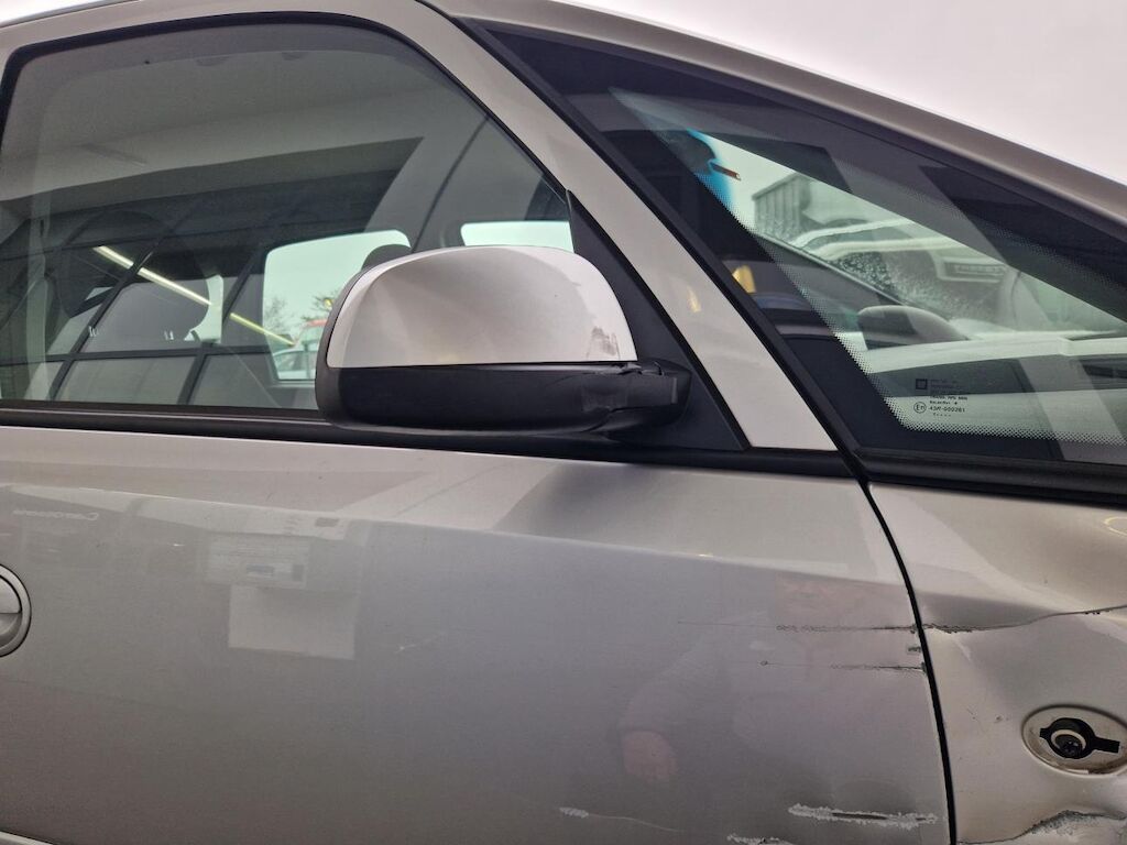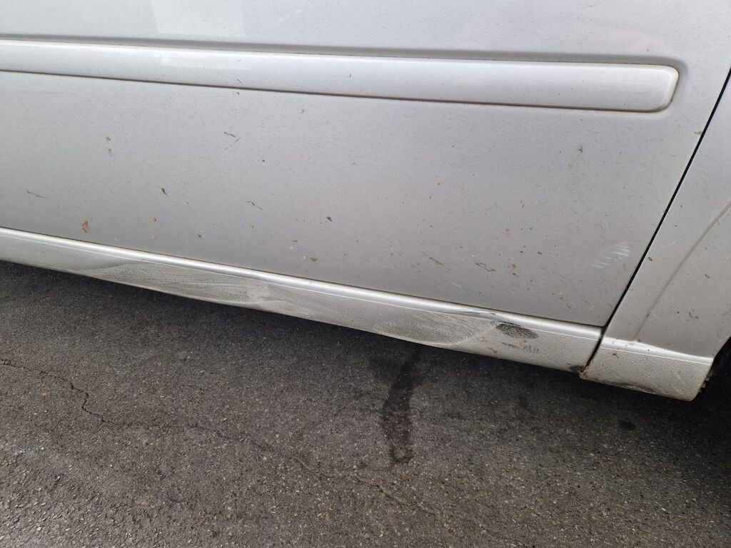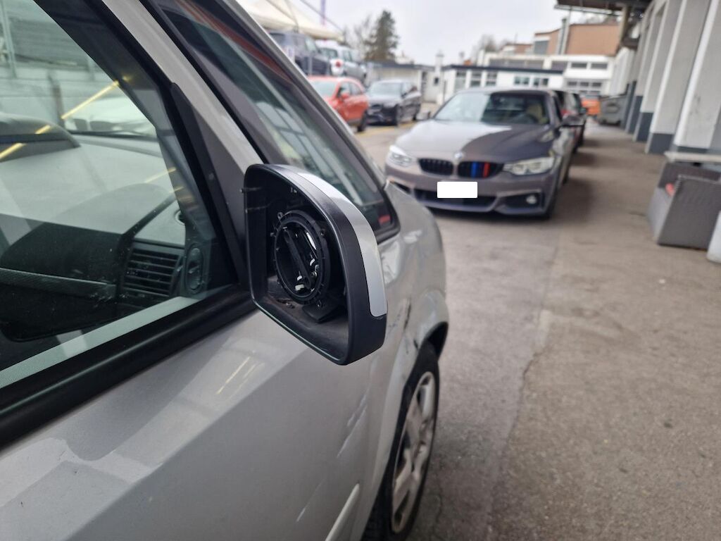 Stossfängerabdeckung vorne, Kotflügel, Raddeckel vorne, Türen vorne und hinten, Rückspiegel, Schweller, Seitenwand hinten, Felge, Raddeckel und Reifen hinten beschädigt.